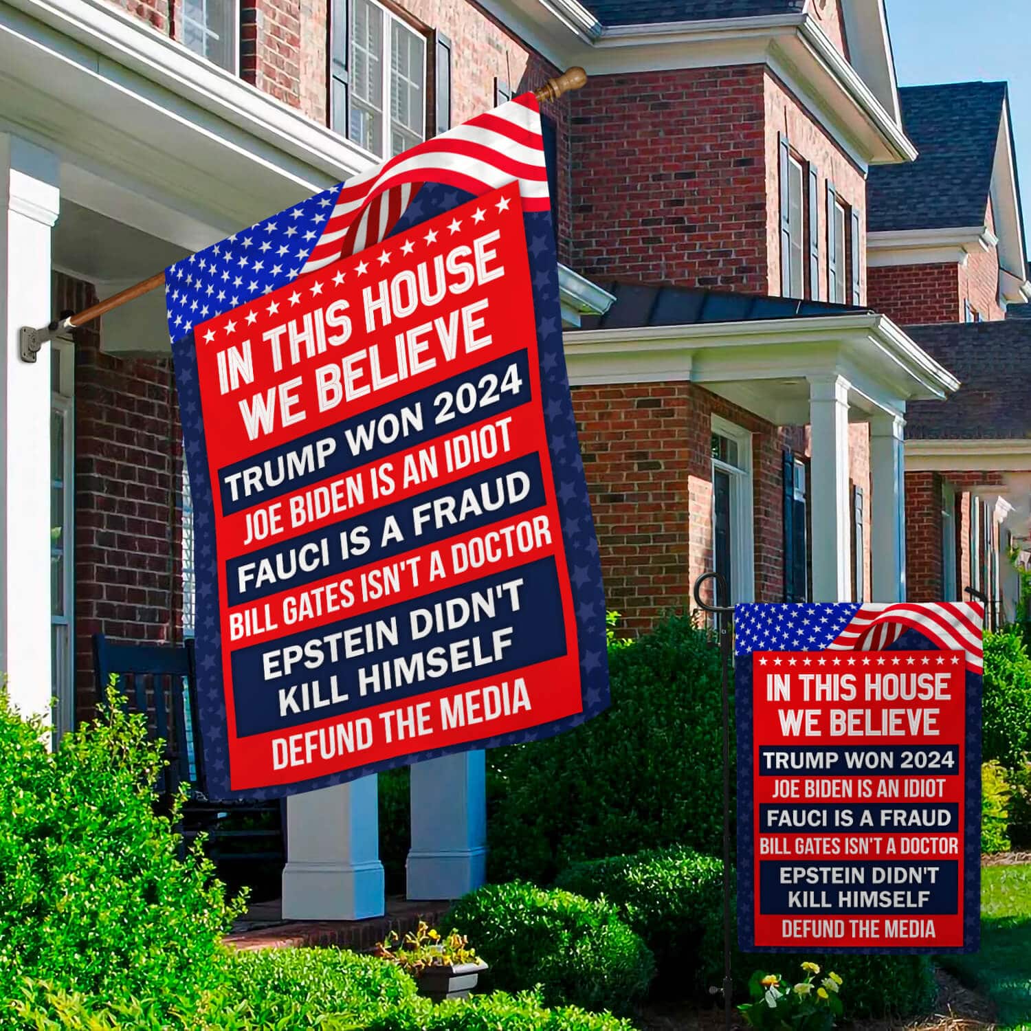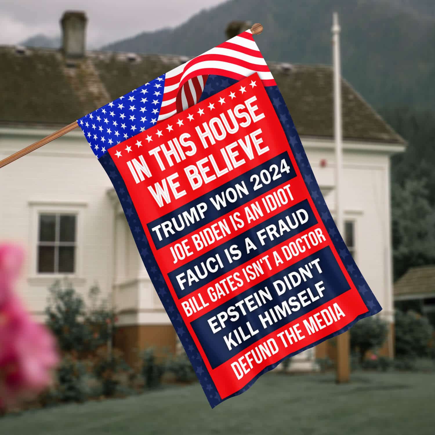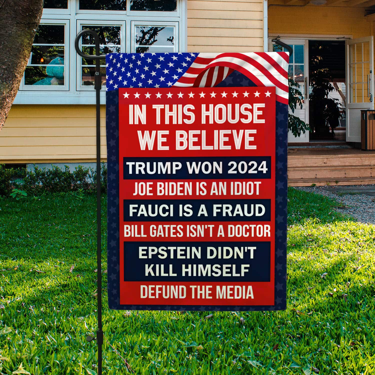 Are you spending too much time to find creative merchandise for you or suitable & special gifts for your mommy, your daddy, your son, your daughter, your children, your friends or someone you love? The struggle is over because we have various In This House We Believe Trump Won, In This House We Believe Trump Won Flag, Joe Biden Is An Idiot Flag, Fauci Is A Fraud, Bill Gate Isn’t A Doctor, Epstein Didn’t Kill Himself, Defund the Media, Pro Trump Flag, Trump Won 2024 Flag, Anti Biden Flag which will make perfect presents for your beloveds. In order to make your present stand out, we have created lots of unique and awesome customized photo gifts & personalized designs.