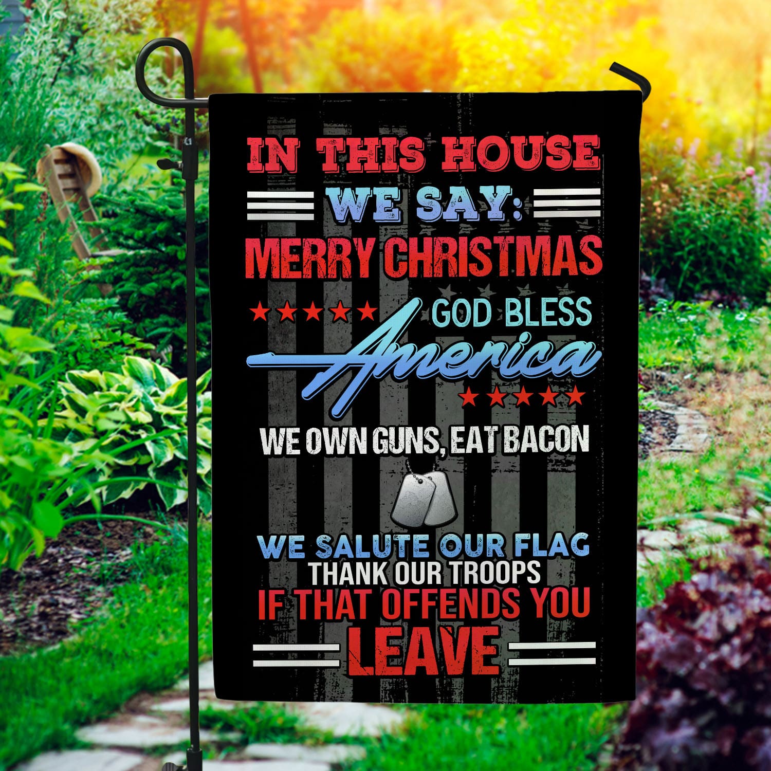 Are you spending too much time to find creative merchandise for you or suitable & special gifts for your mommy, your daddy, your son, your daughter, your children, your friends or someone you love? The struggle is over because we have various In This House We Say Garden Flag, In This House We Believe Garden Flag, In This House We Say Merry Christmas, God Bless America Flag, Thank You Our Troops Flag, Notice This Place Is Politically Incorrect We Say Merry Christmas, Patriotic Garden Flag, Conservative Flag, in This Place We Always Salute Our Flag which will make perfect presents for your beloveds. In order to make your present stand out, we have created lots of unique and awesome customized photo gifts & personalized designs.
