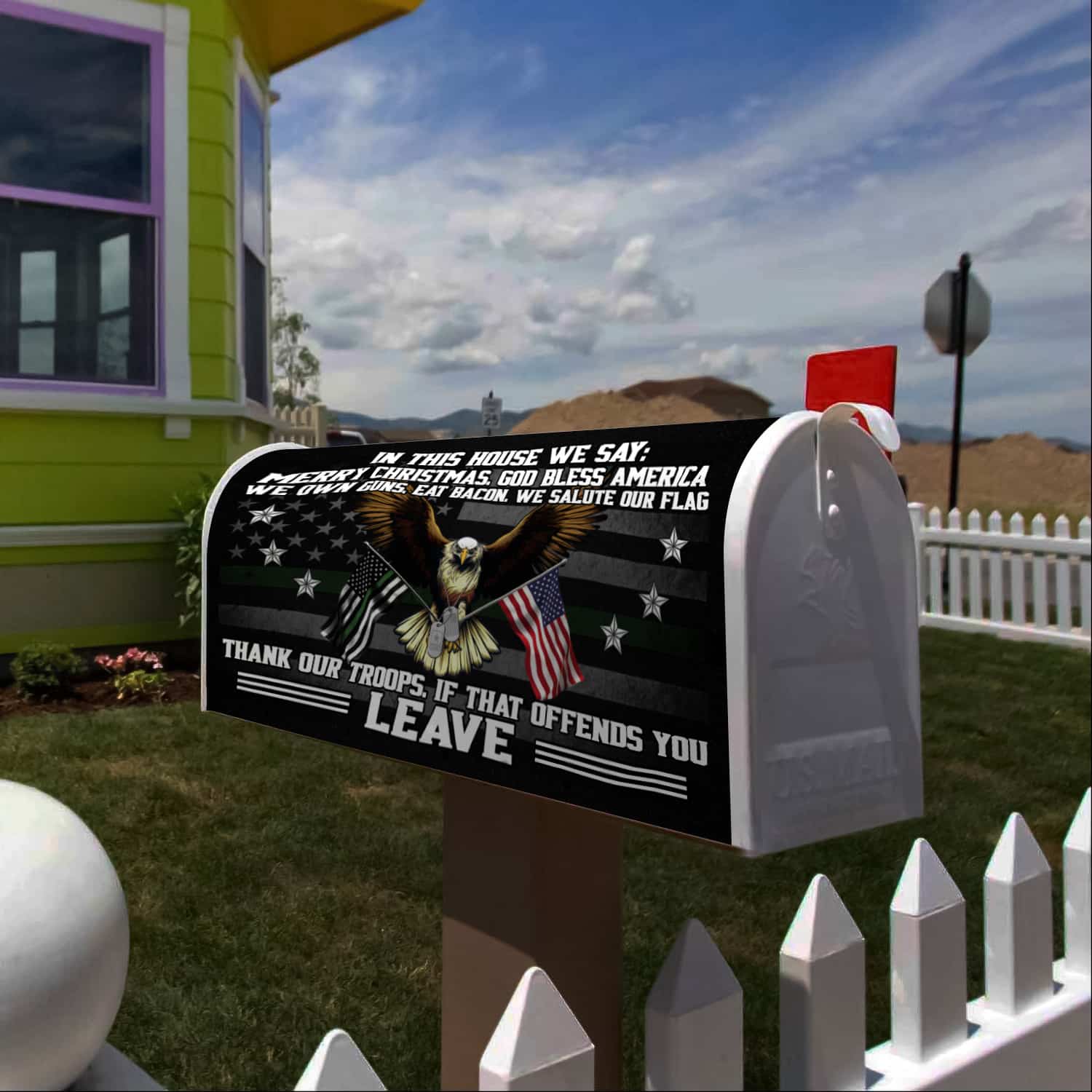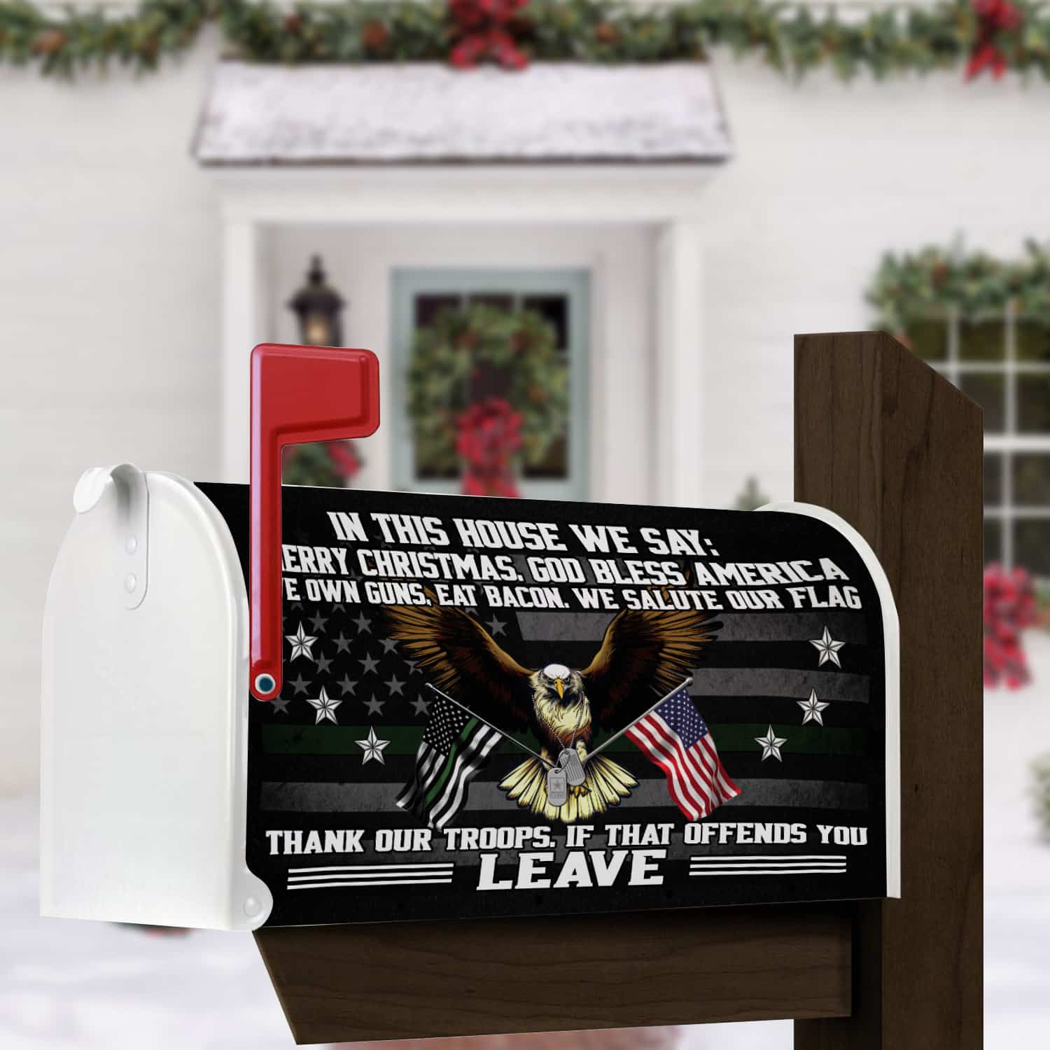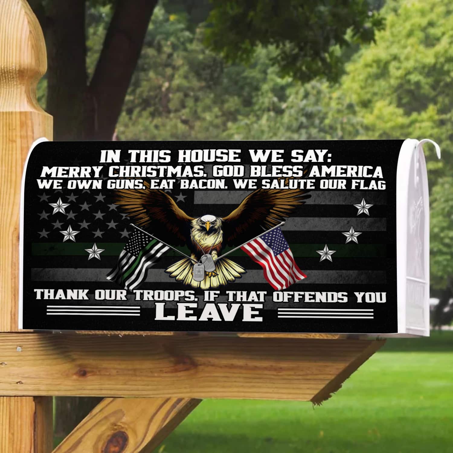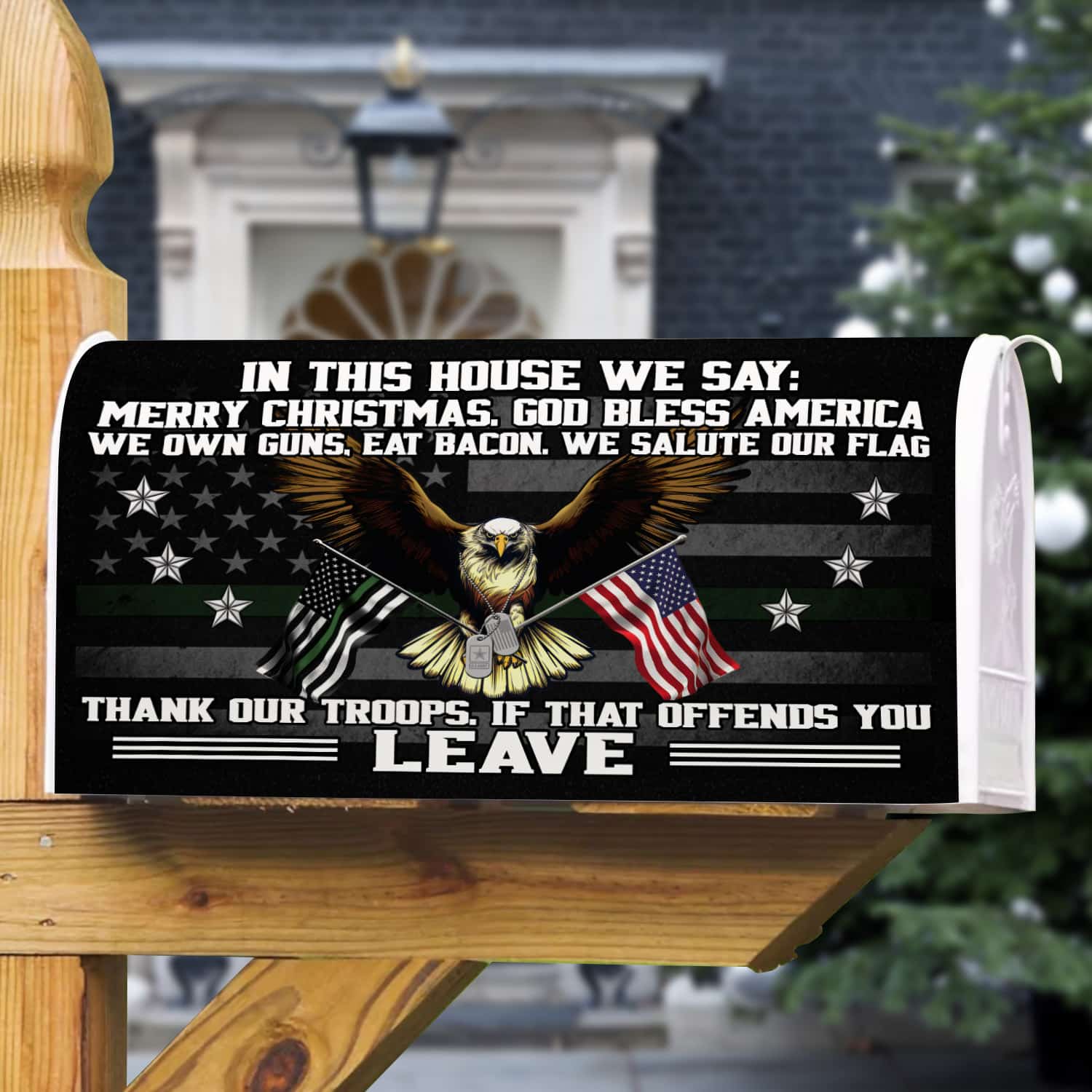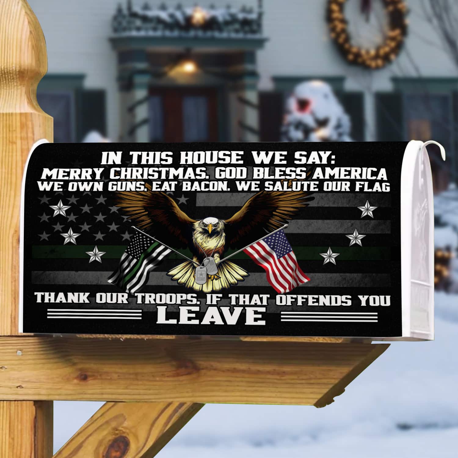 Let’s Shop In This House We Say Merry Christmas God Bless America Eagle US Veteran Mailbox Cover – Decorative Post Letter Box Decor!
