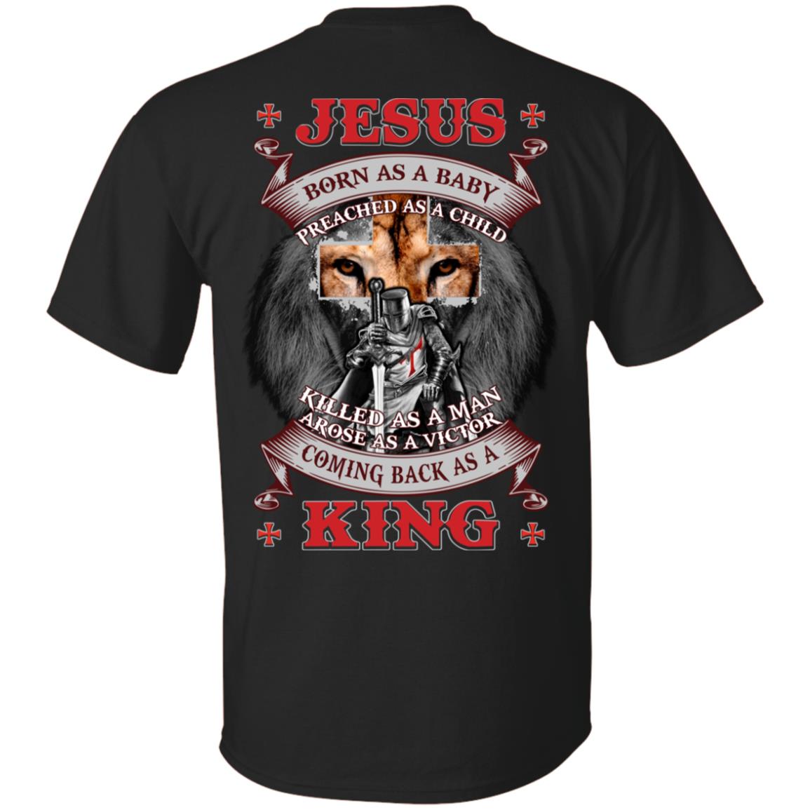 Jesus Born As A Baby Preached As A Child Killed As A Man Arose As A Victor Print On Back T-Shirt