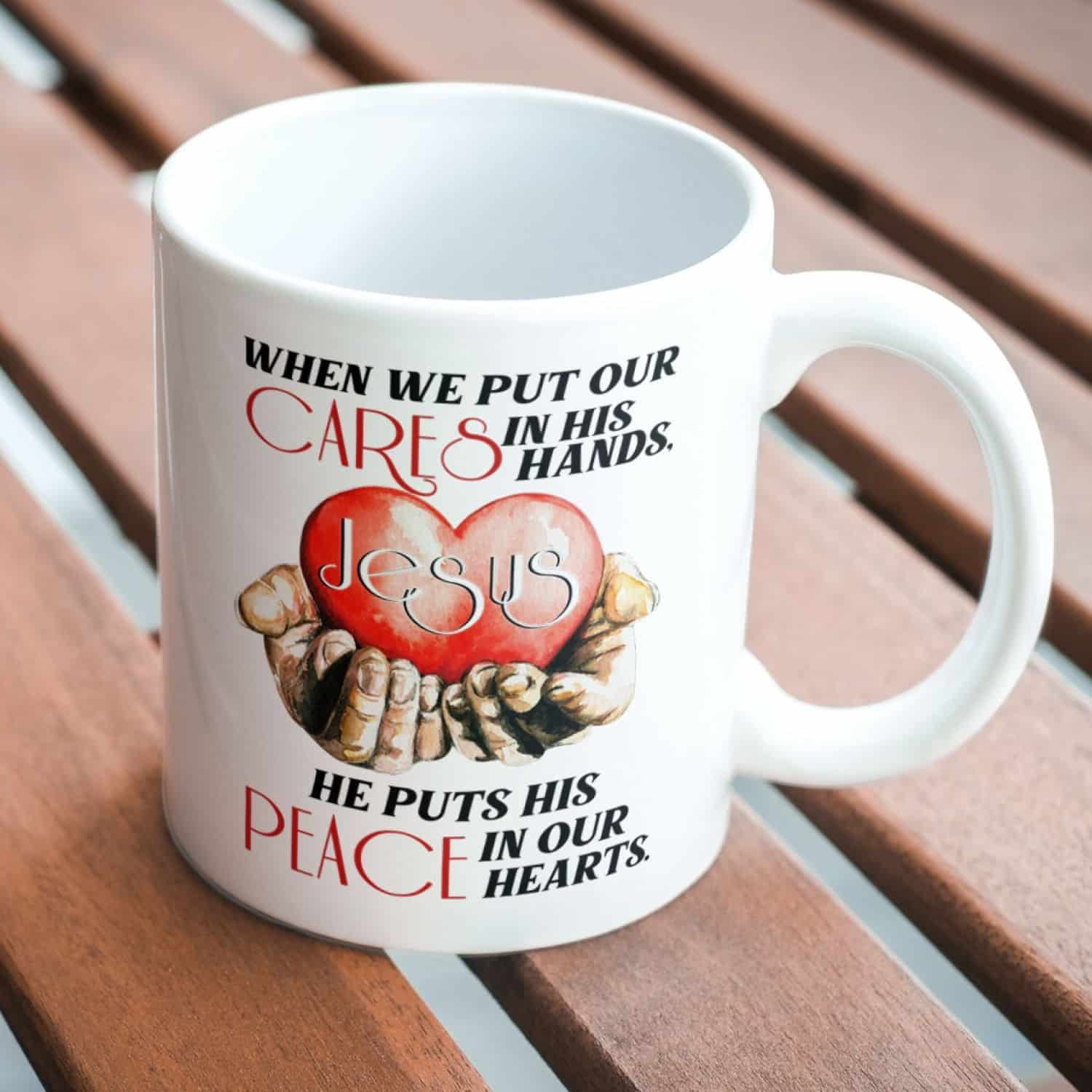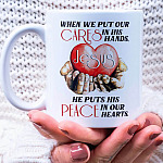 Let’s Shop When We Put Our Cares In His Hand He Puts His Peace In Our Hearts Ceramic Coffee Mug – Beer Stein – Water Bottle – Jesus Christ Gift!