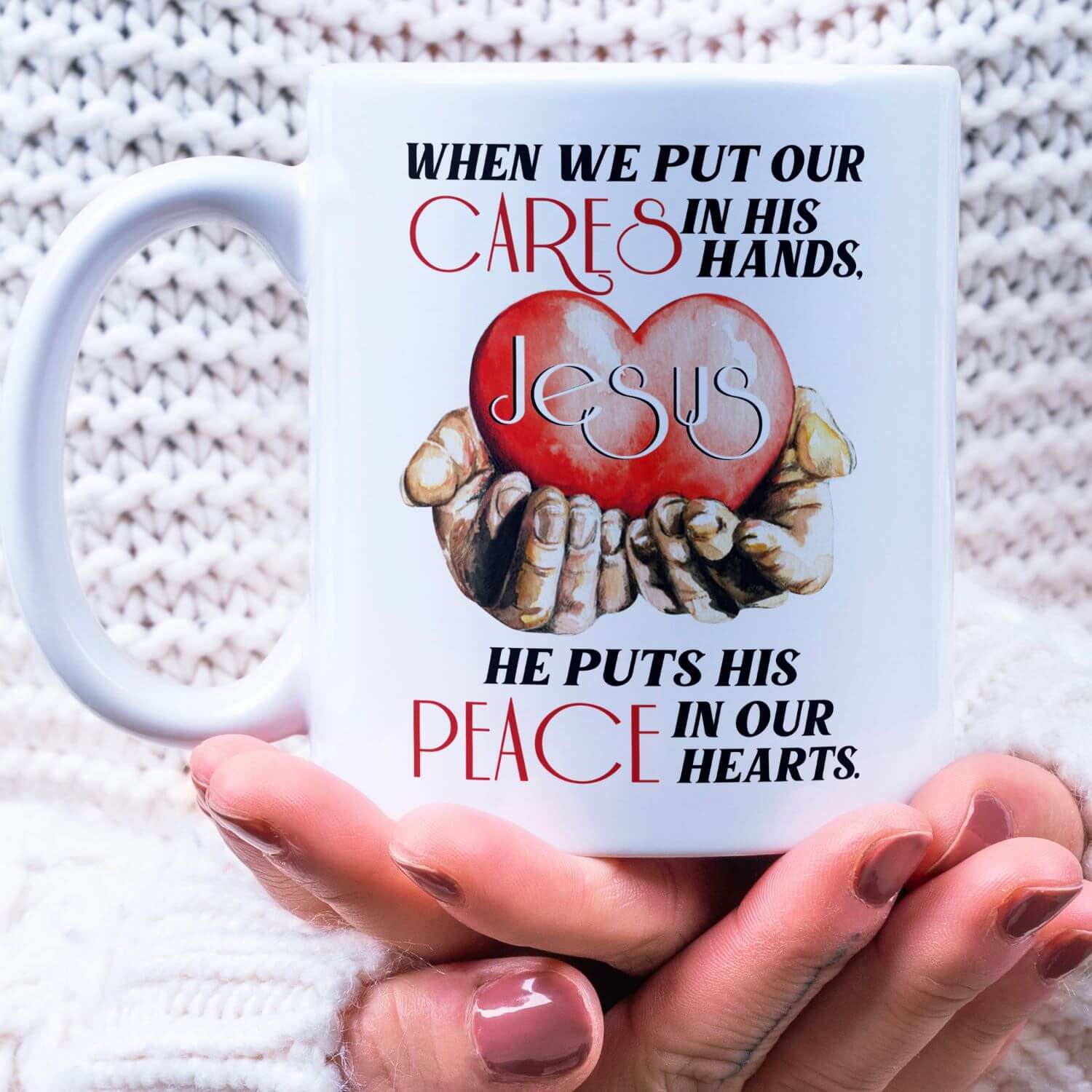 At CubeBik, besides mugs, we also offer tees, hoodies, sweaters, raglans, tanks, wall arts, canvases, posters, blankets, engraved jewelry, personalized necklaces, printed face masks, throw pillows, tote bags, hats, accessories and more on our website, so do not miss our other When We Put Our Cares In His Hand He Puts His Peace In Our Hearts Mug, Jesus Christ Gift, Jesus Christian Mug, Jesus Christ Drinkware, Jesus Christ Gift, Jesus Christ Wall Hanging, I Can Do All Things Through Christ Gift, I Can Do All Things Through Christ Gift related merchandise. Moreover, all the products are made-to-order and one of a kind custom designs you can’t get elsewhere in normal stores. Let’s discover CubeBik.com now and find your favorite personalized items. We can’t wait to surprise and build beautiful memories with you and your loved ones.