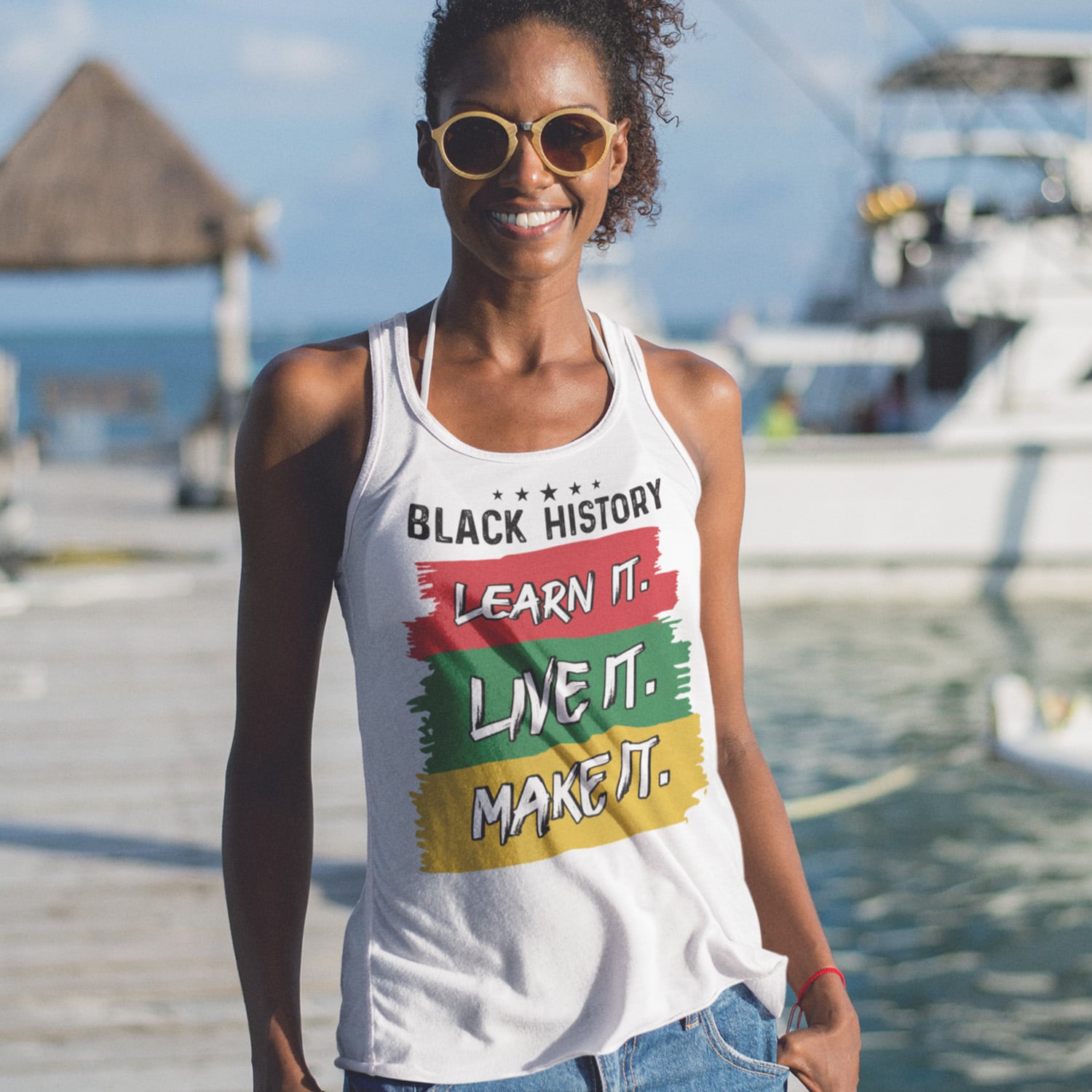 Learn It Live It Make It Black History Month Cotton Tank Top Tee – Ladies Racerback Tank