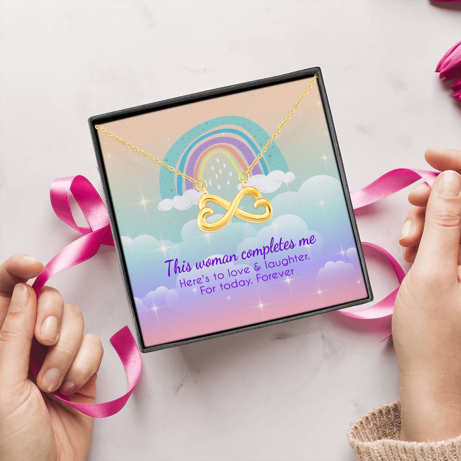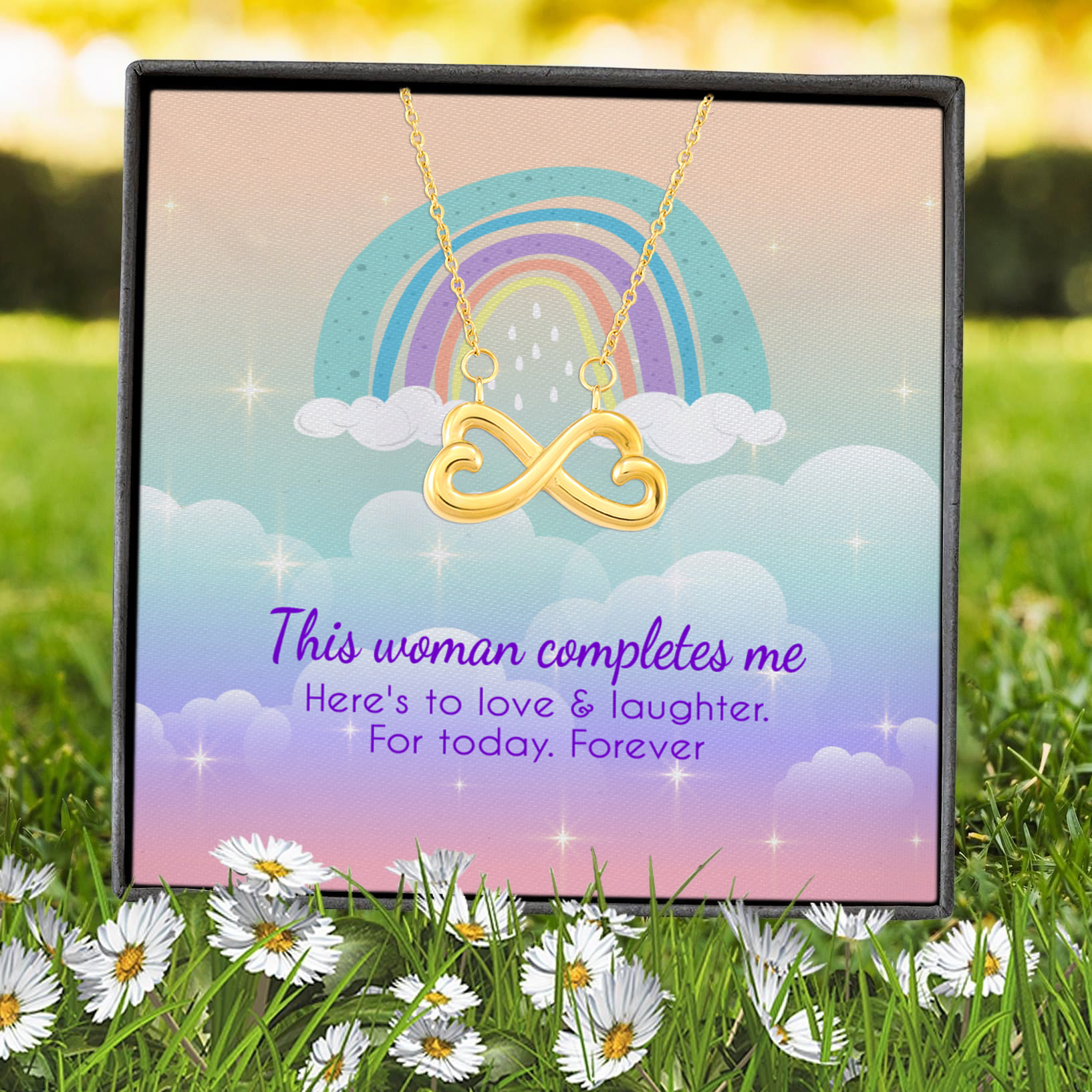 Let’s Shop LGBT This Woman Completes Me Here’s to Love and Laughter Forever Valentine Infinity Heart Pendant Necklace!