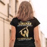 Behind Every Lineman Who Believes In Himself Is A Lineman Mom Who Believed In Him First Print On Back T-Shirt – V-Neck