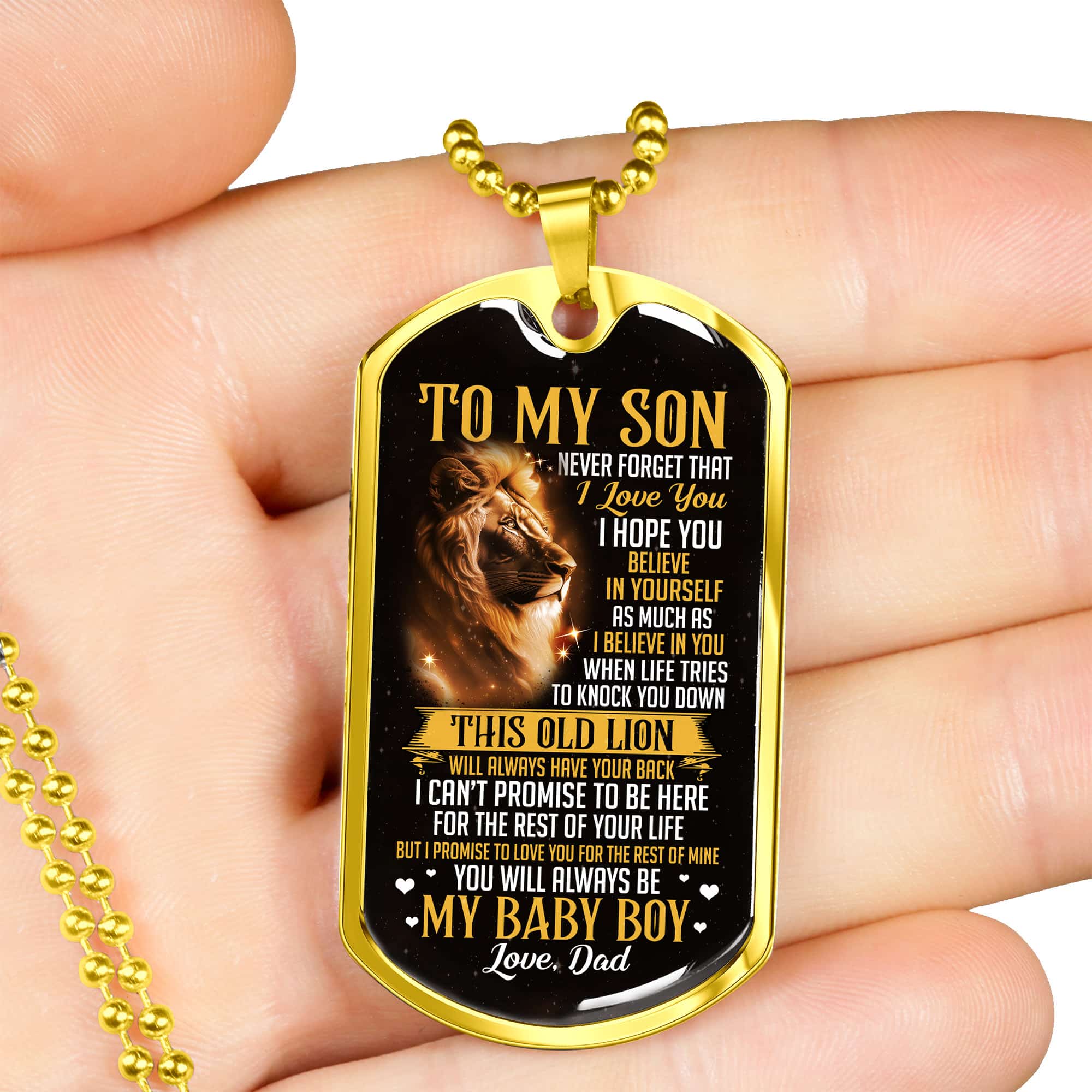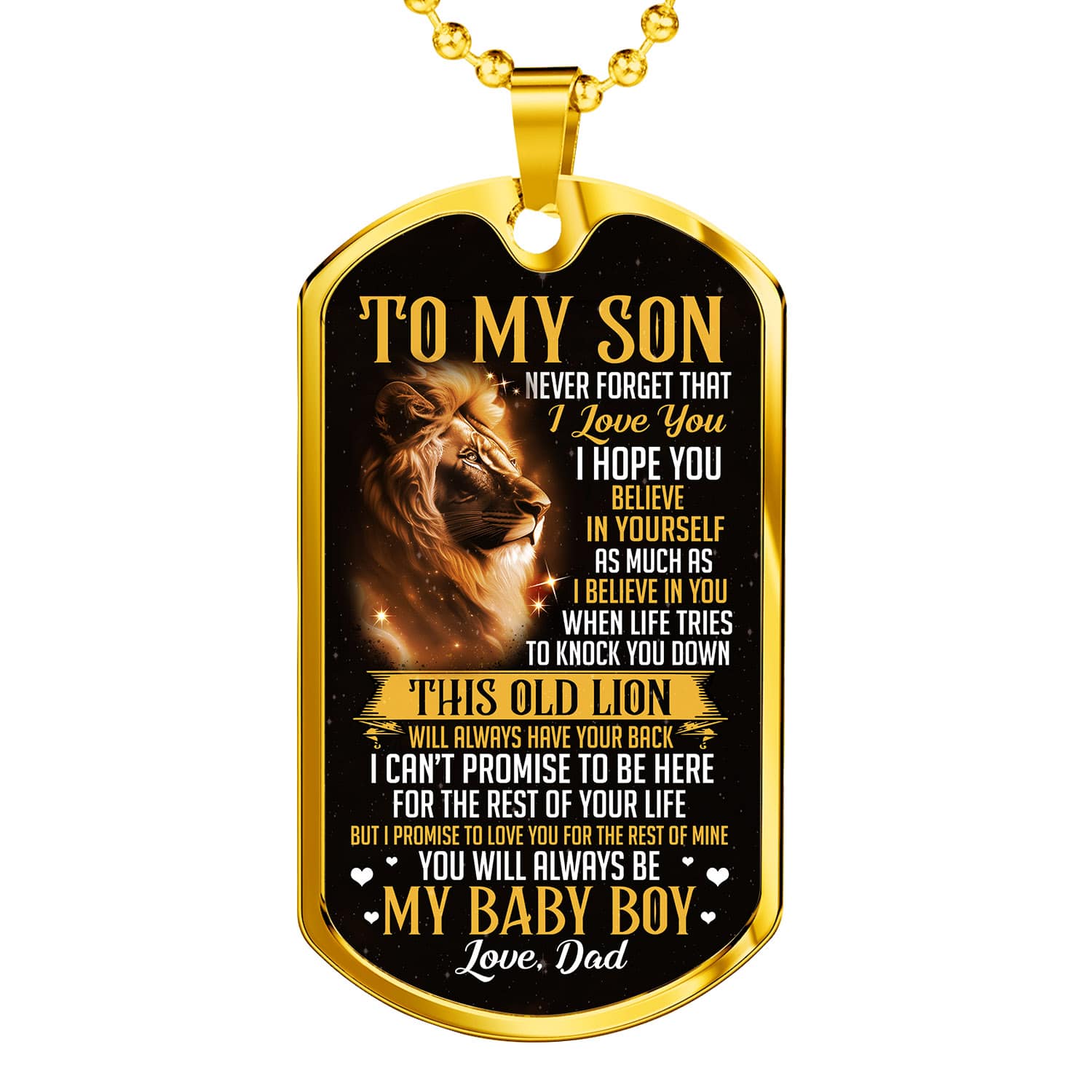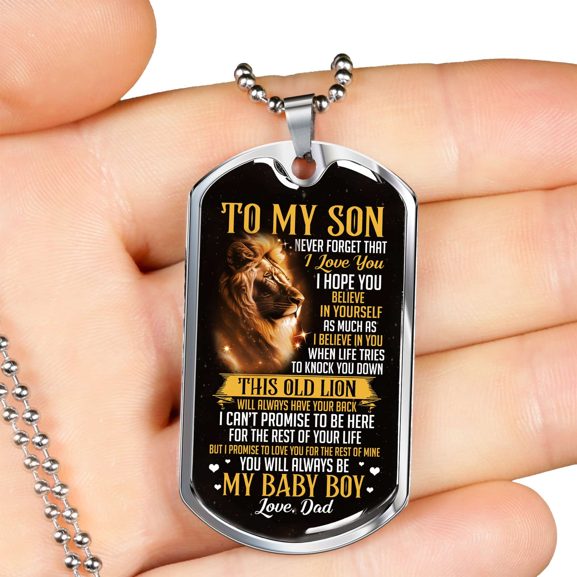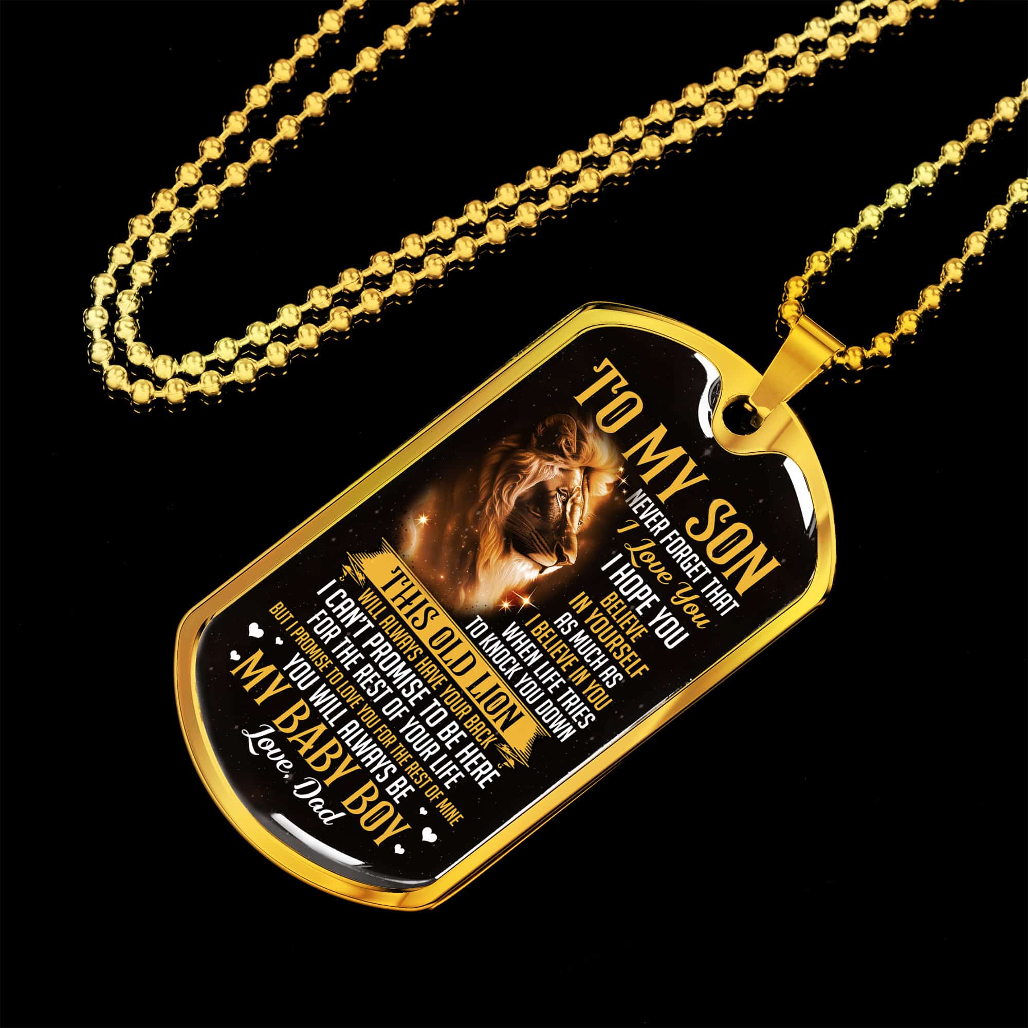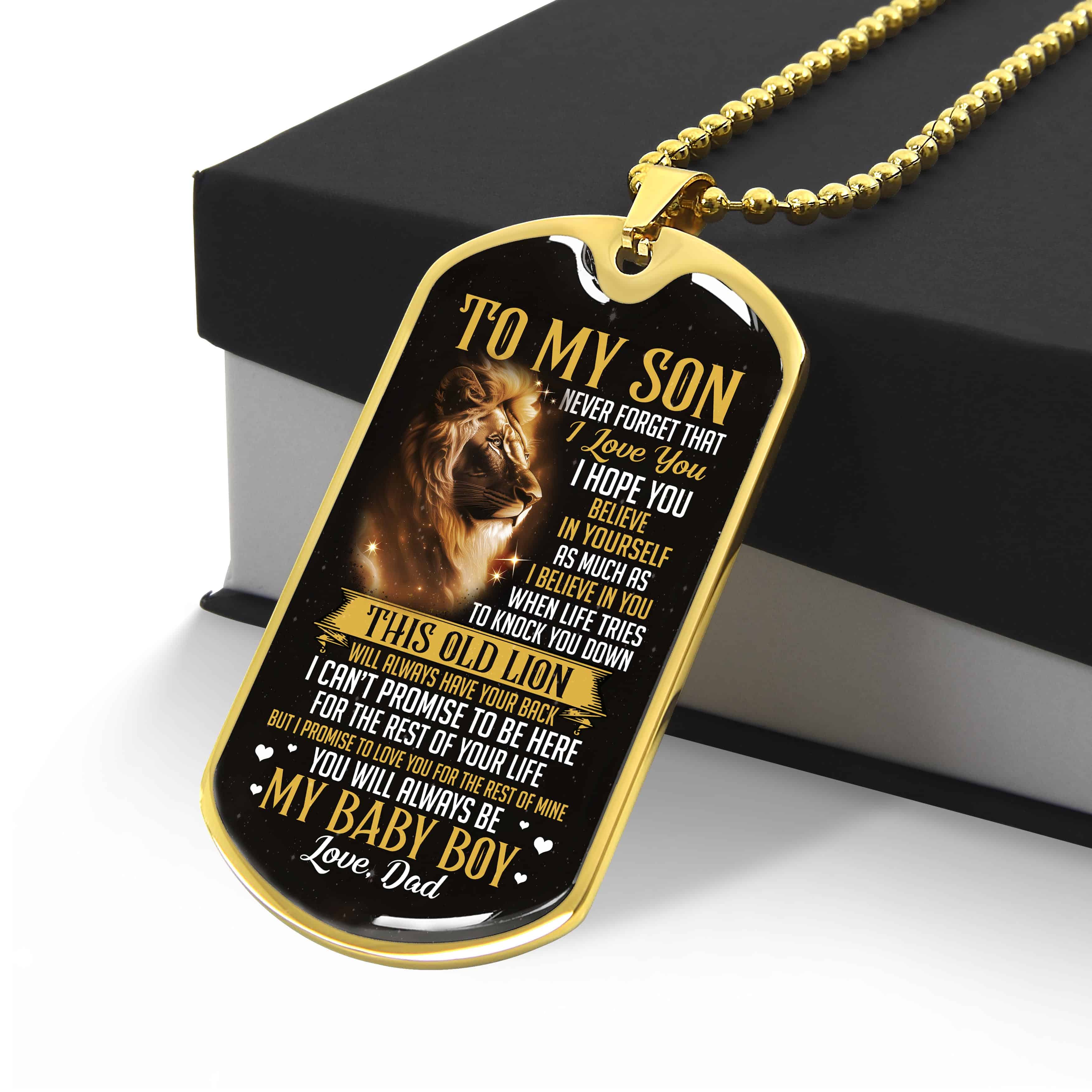 Are you spending too much time to find creative merchandise for you or suitable & special gifts for your mommy, your daddy, your son, your daughter, your children, your friends or someone you love? The struggle is over because we have various To My Son from Dad Dog Tags Lion, Son Lion Dog Tag from Dad, to My Son Dog Tag Necklace, to My Son Dog Tag Necklace from Dad, to My Son Dog Tag Necklace with Lion, to My Son Dog Tag from Dad, to My Son from Dad Dog Tags, to My Son Dog Tag Necklace Gold which will make perfect presents for your beloveds. In order to make your present stand out, we have created lots of unique and awesome customized photo gifts & personalized designs.