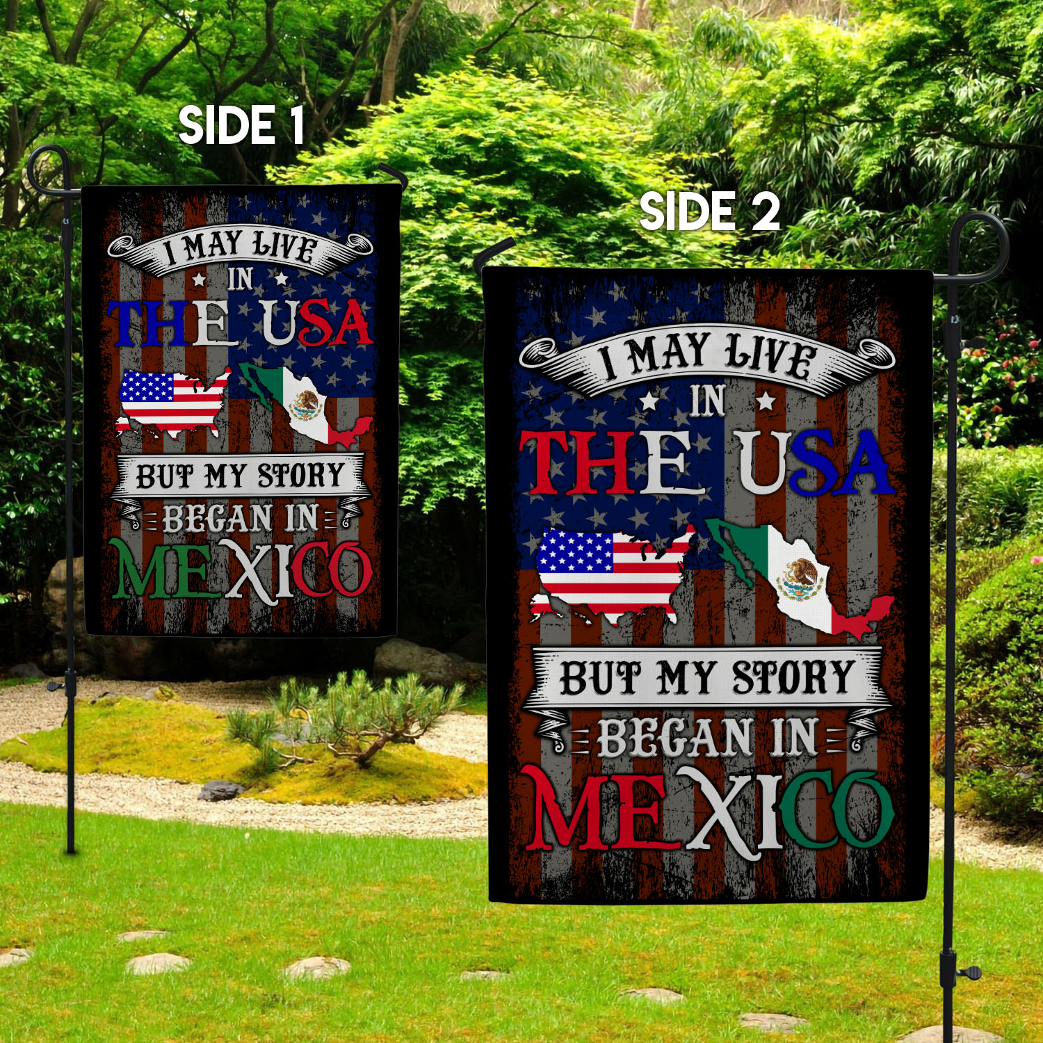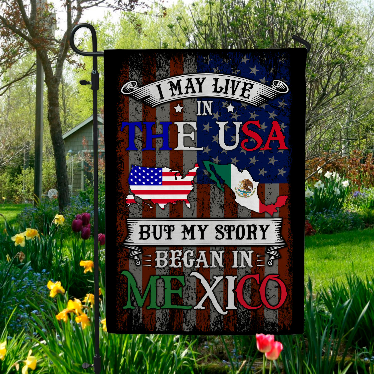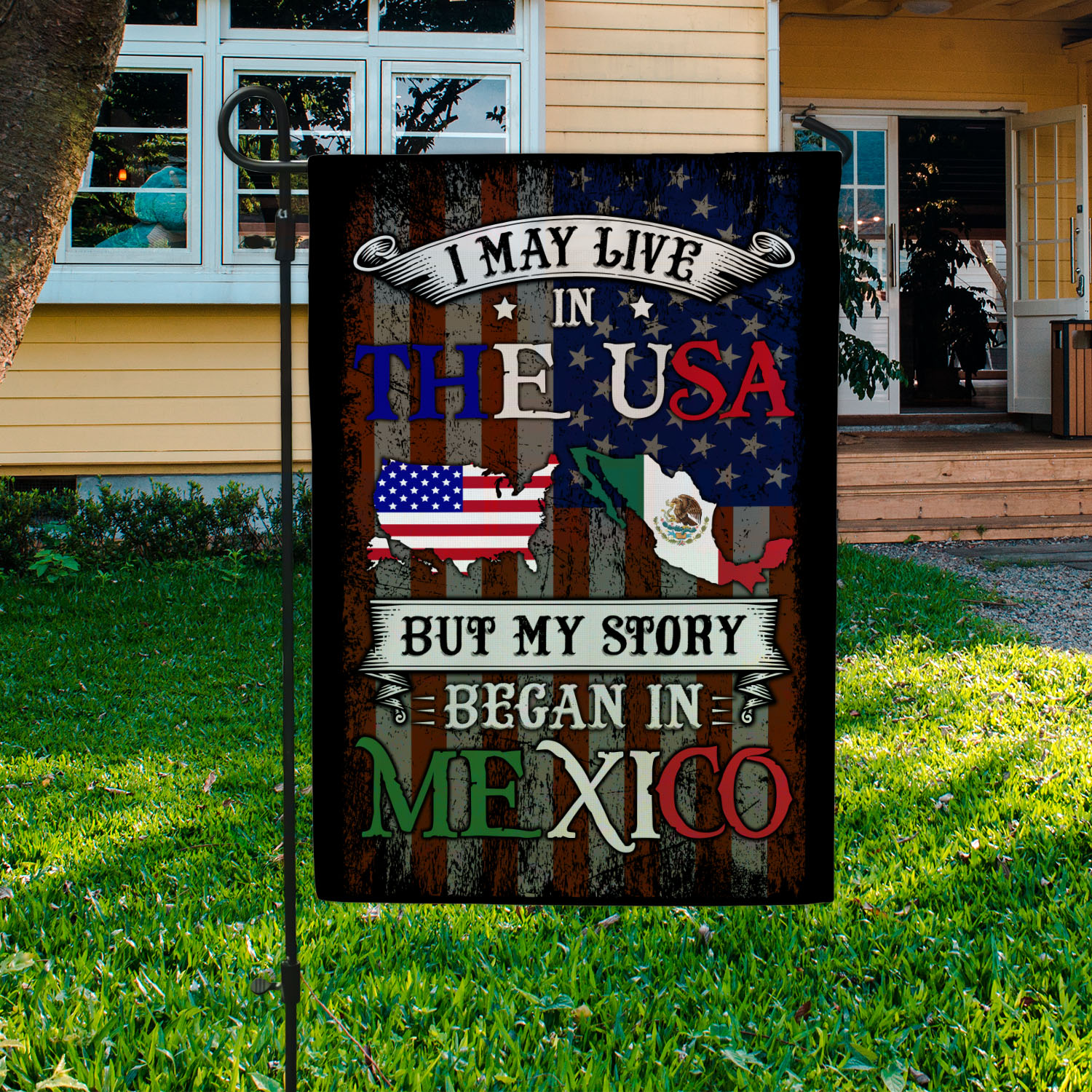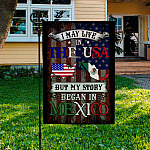 Let’s Shop I May Live In The USA But My Story Began In Mexico Garden Flag – American Grown With Mexican Roots House Flag!