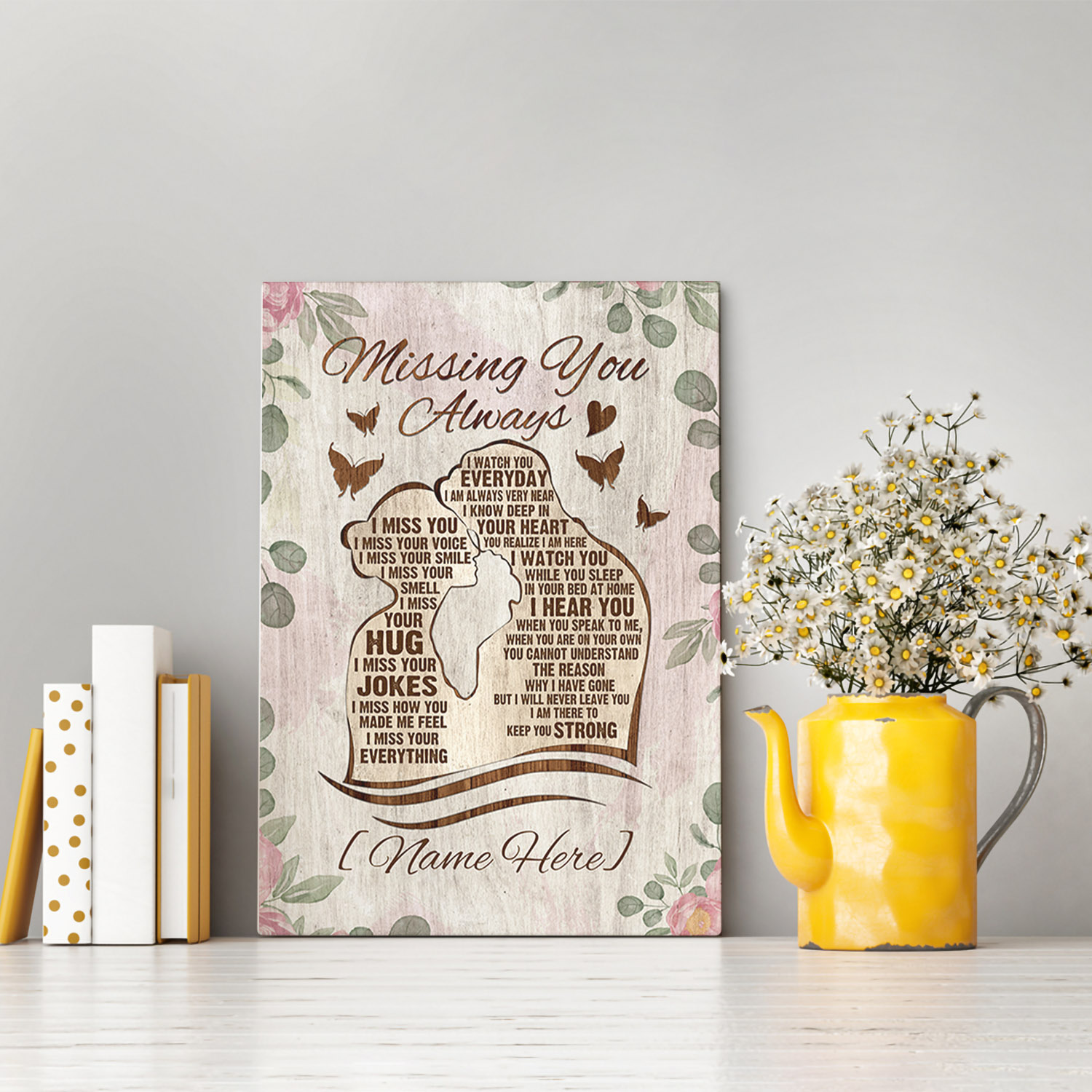 Are you spending too much time to find creative merchandise for you or suitable & special gifts for your mommy, your daddy, your son, your daughter, your children, your friends or someone you love? The struggle is over because we have various Miss You Always, Missing You Always You Never Said I’m Leaving Canvas, Missing You Always, Missing You Always Poster, Missing You Always Ornament, Personalized Memorial Gifts for Loss of Husband, Memorial Gifts for Loss of Husband Personalized, Memorial Gifts for Loss of Wife Personalized, Personalized Gift for Loss of Wife which will make perfect presents for your beloveds. In order to make your present stand out, we have created lots of unique and awesome customized photo gifts & personalized designs.