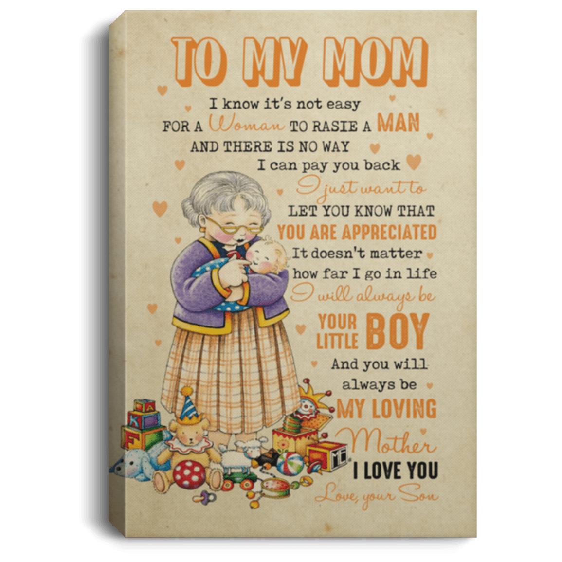 At CubeBik LLC, besides canvases, we also offer tees, hoodies, sweaters, raglans, tanks, wall arts, canvases, mugs, blankets, throw pillows, tote bags, hats, accessories and more on our website, so do not miss other To My Mom, I Love My Mom, You Are My Sunshine Mom, Thanks for Being My Mom, to My Mom Blanket, to My Mom Gifts, Room Decor for Women, Mom Decoration, Mom Wall Decor, Home Decor for Mom relating merchandise, and all of them are one of a kind custom designs you can’t get elsewhere in normal stores. Let’s discover CubeBik and find your favorites. We can’t wait to surprise and build beautiful memory with you and your loved ones.