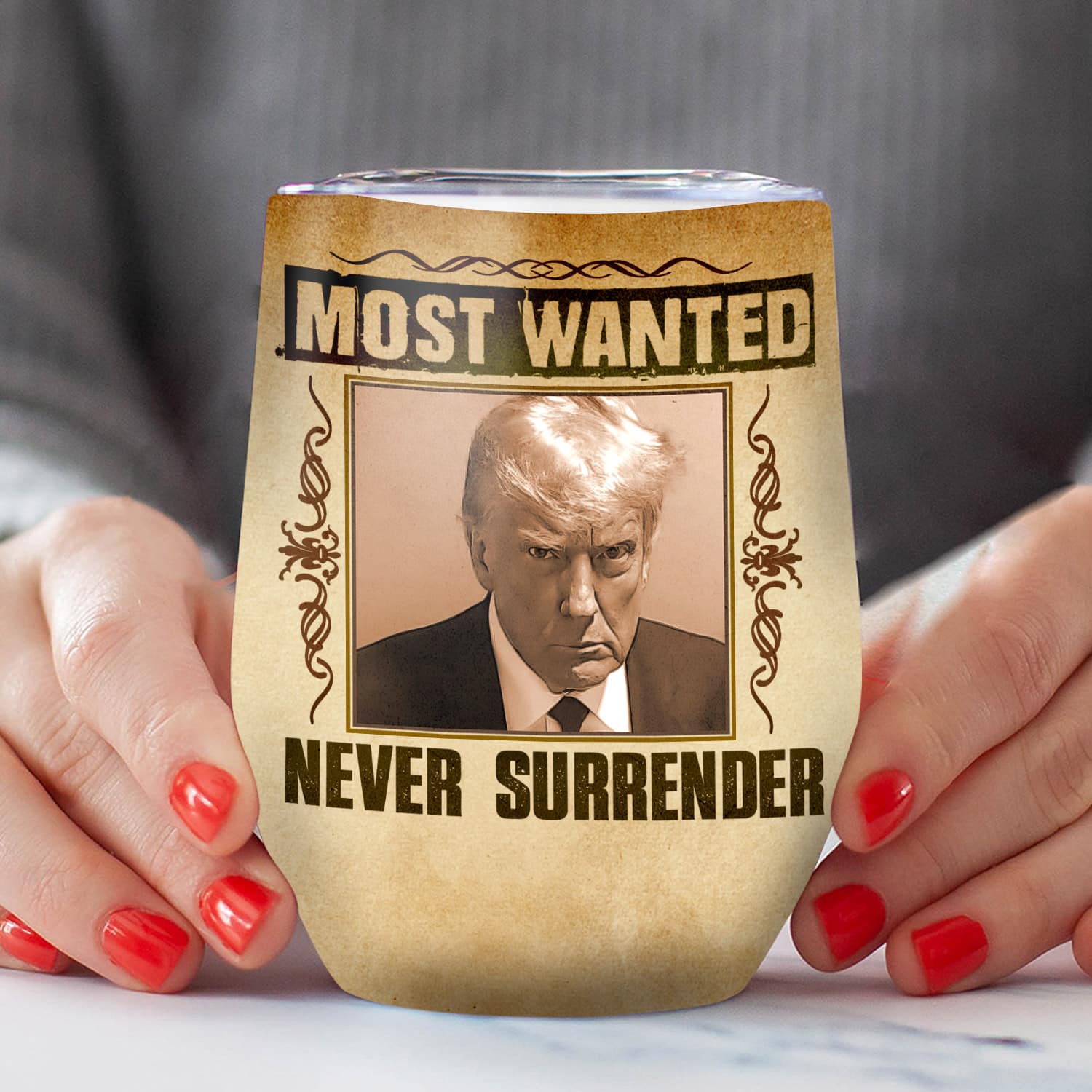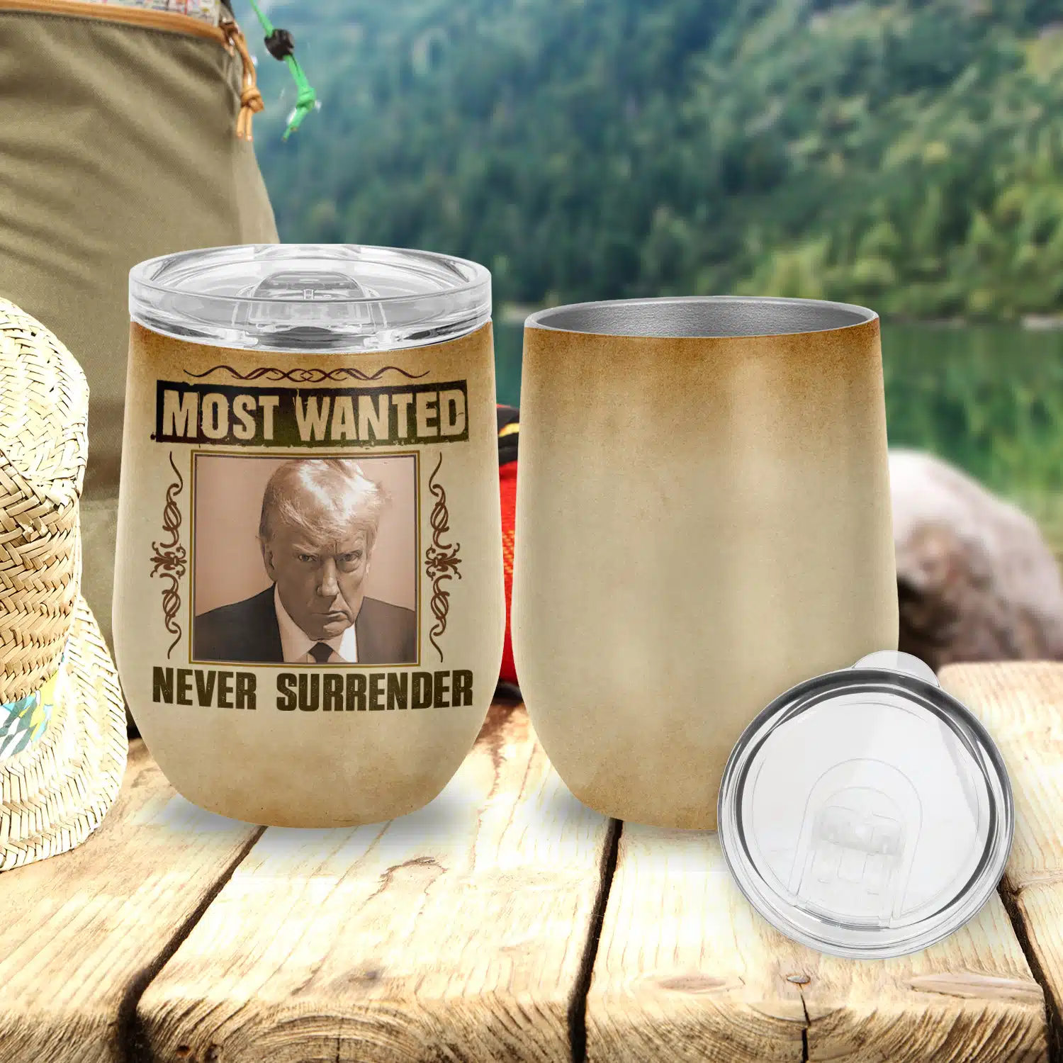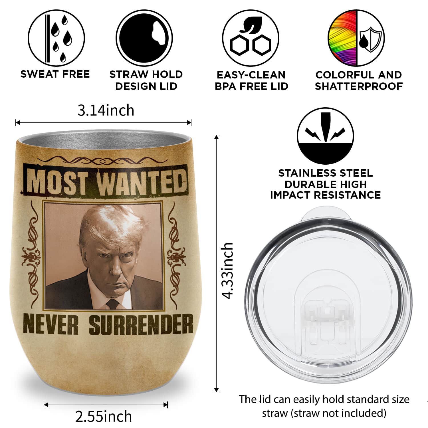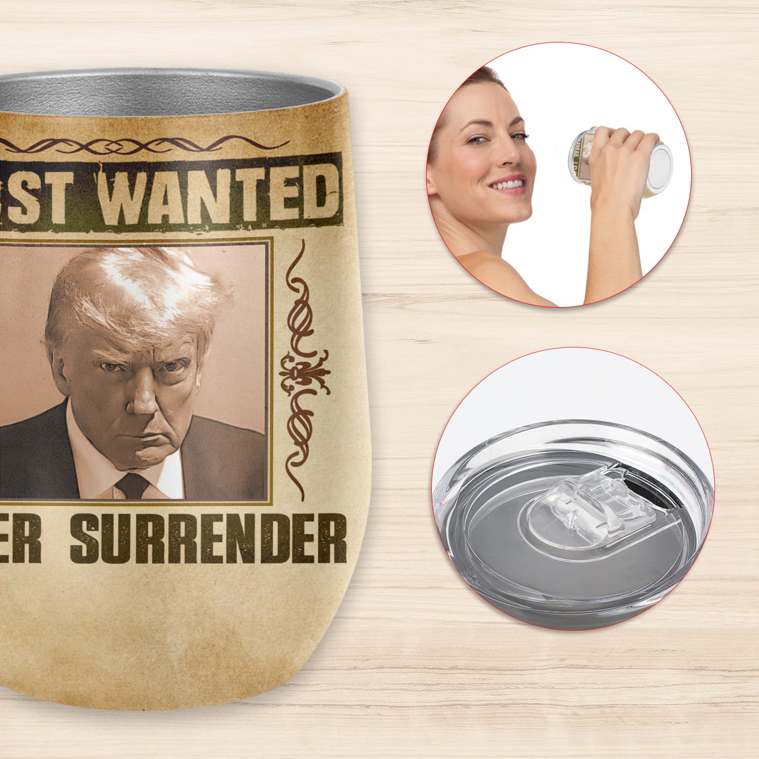 Let’s Shop Most Wanted Never Surrender Donald Trump Mug Shot Vacuum Insulated Cup – Wine Tumbler with Lid!