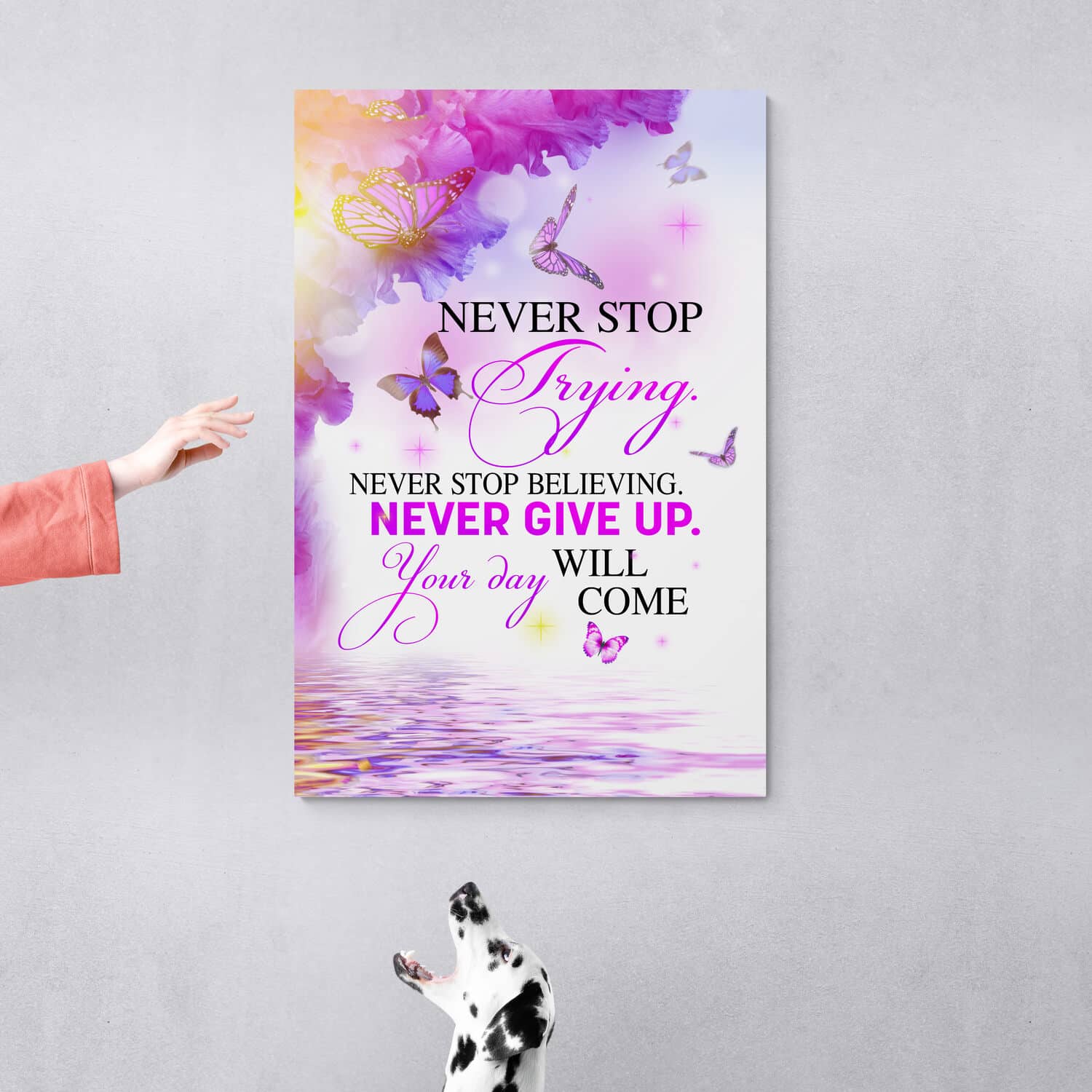 Let’s Shop Never Stop Trying Never Stop Believing Never Give up Your Day Will Come Butterfly Canvas Print – Home Decor Wall Art – Poster!