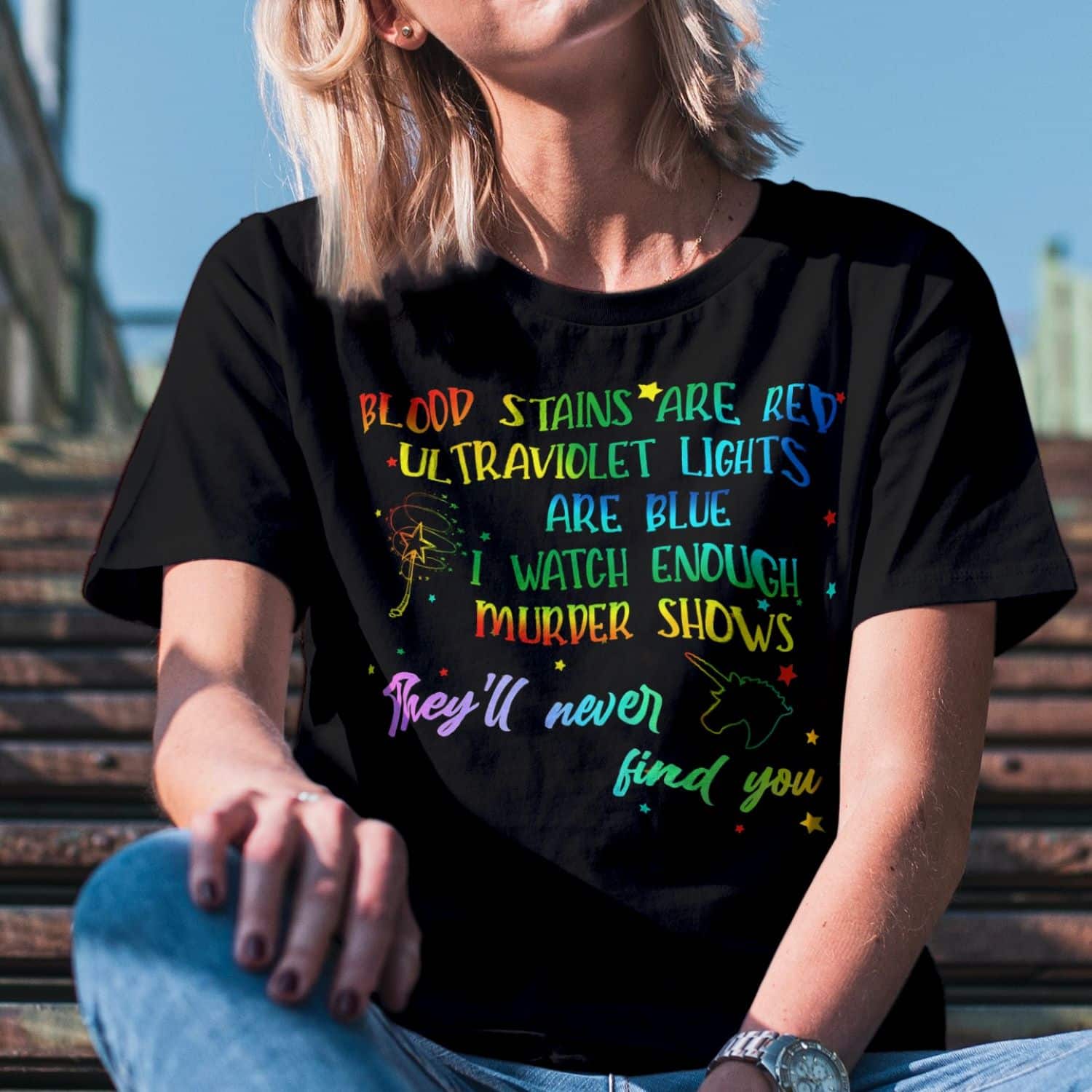 Are you spending too much time to find creative merchandise for you or suitable & special gifts for your mommy, your daddy, your son, your daughter, your children, your friends or someone you love? The struggle is over because we have various Blood Stains Are Red Ultraviolet Lights Are Blue I Watch Enough Murder Shows, Murder Shows and Comfy Clothes Shirt, Murder Shows T-Shirt, Murder Shows Gift, Murder Lover Gifts, Blood Stains, Blood Stains Are Red Shirt which will make perfect presents for your beloveds. In order to make your present stand out, we have created lots of unique and awesome customized photo gifts & personalized designs.