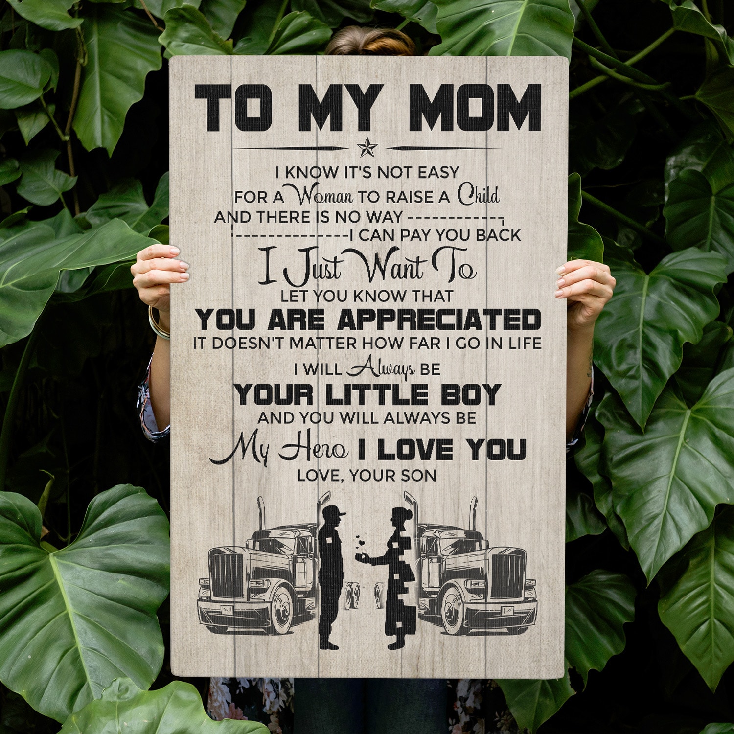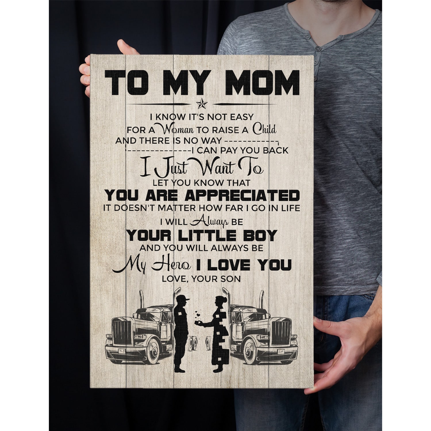 Son to My Mom I Know Not Easy for Woman to Raise a Child Trucker Framed Canvas Prints – Unframed Poster
