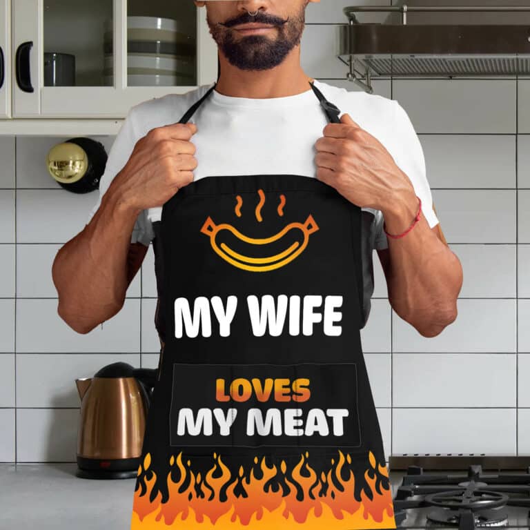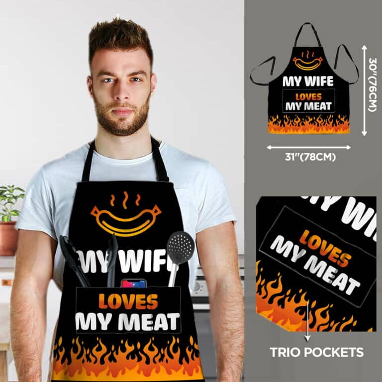 Let’s Shop My Wife Loves My Meat Funny Apron With Three Pocket – Aprons For Men Women – Grill Cooking BBQ Kitchen Chef Apron!