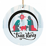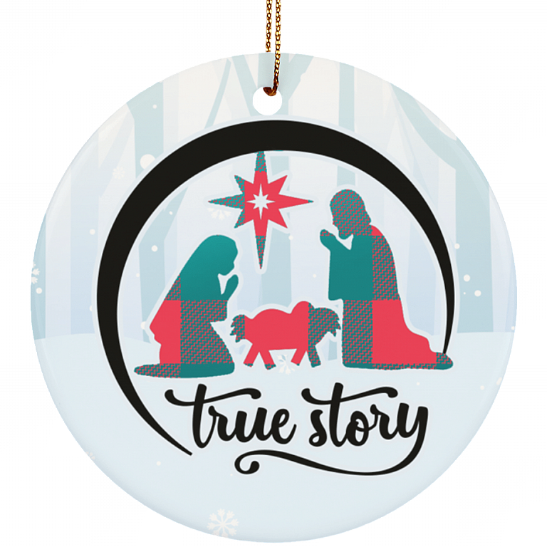 Shop True Story Christmas Manger Nativity Scene Buffalo Plaid Christmas Ornament Keepsake – Circle Ceramic Ornament.