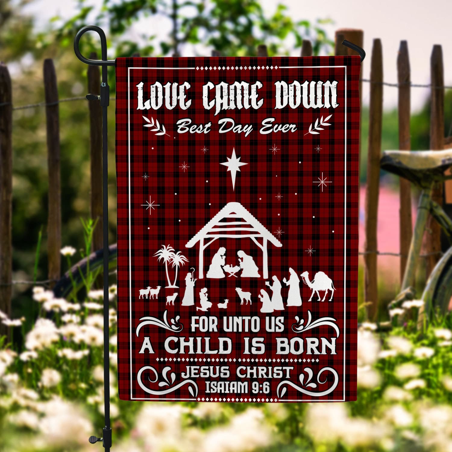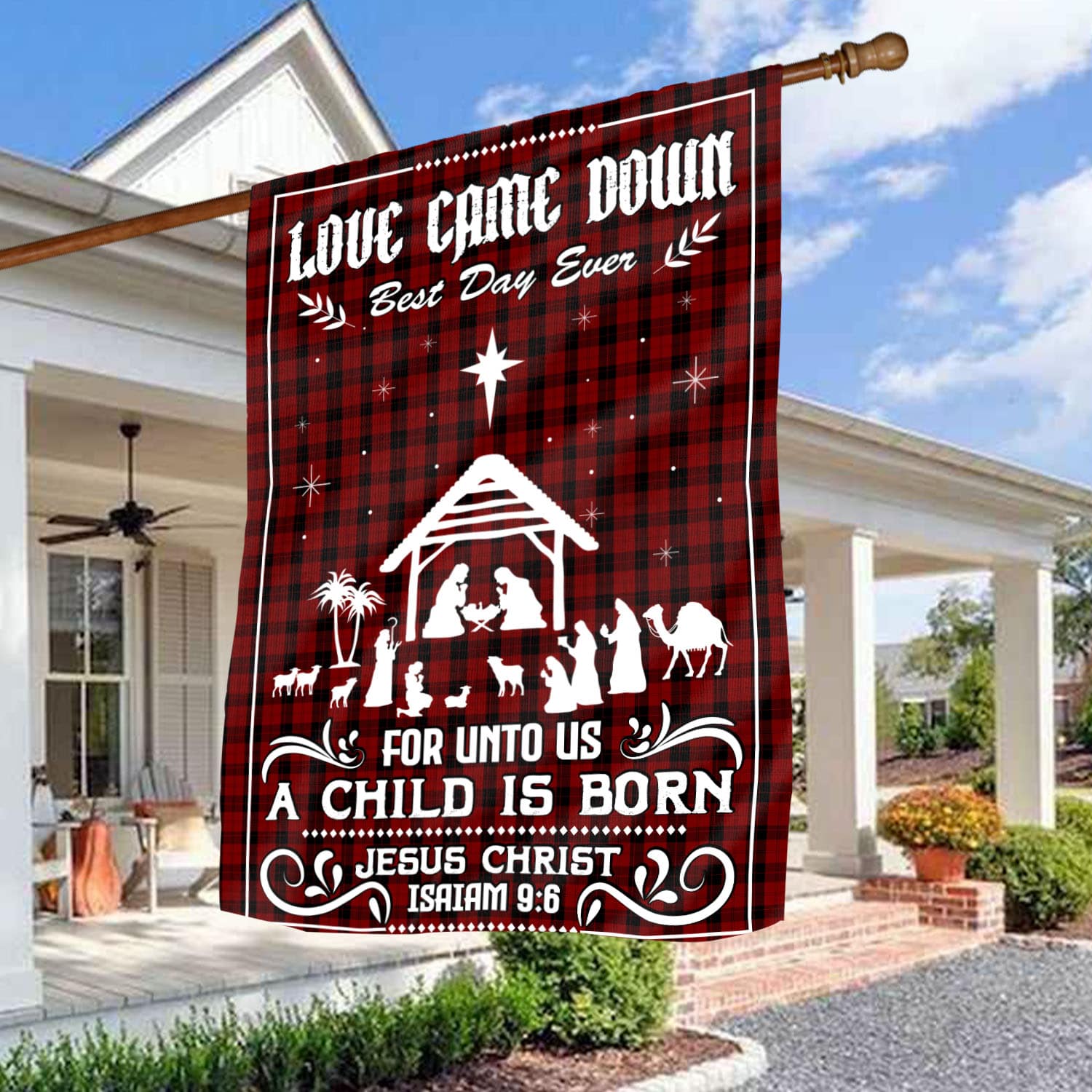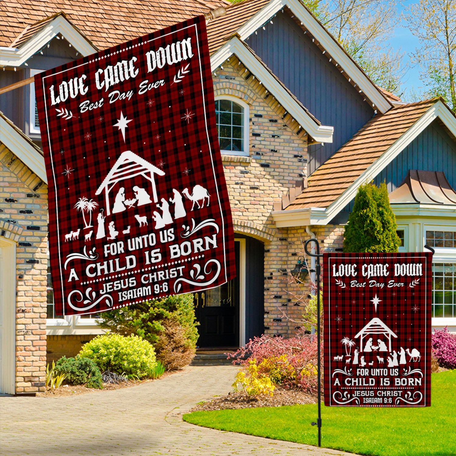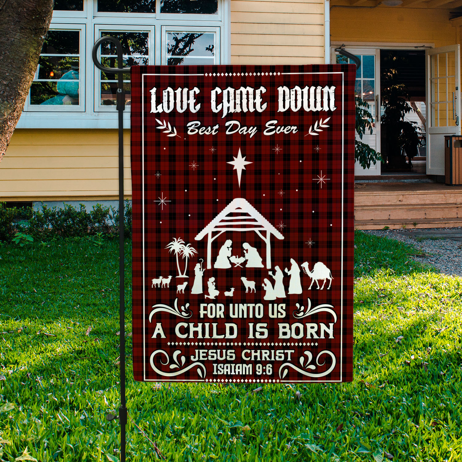 Let’s Shop Christian Christmas Nativity Scene Birth Of Jesus Christ Love Came Down Bufallo Plaid Garden Flag – Holy Family House Flag!