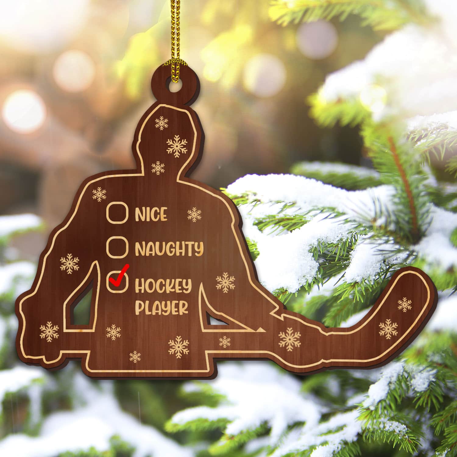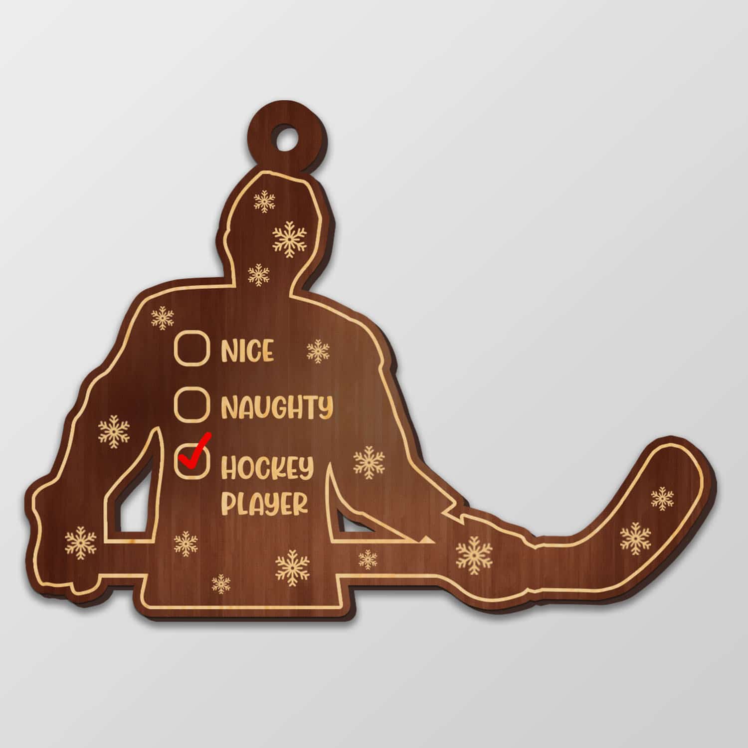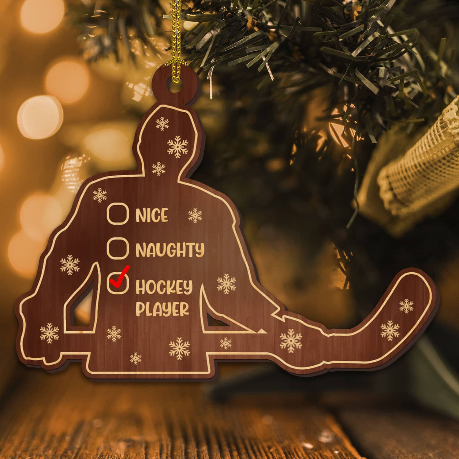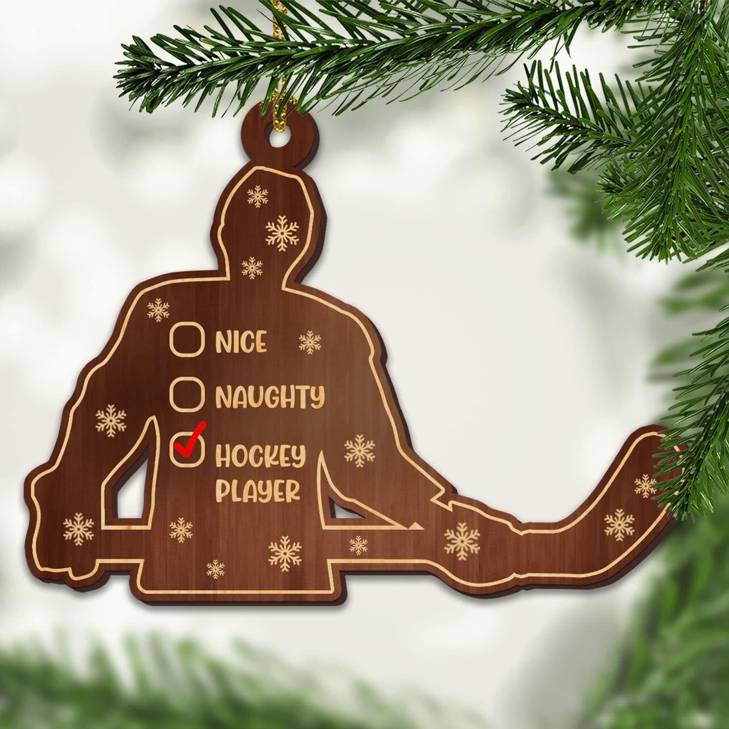 Let’s Shop Nice Naughty Hockey Player Custom Shaped Wooden Christmas Ornament!