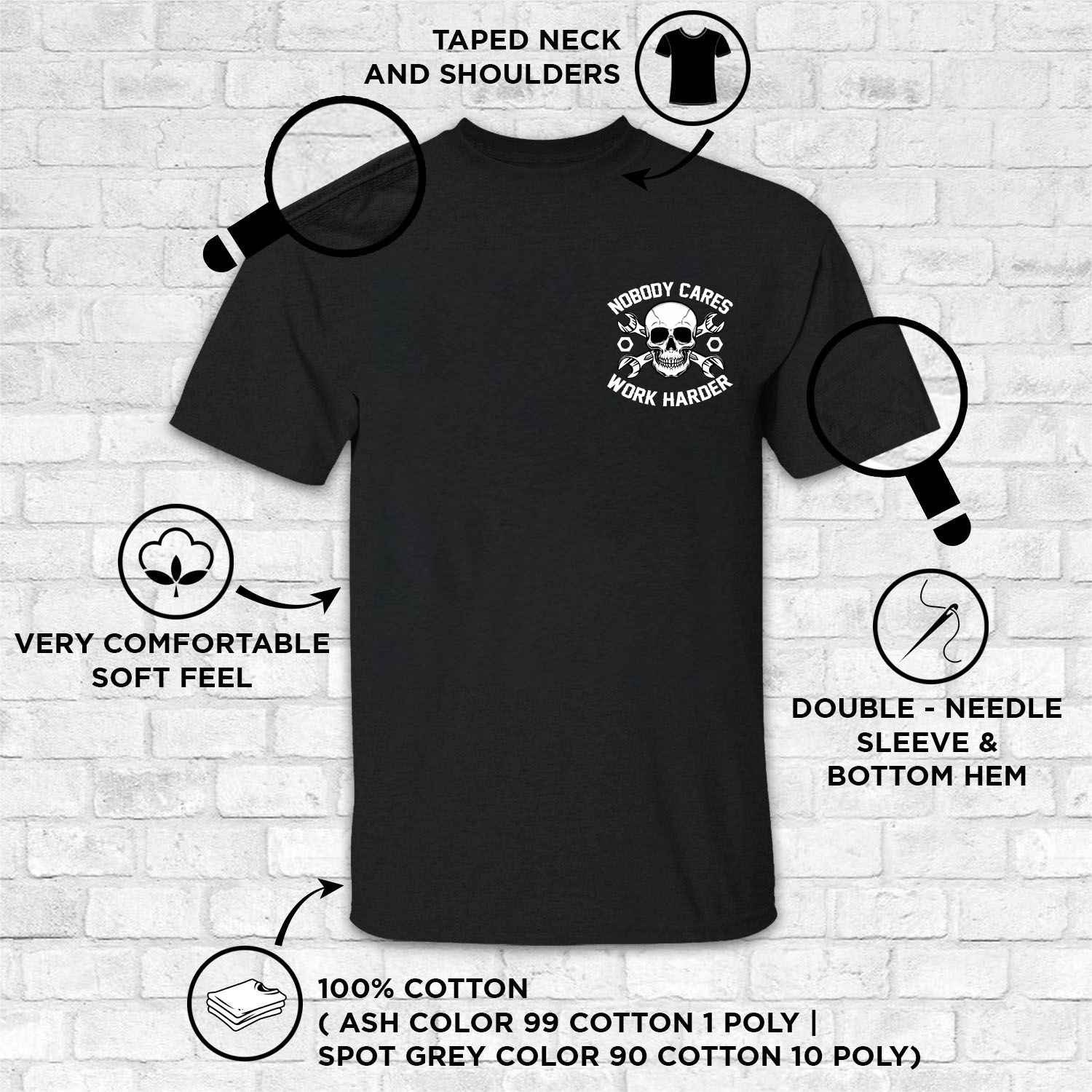 • 5.3-ounce, 100% cotton (99/1 cotton/poly (Ash) & 90/10 cotton/poly (Sport Grey), 50/50 cotton/poly (Dark Heather)