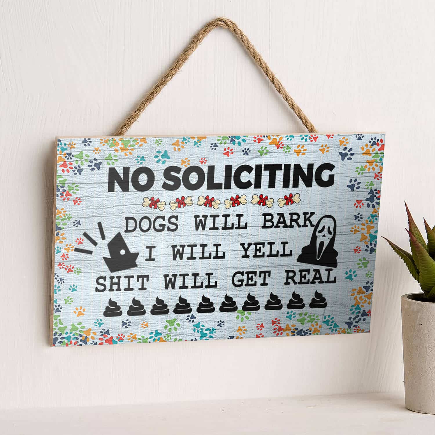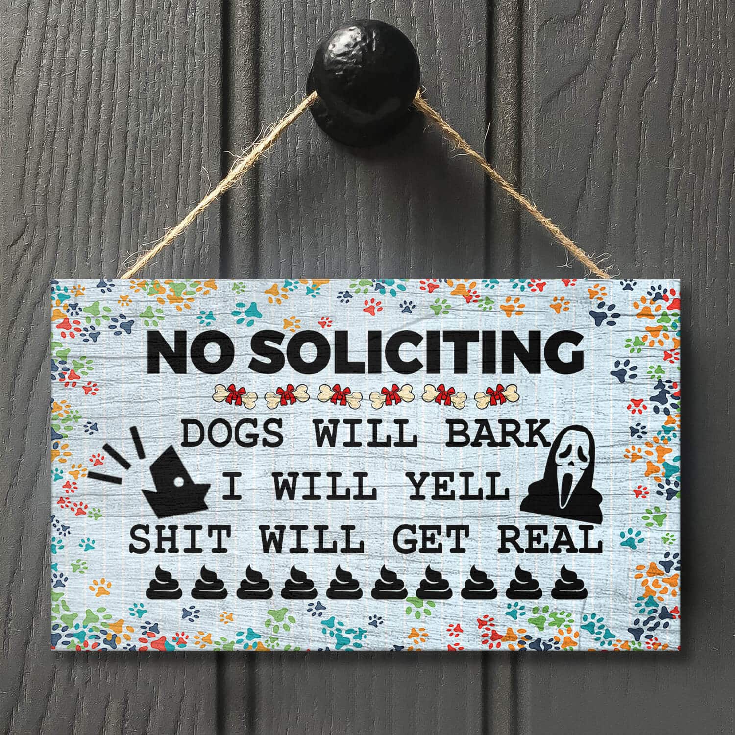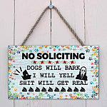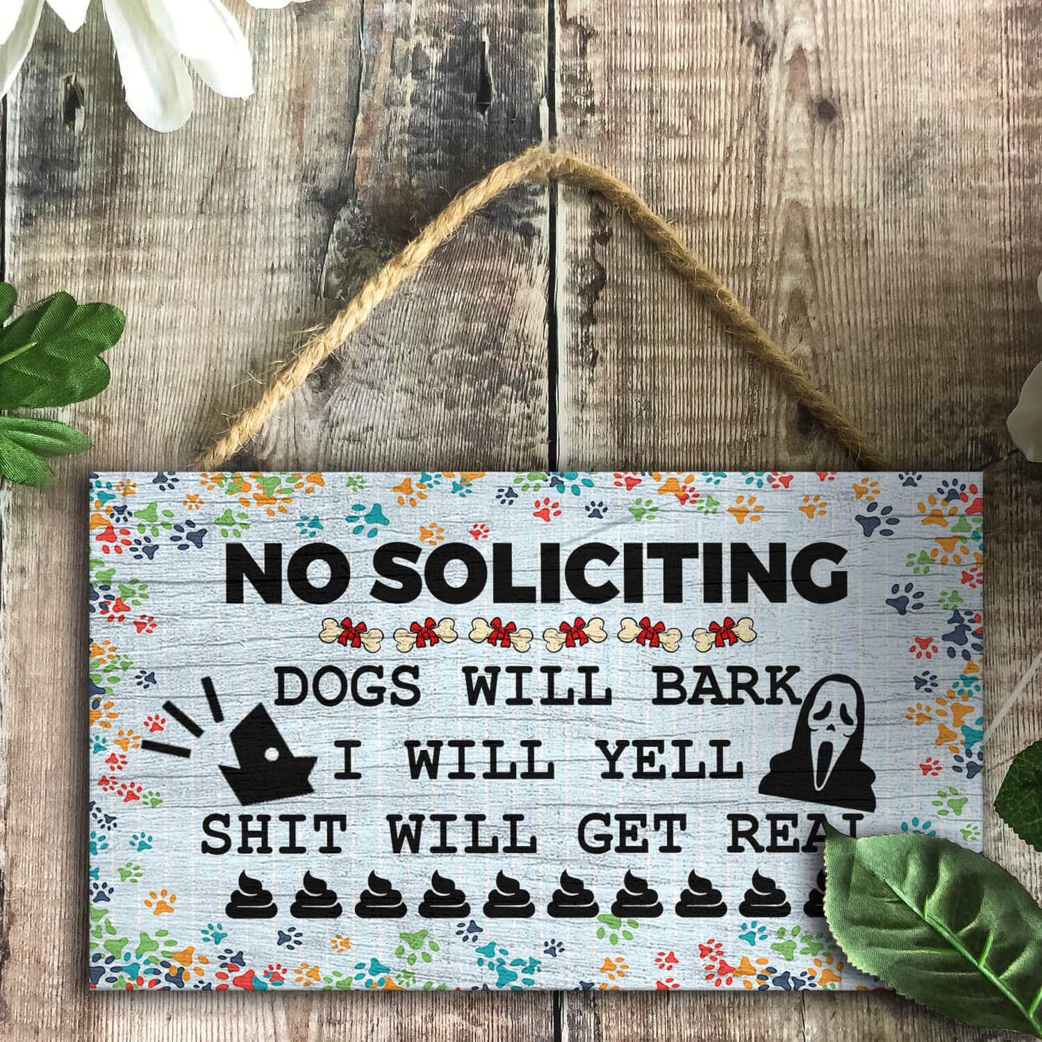 Let’s Shop No Soliciting Doorsign – No Soliciting Dogs Will Bark Decorative Wooden Door Sign – Front Porch Sign!