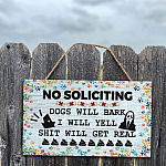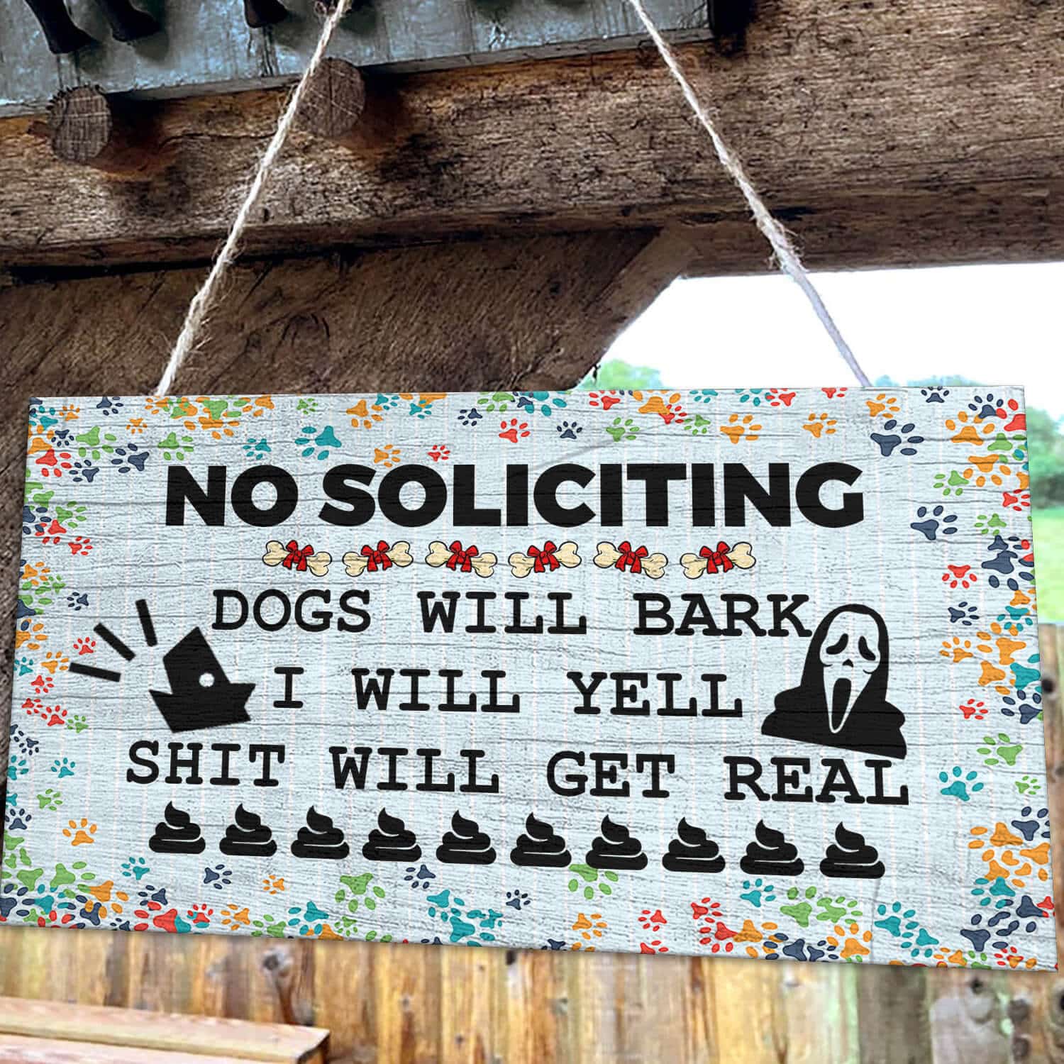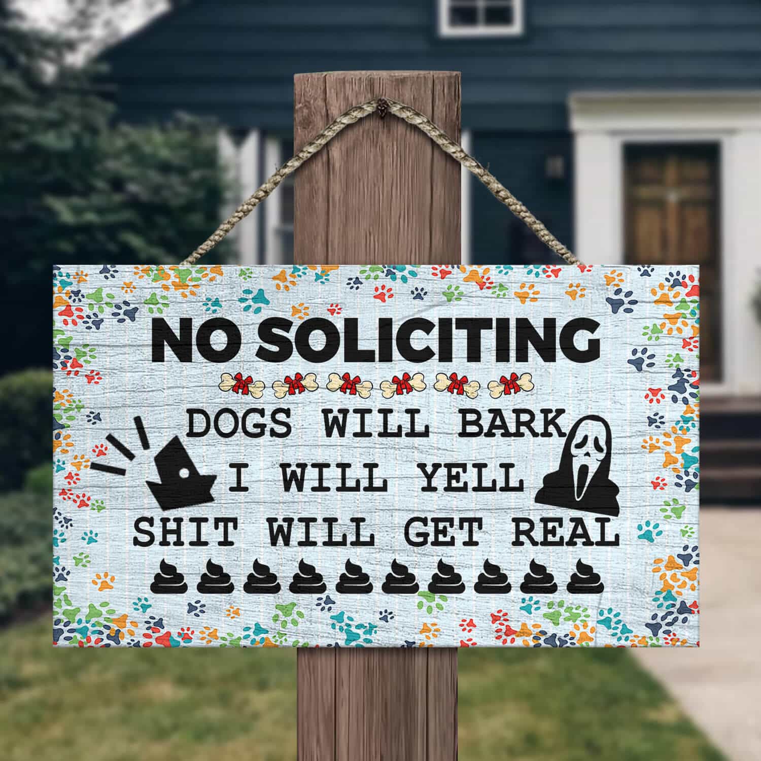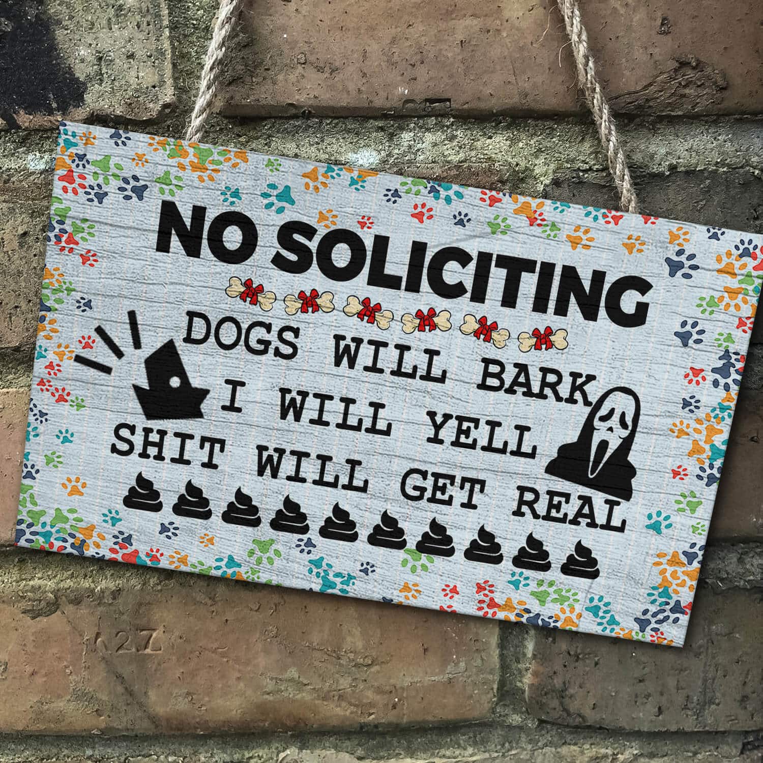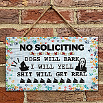 Let’s Shop No Soliciting Doorsign – No Soliciting Dogs Will Bark Decorative Wooden Door Sign – Front Porch Sign!