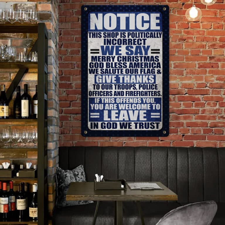 At CubeBik, besides custom decorative metal signs, we also offer tees, hoodies, sweaters, raglans, tanks, wall arts, canvases, posters, mugs, blankets, engraved jewelry, personalized necklaces, flags, throw pillows, tote bags, hats, accessories and more on our website, so do not miss our other Notice This Shop Is Politically Incorrect Sign, We Say Merry Christmas Sign, In God We Trust Sign, Shop Sign, Notice This Shop Is Politically Incorrect Decor, Shop Decor, Shop Doorsign, Shop Door Sign, Funny Sign for Shop, Shop Funny Sign. Moreover, all the products are made-to-order and one of a kind custom designs you can’t get elsewhere in normal stores. Let’s discover CubeBik.com now and find your favorite personalized items. We can’t wait to surprise and build beautiful memories with you and your loved ones.
