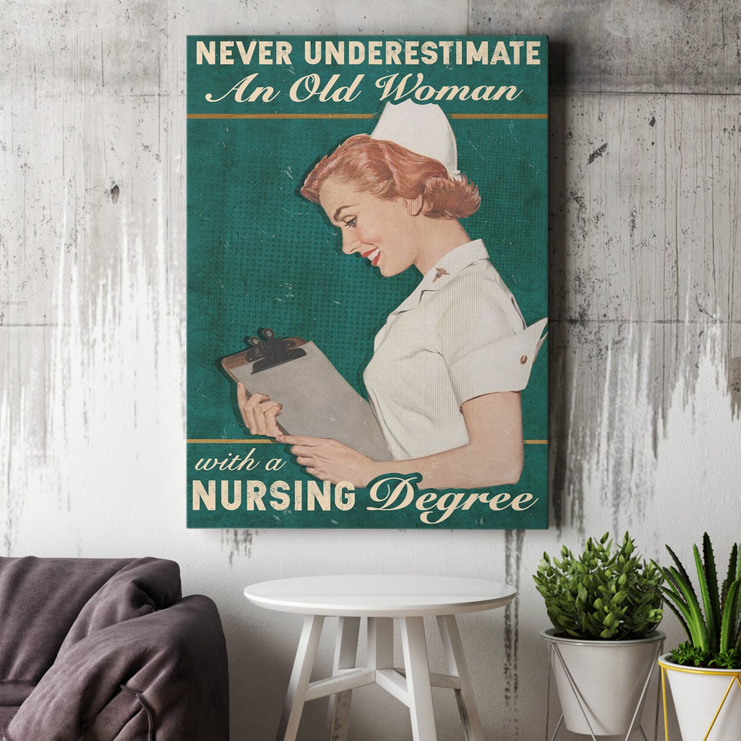 Let’s Shop Never Underestimate An Old Woman With A Nursing Degree Wrapped Framed Canvas Prints-Nurse Retirement Gifts!