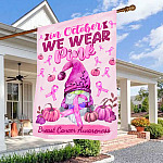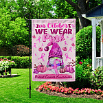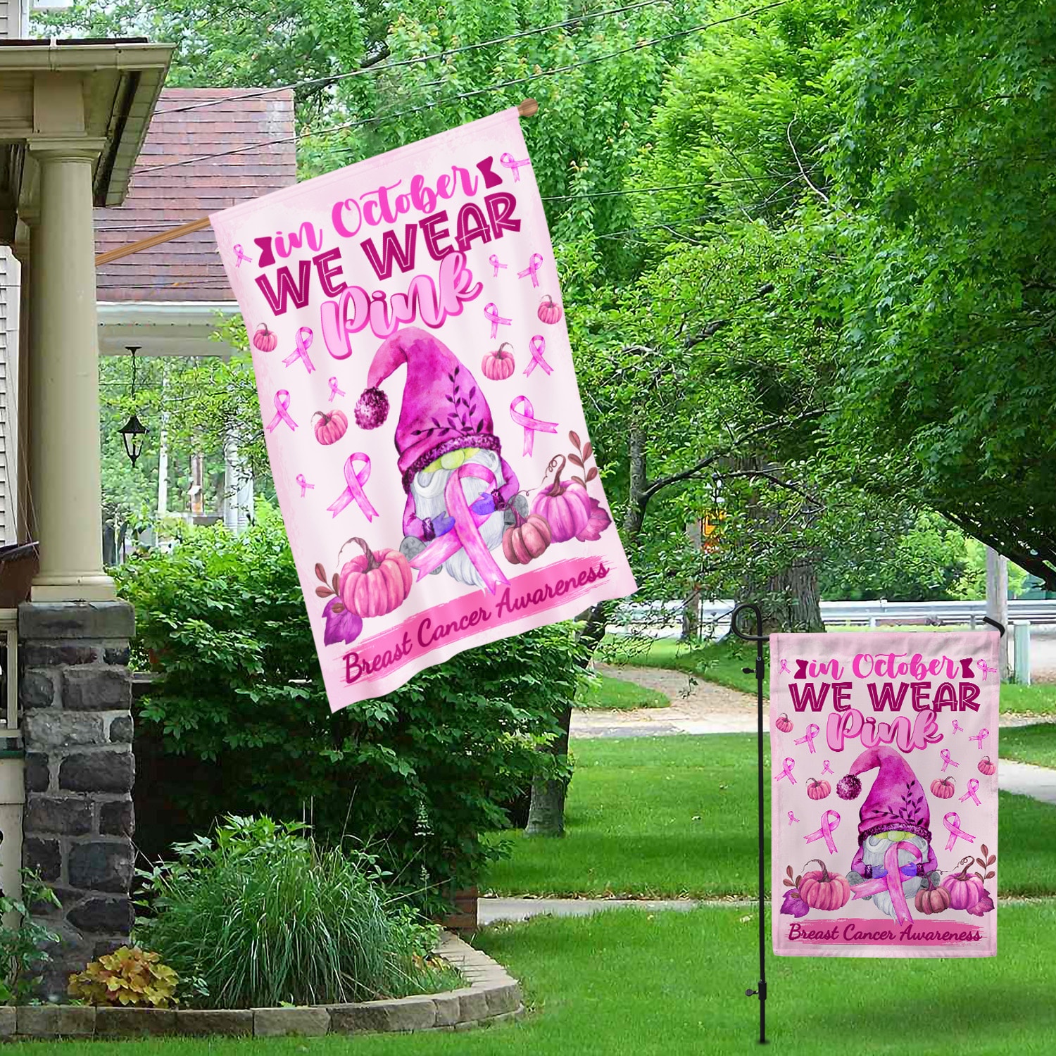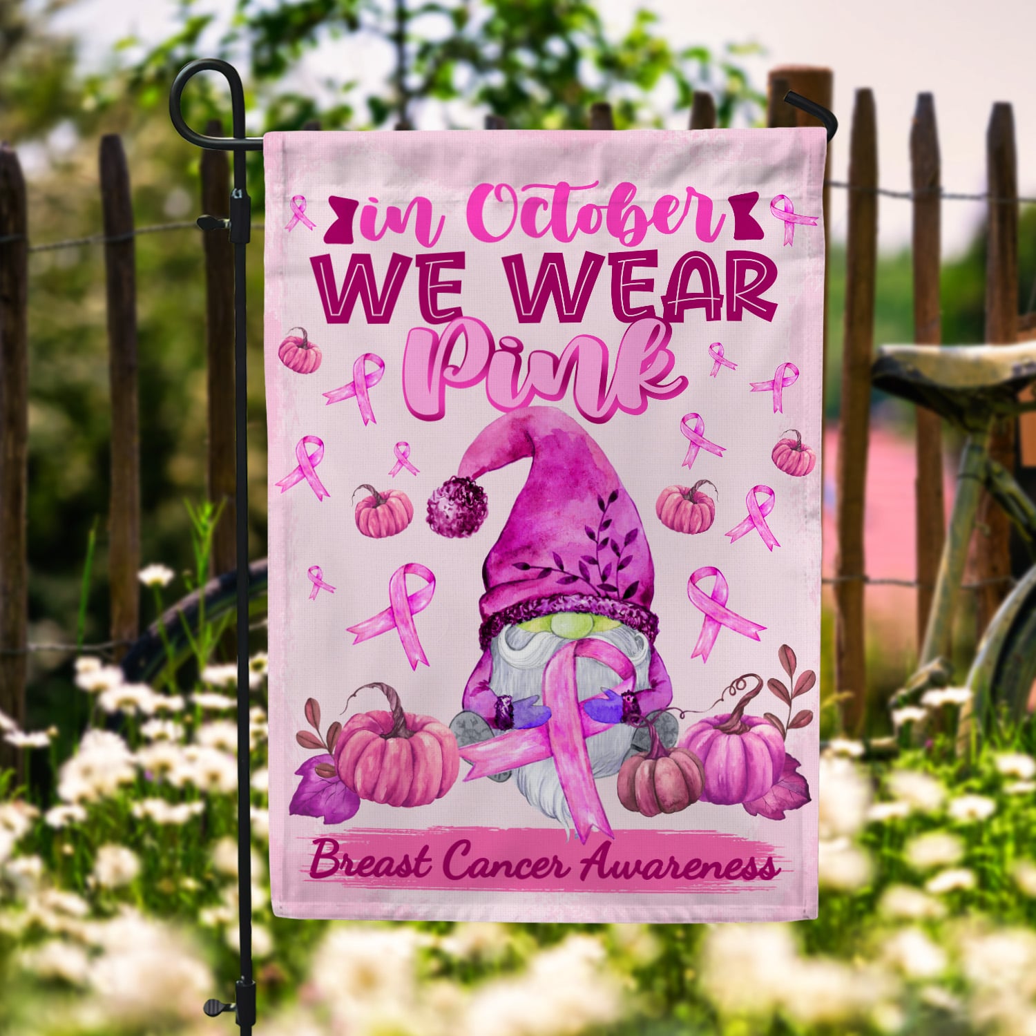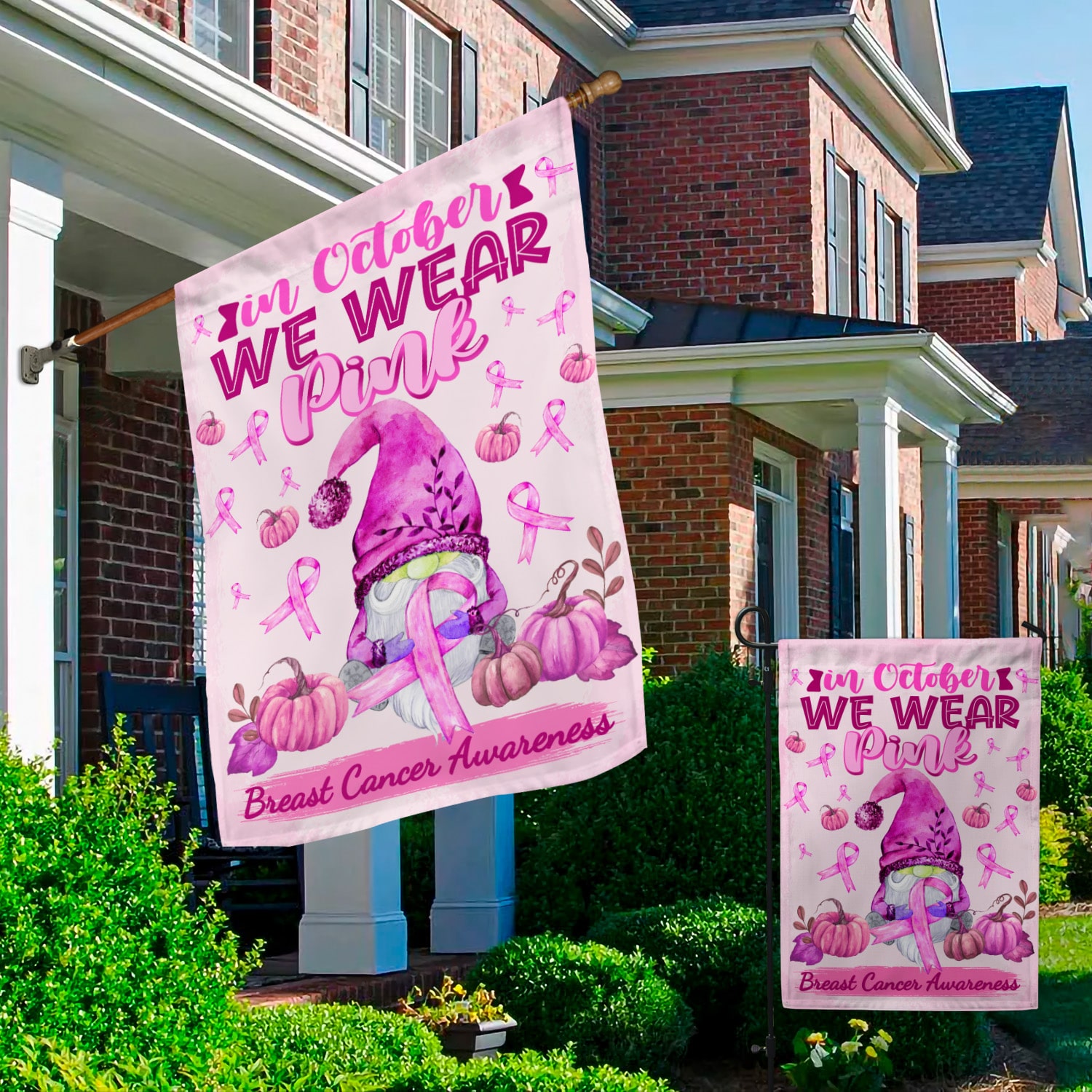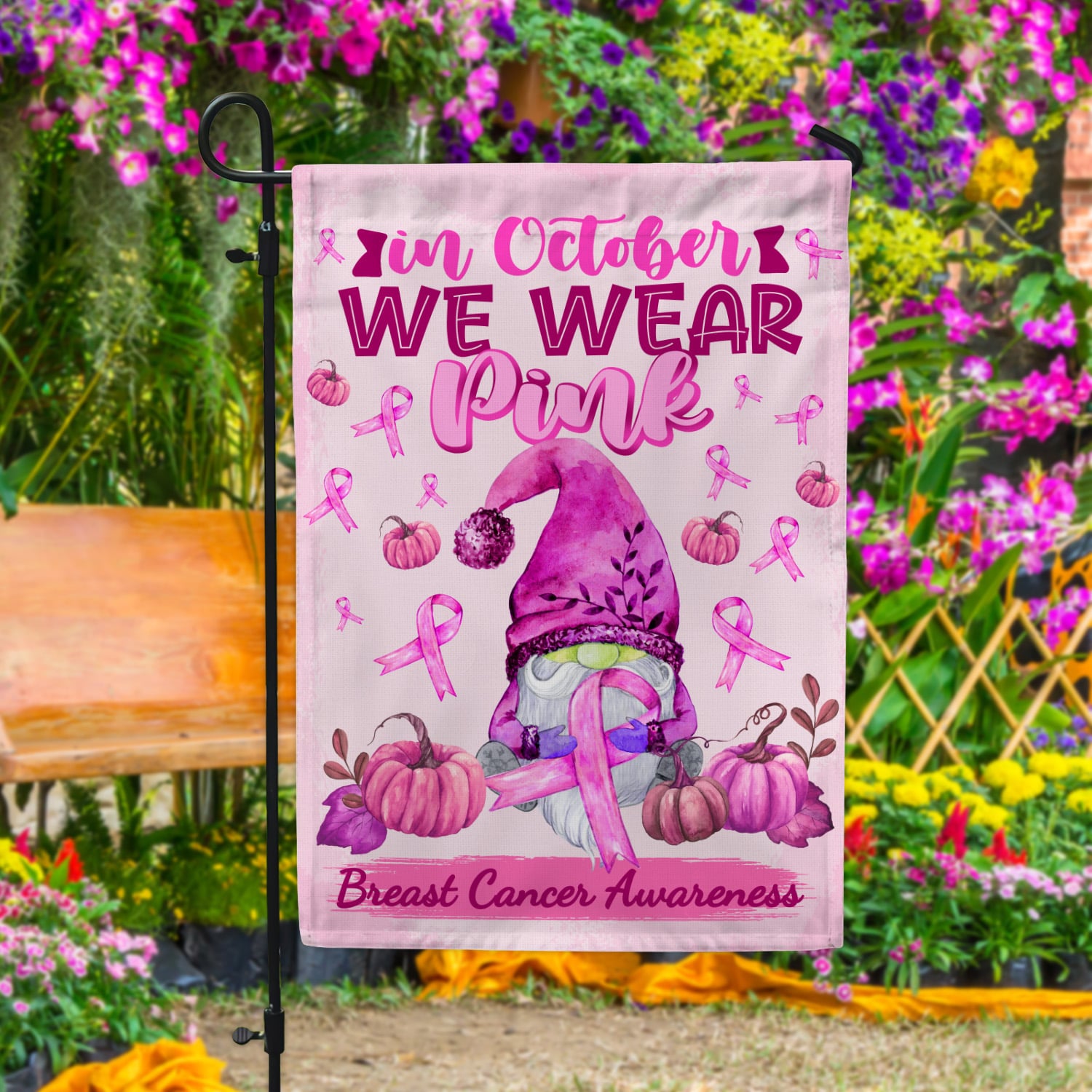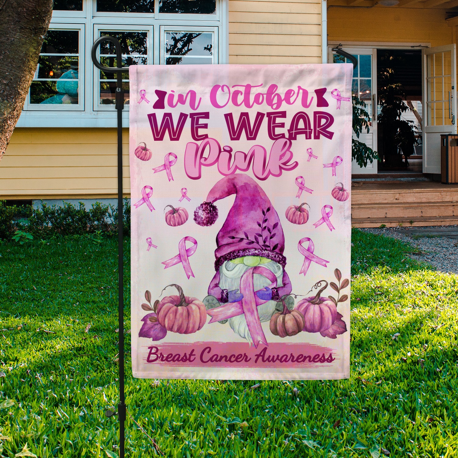 Let’s Shop Gnome In October We Wear Pink Breast Cancer Awareness Decorative Garden Flag – Indoor Outdoor Flag – House Flag!