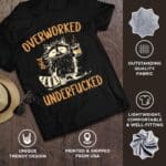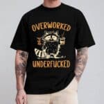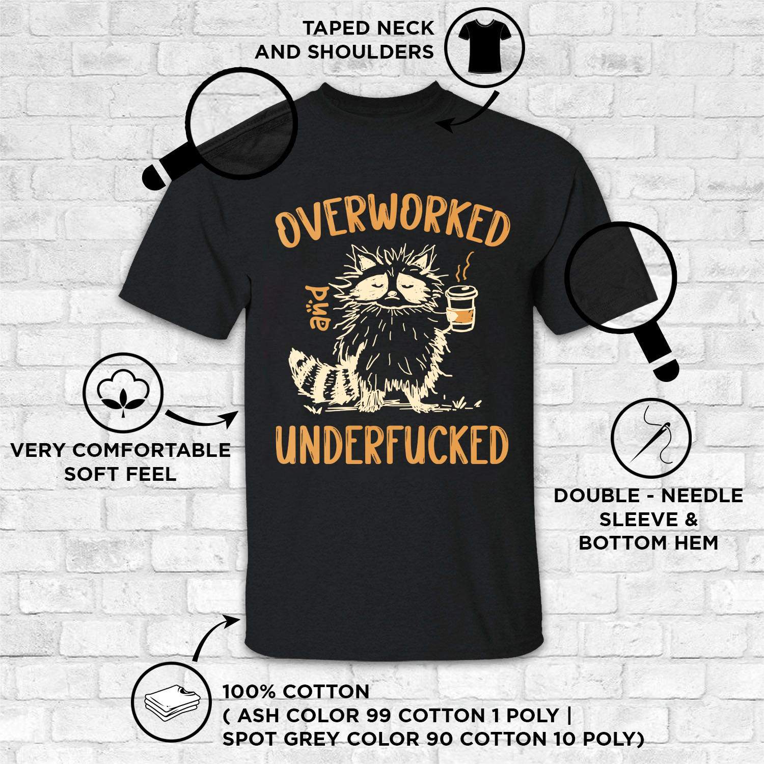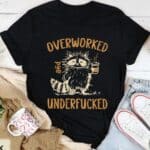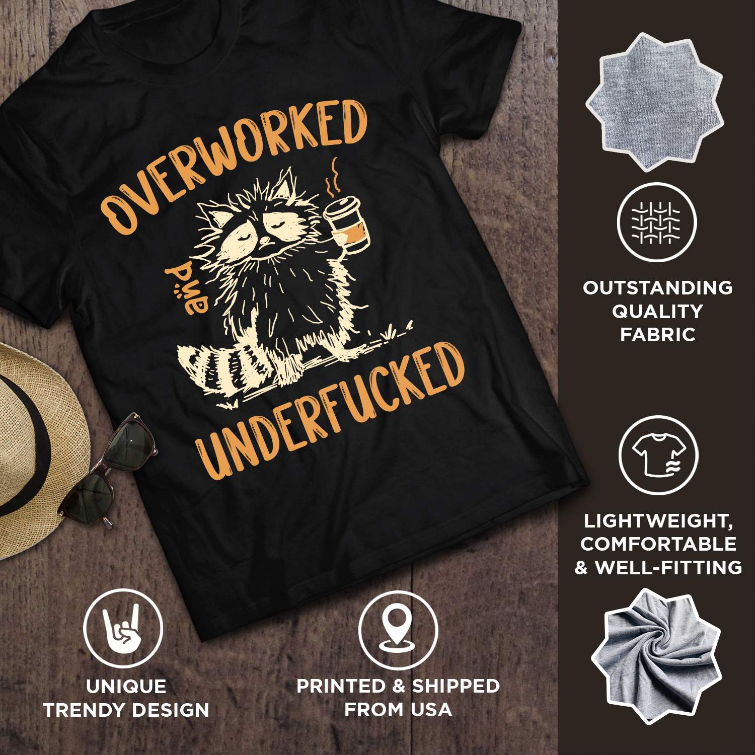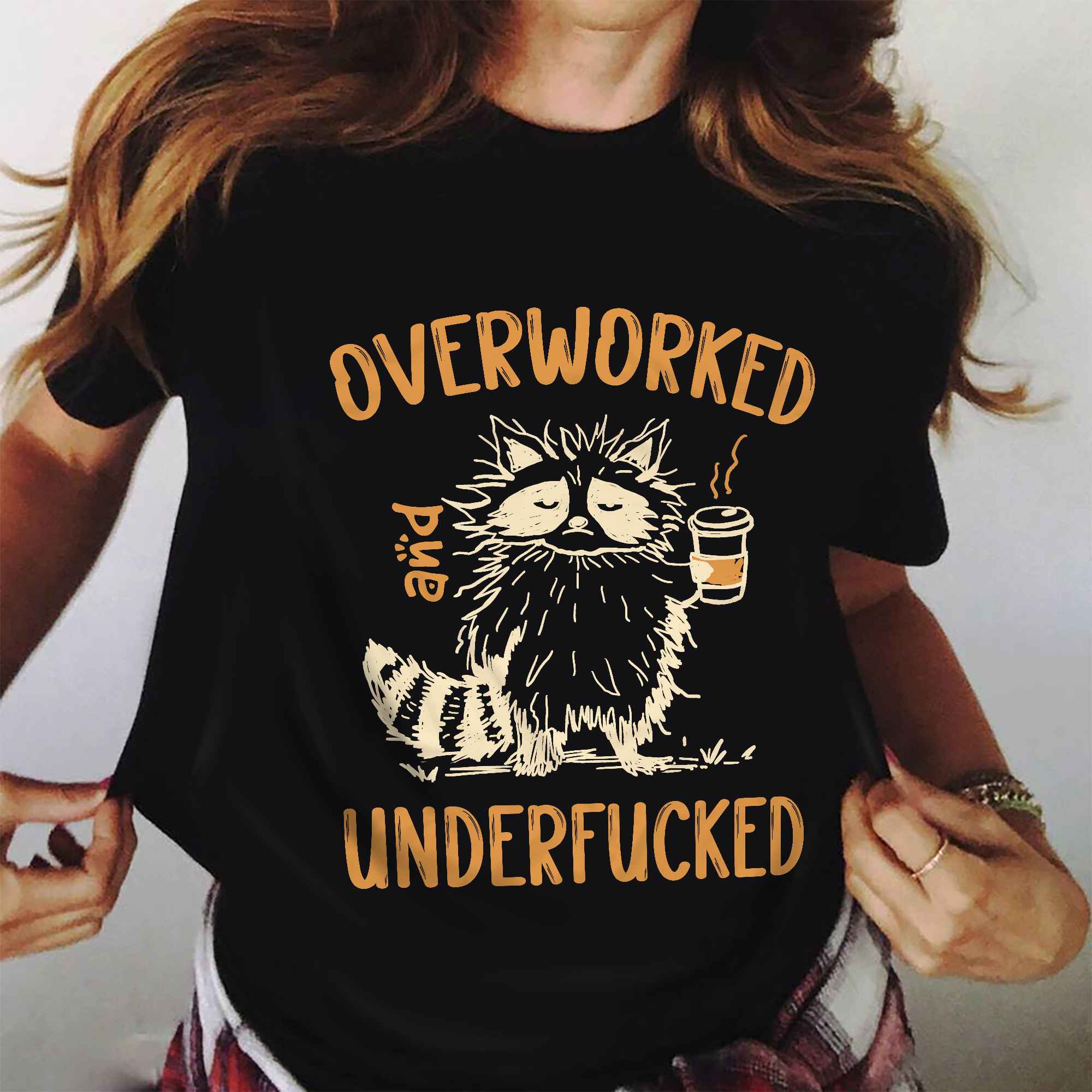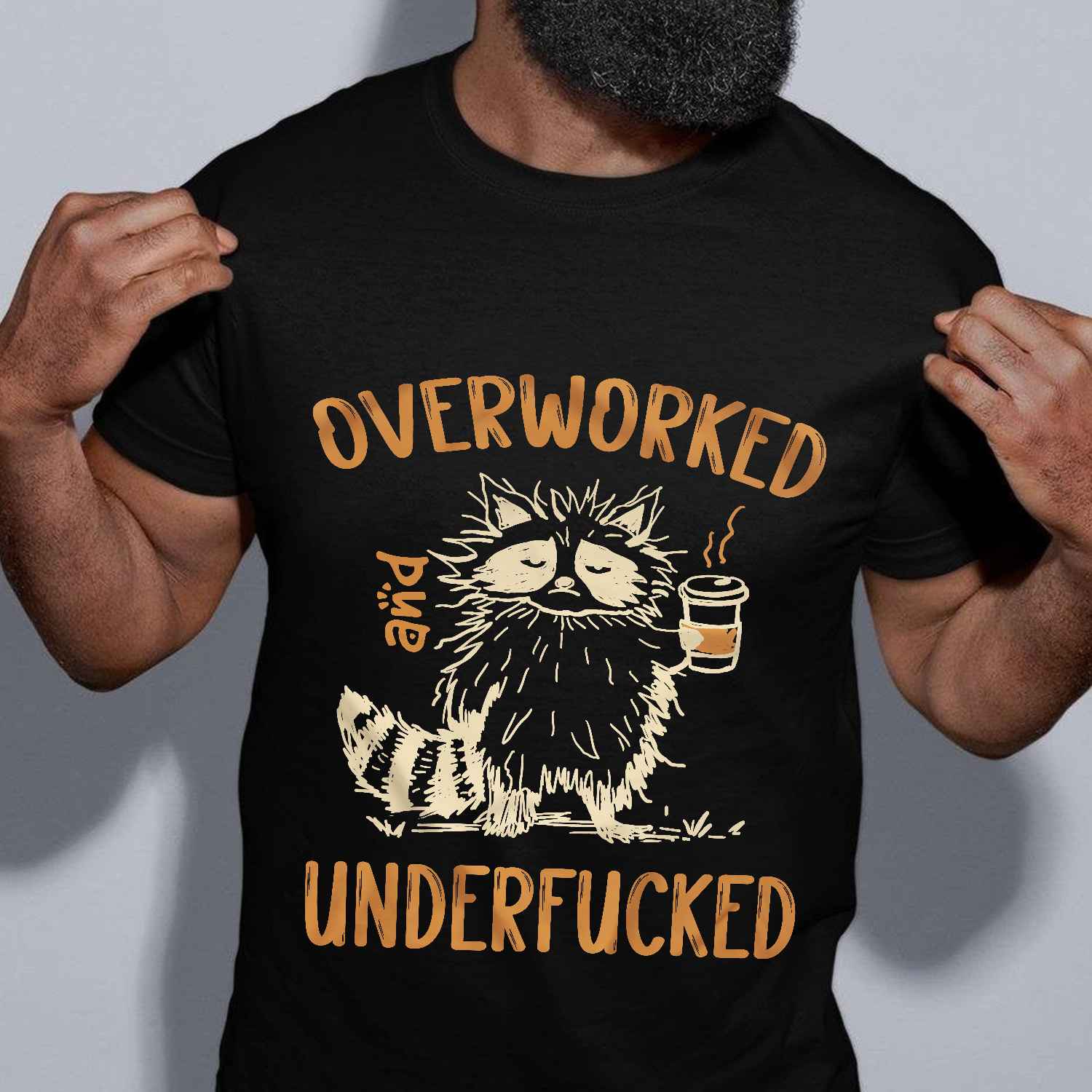 Overworked and Underfucked Funny Raccoon Coffee Work T-Shirt – V-neck Shirt