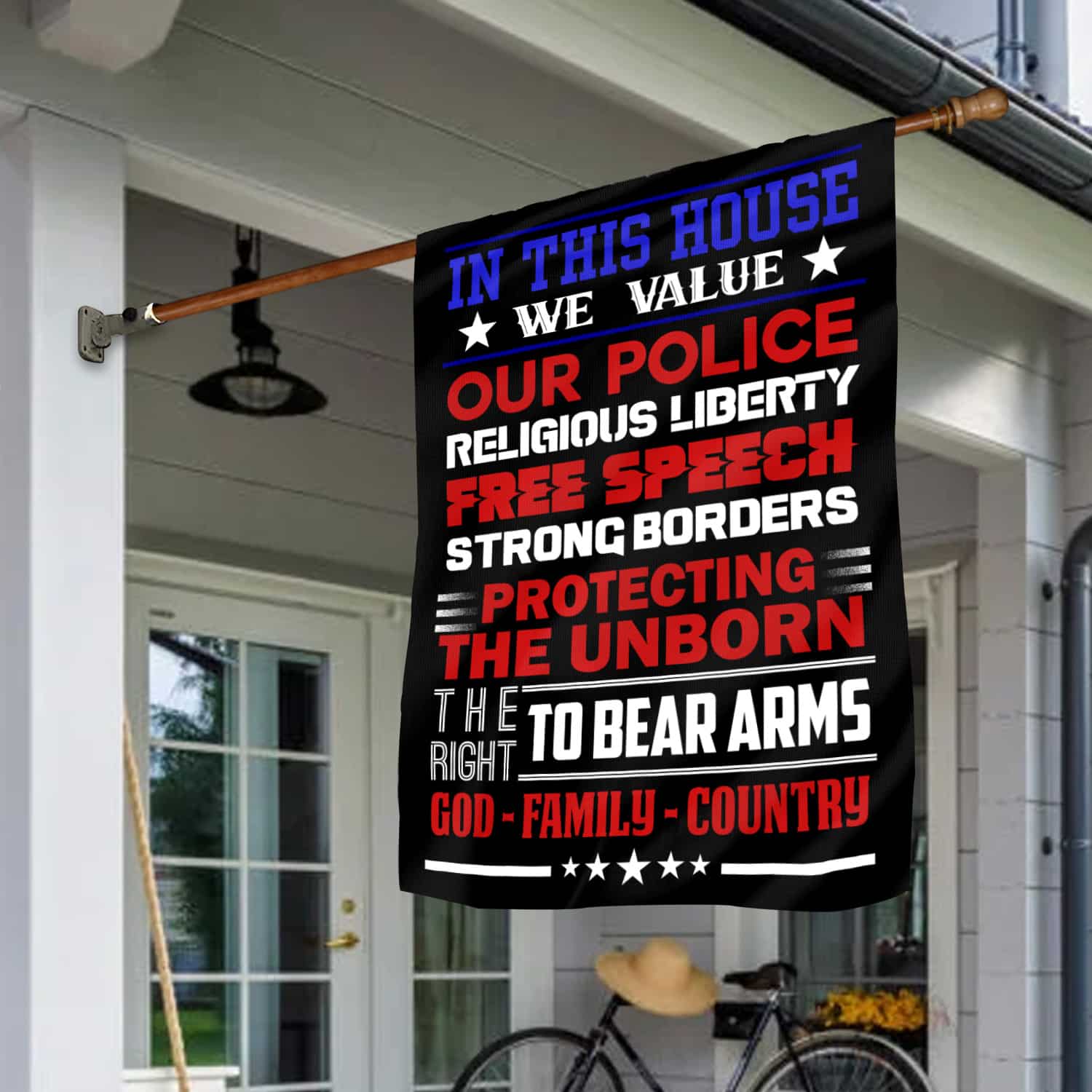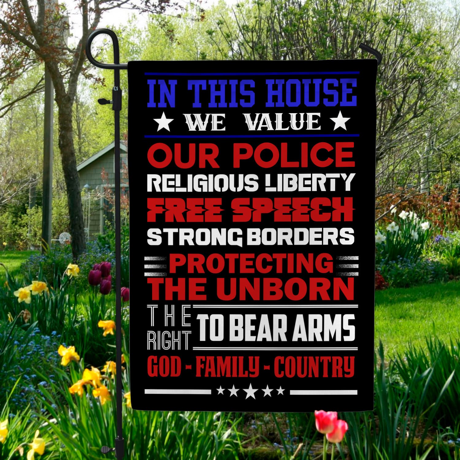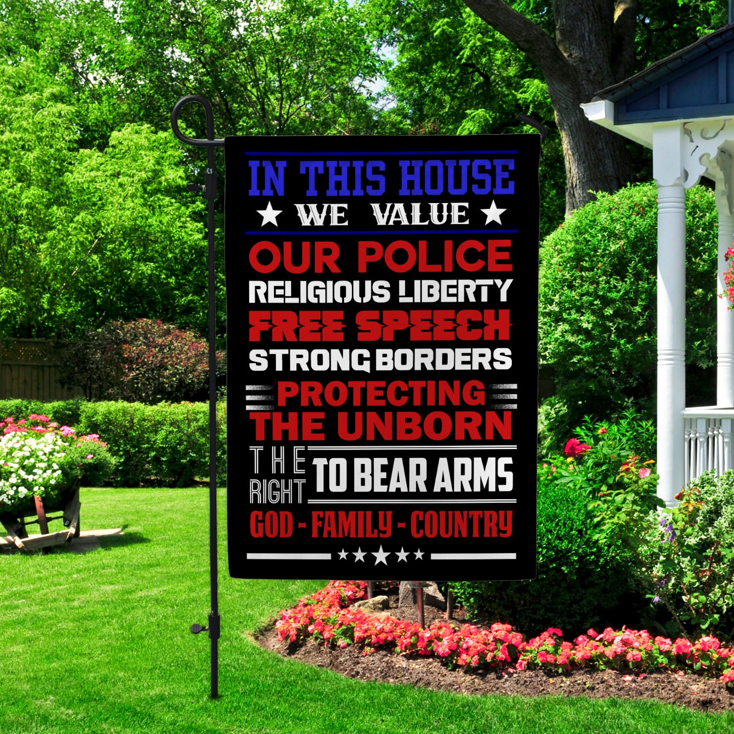 Let’s Shop In This House We Value Our Police Religious Liberty Free Speech Strong Borders Garden Flag – House Flag!