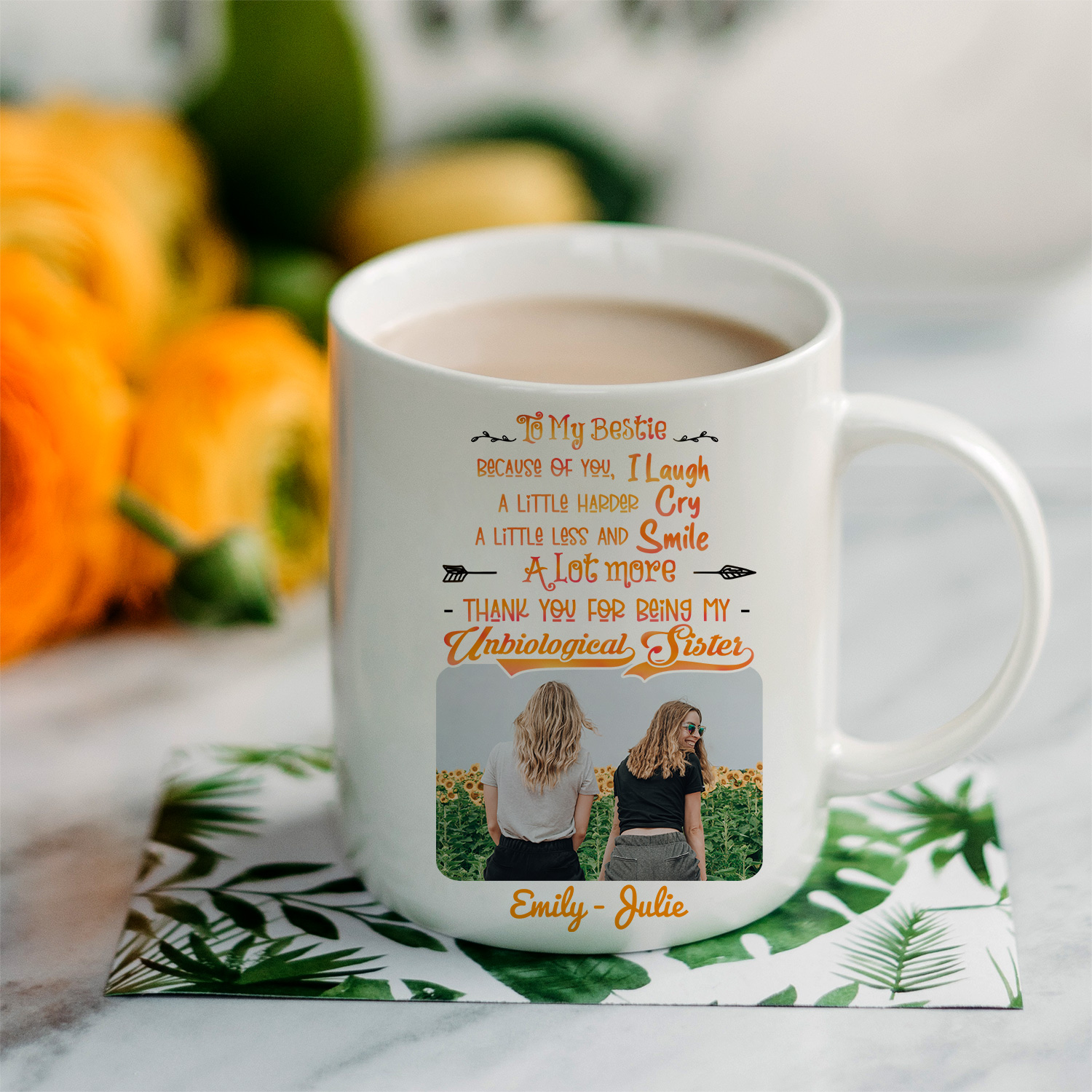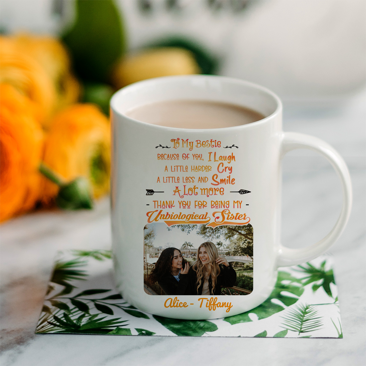 Let’s Shop Personalized Photo To My Bestie Because of You I Laugh a Little Harder Cry a Little Ceramic Coffee Mug!