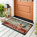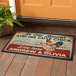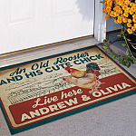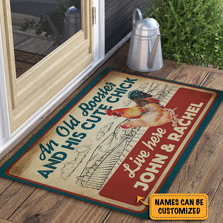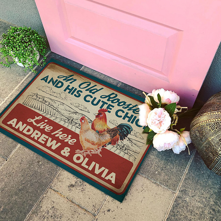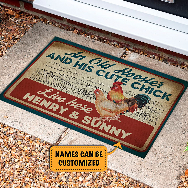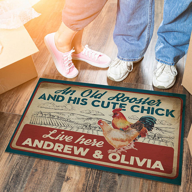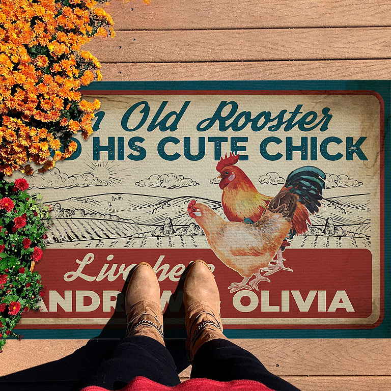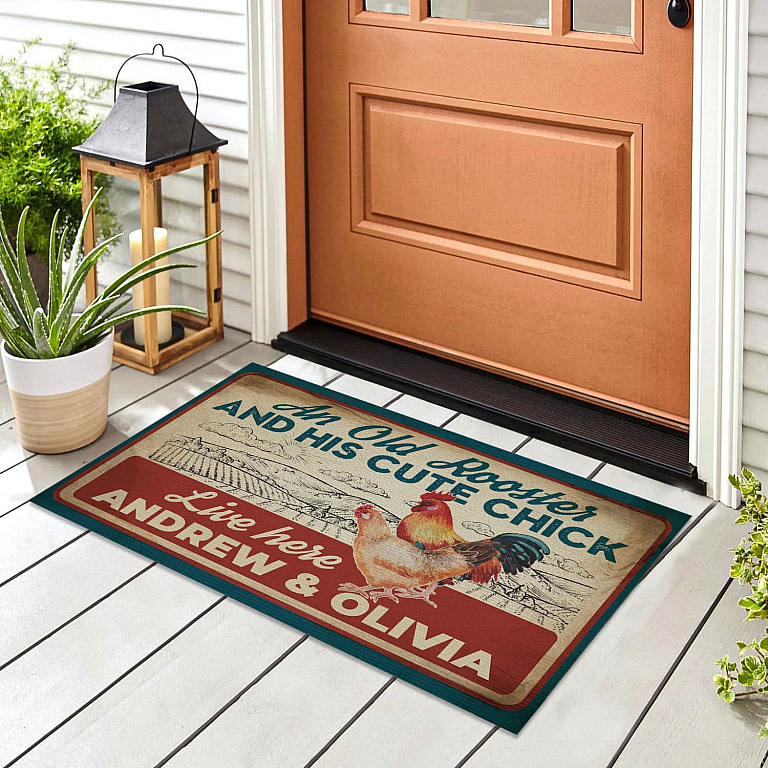 Let’s Shop Personalized An Old Rooster And His Cute Chick Live Here House Doormat – Funny Chicken Couple Outdoor Indoor Doormat!