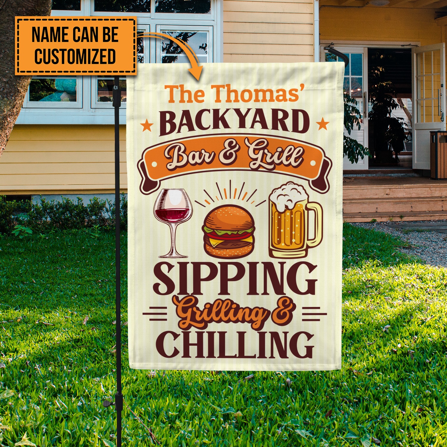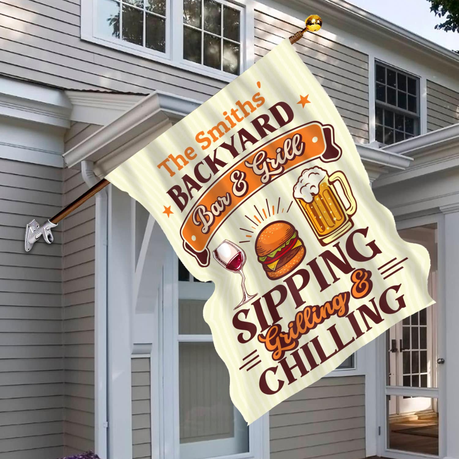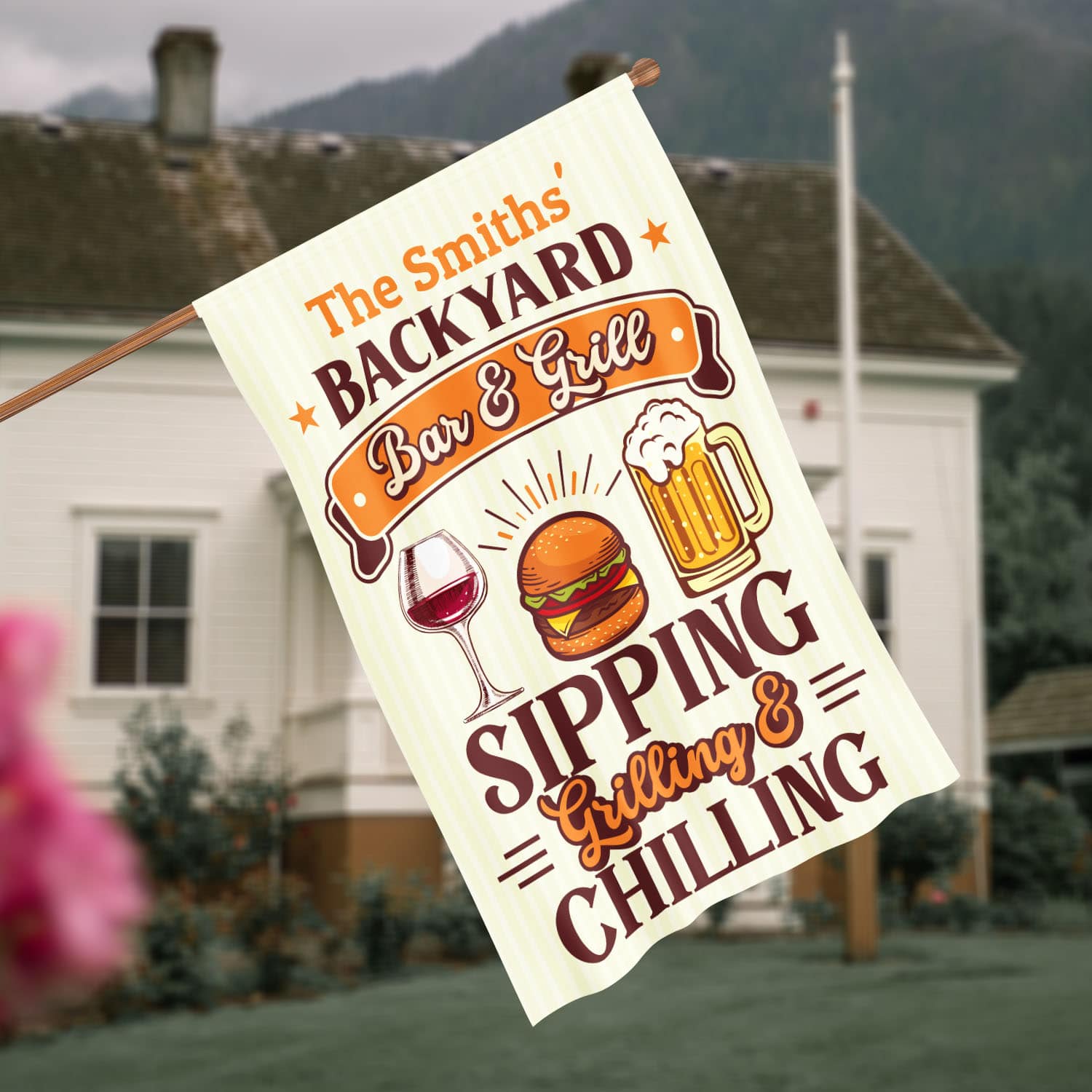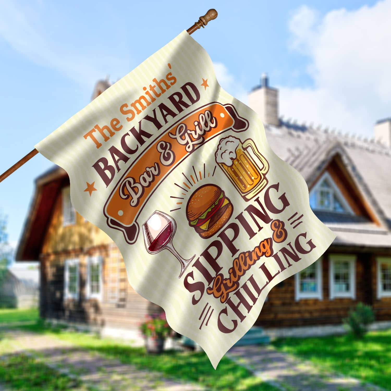 Let’s Shop Personalized Backyard Flag Backyard Bar and Grill Sipping Grilling and Chilling Garden Flag – House Flag!