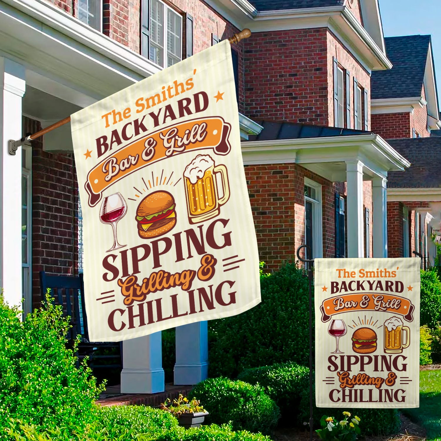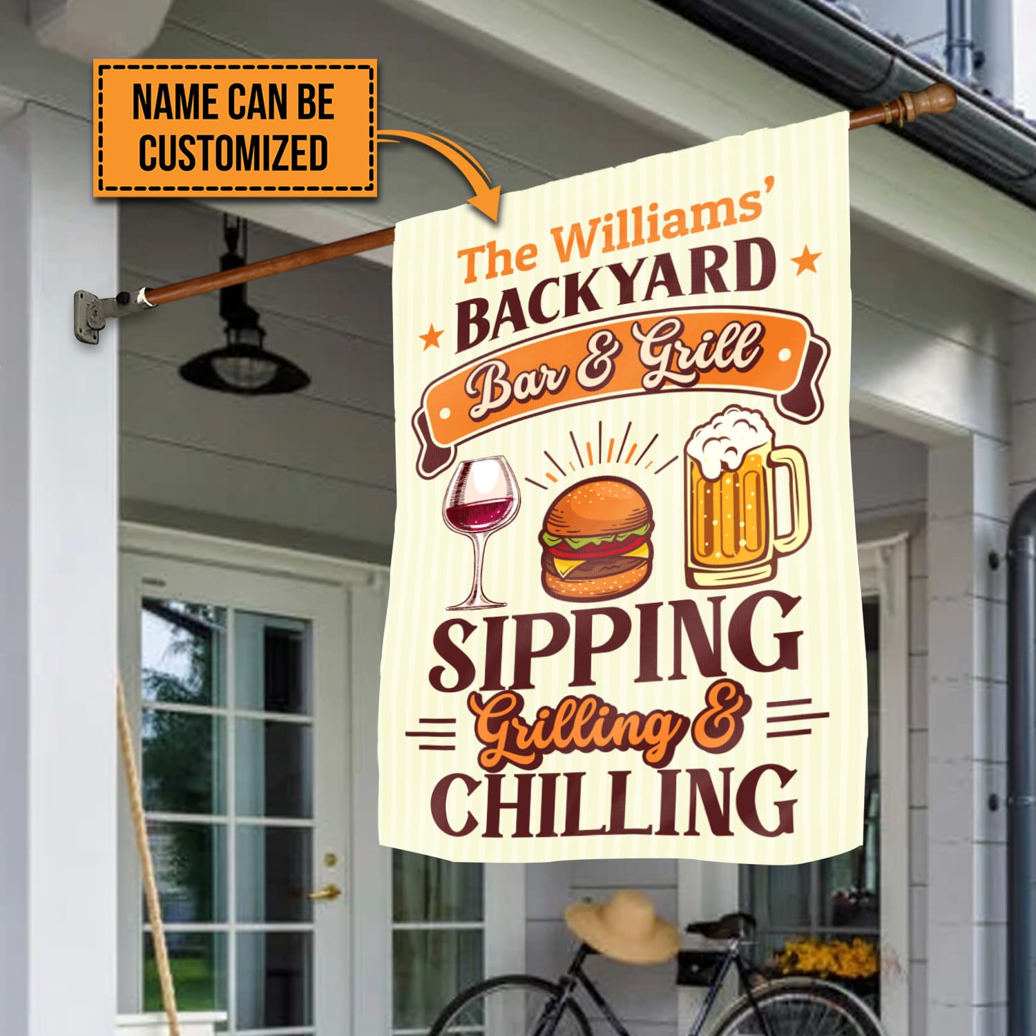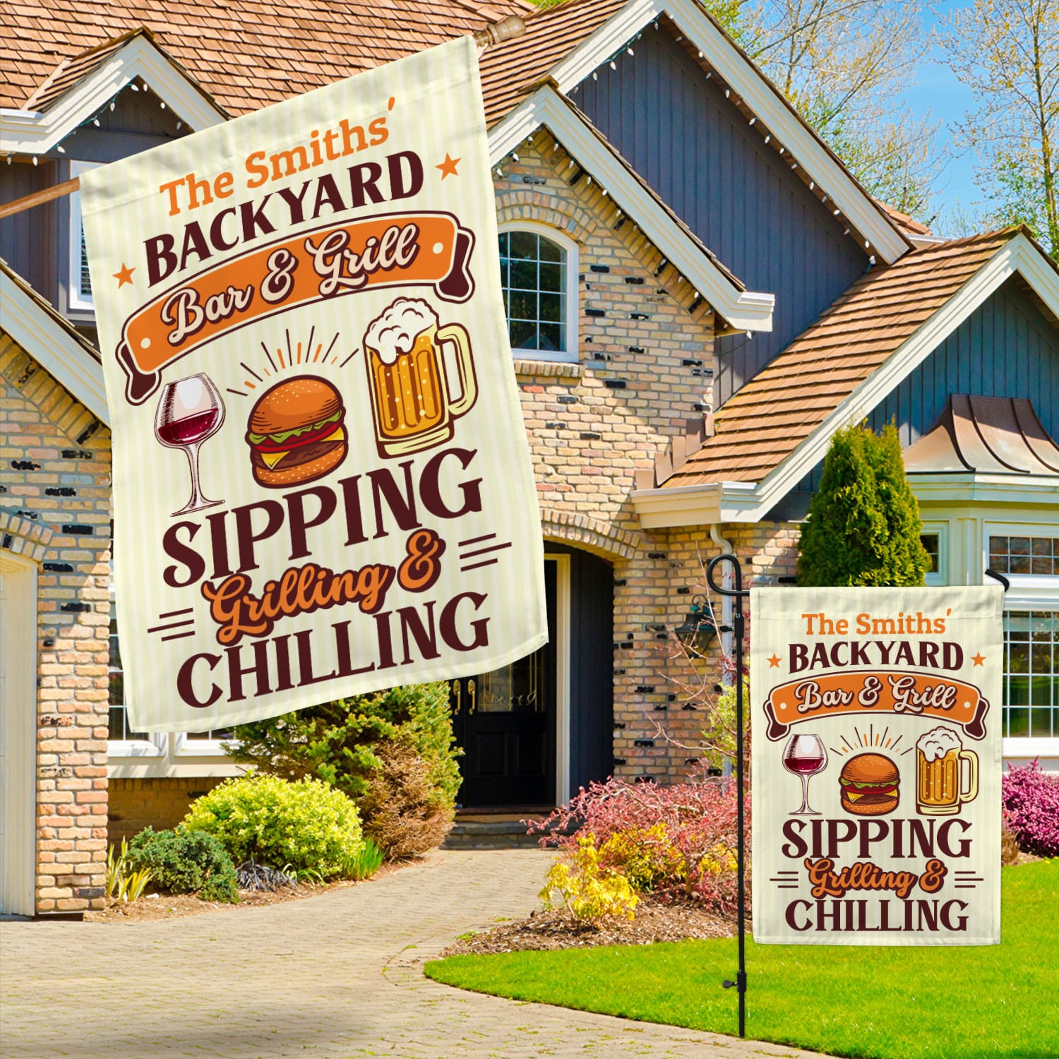 Let’s Shop Personalized Backyard Flag Backyard Bar and Grill Sipping Grilling and Chilling Garden Flag – House Flag!