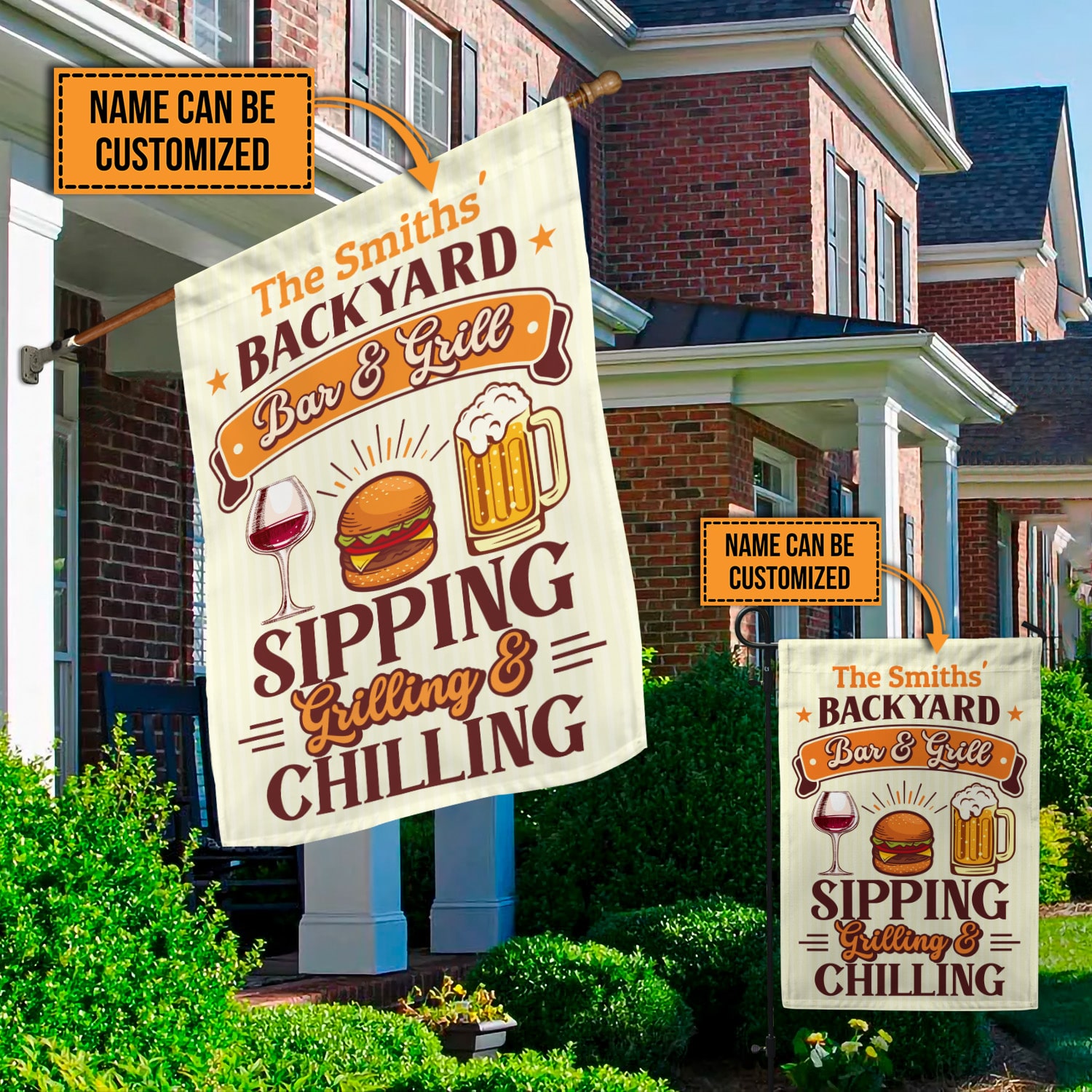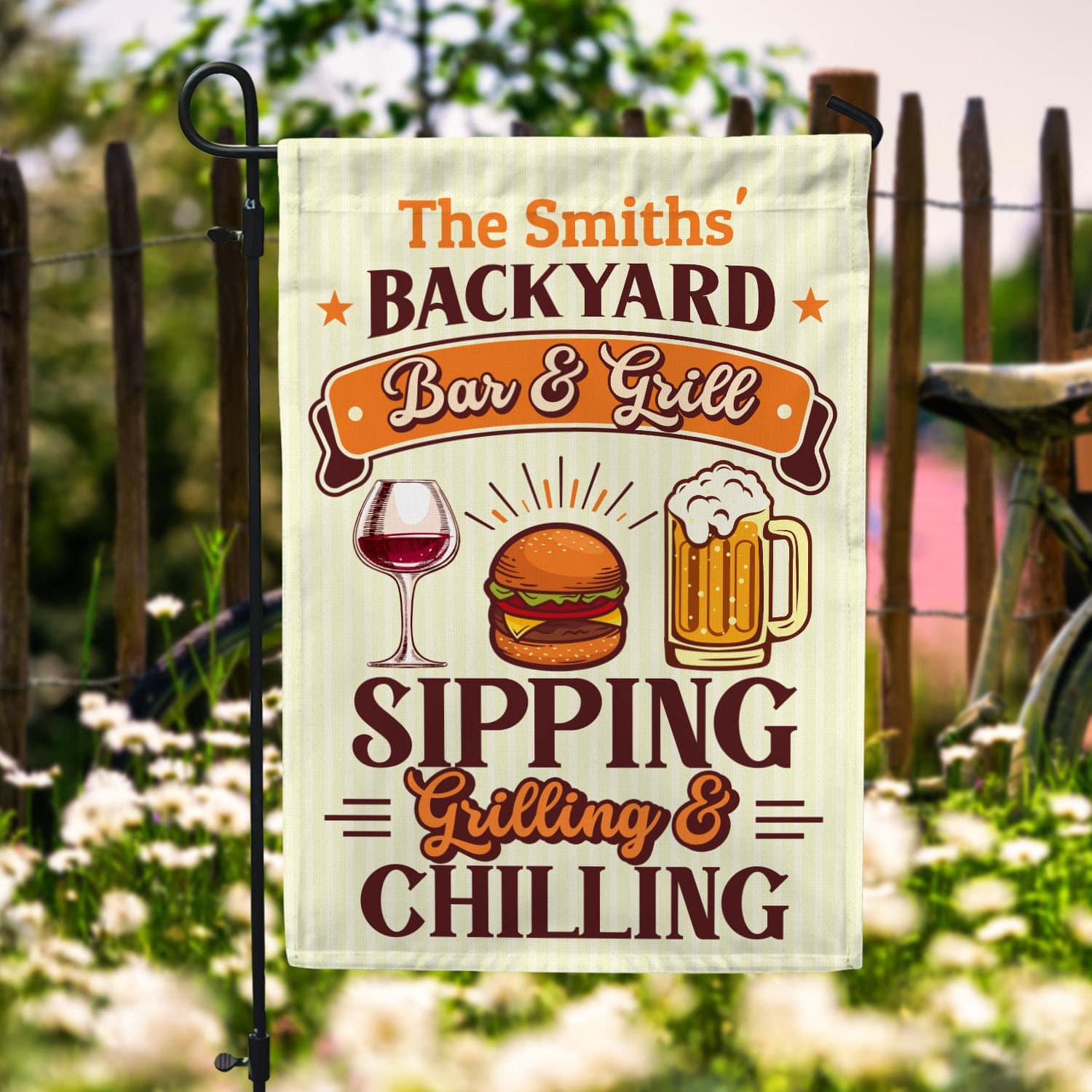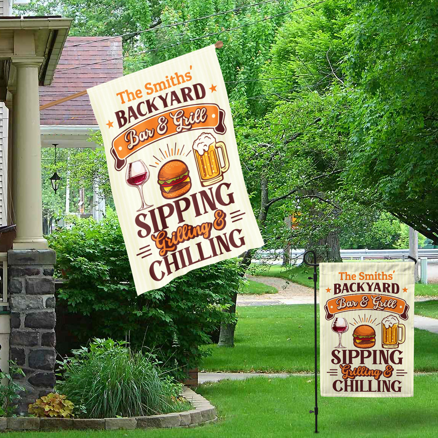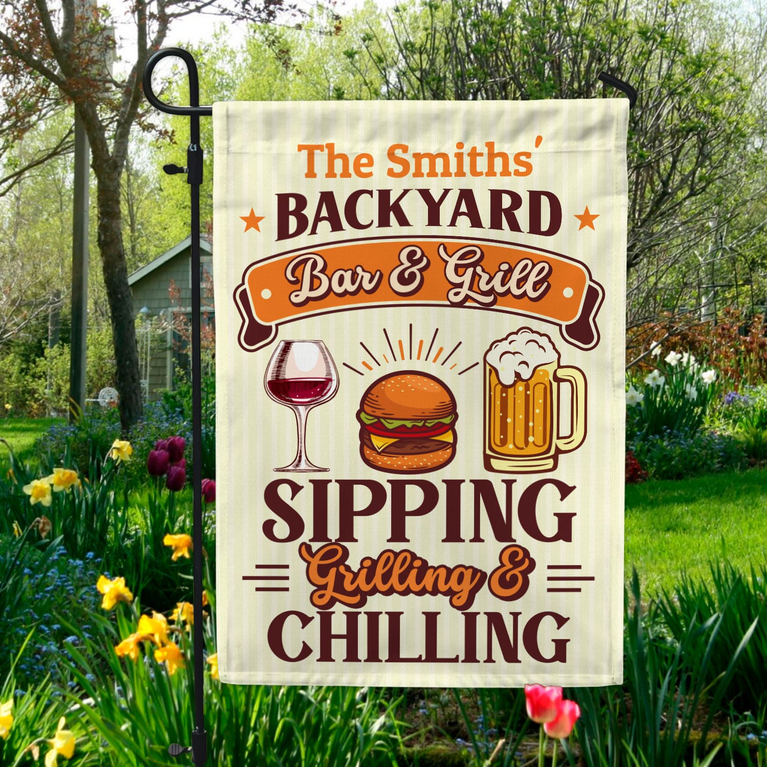Let’s Shop Personalized Backyard Flag Backyard Bar and Grill Sipping Grilling and Chilling Garden Flag – House Flag!