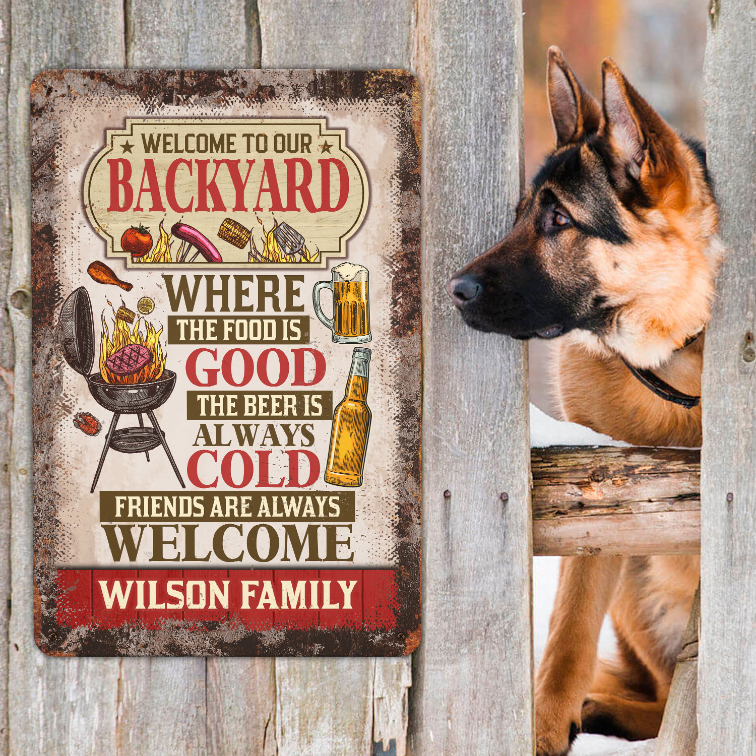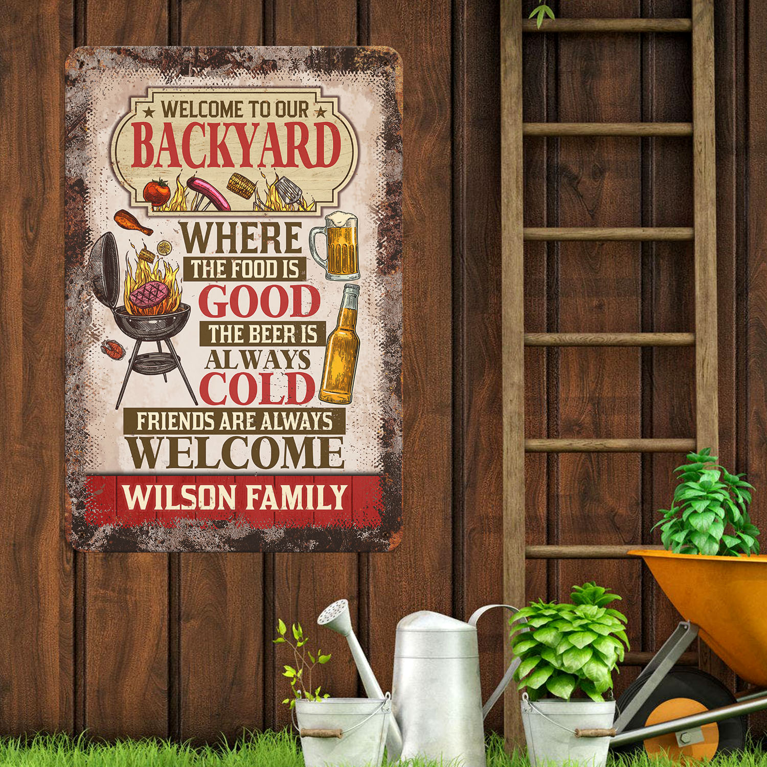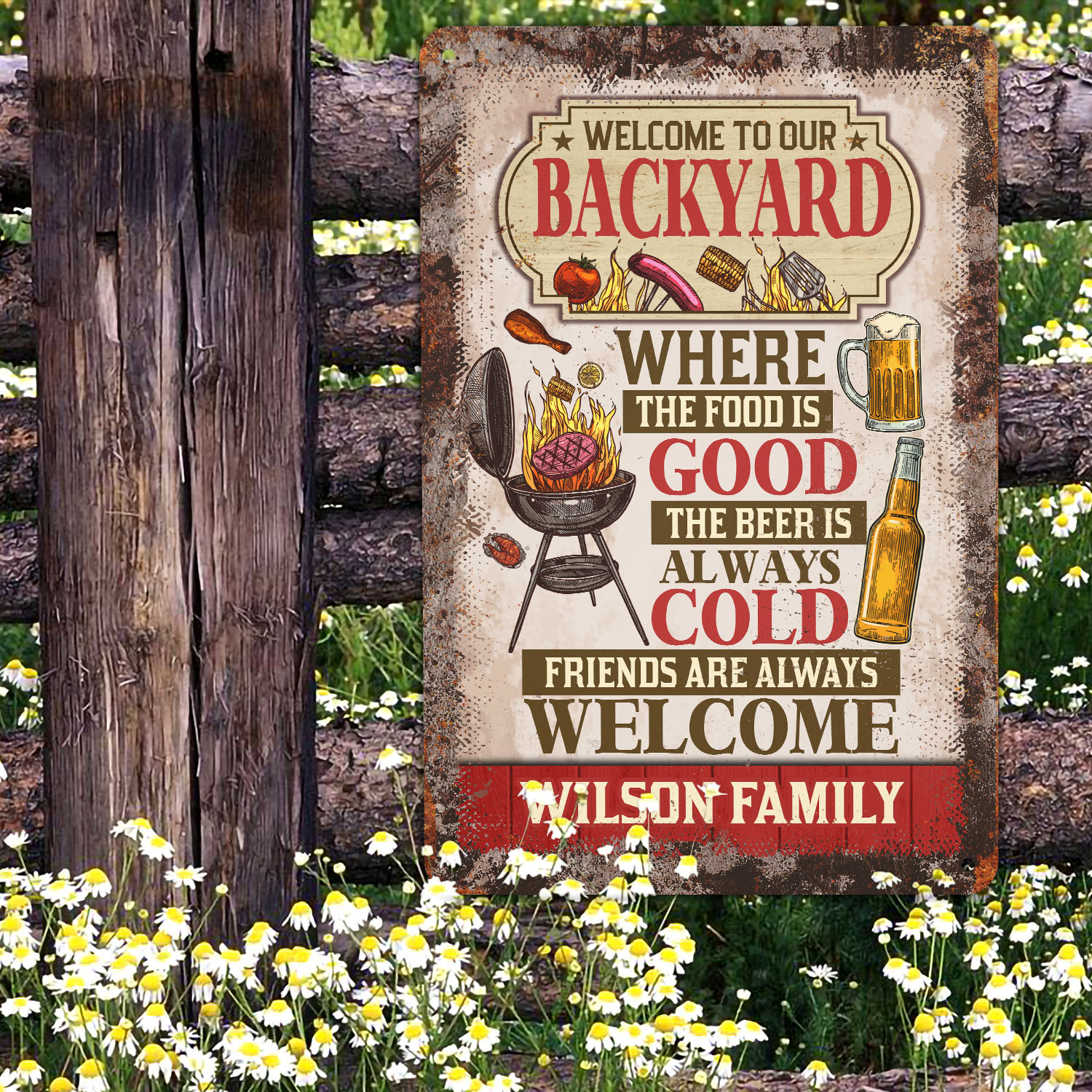 Let’s Shop Personalized Welcome To Our Backyard Where The Food Is Good The Beer Is Always Cold Decorative Metal Sign!
