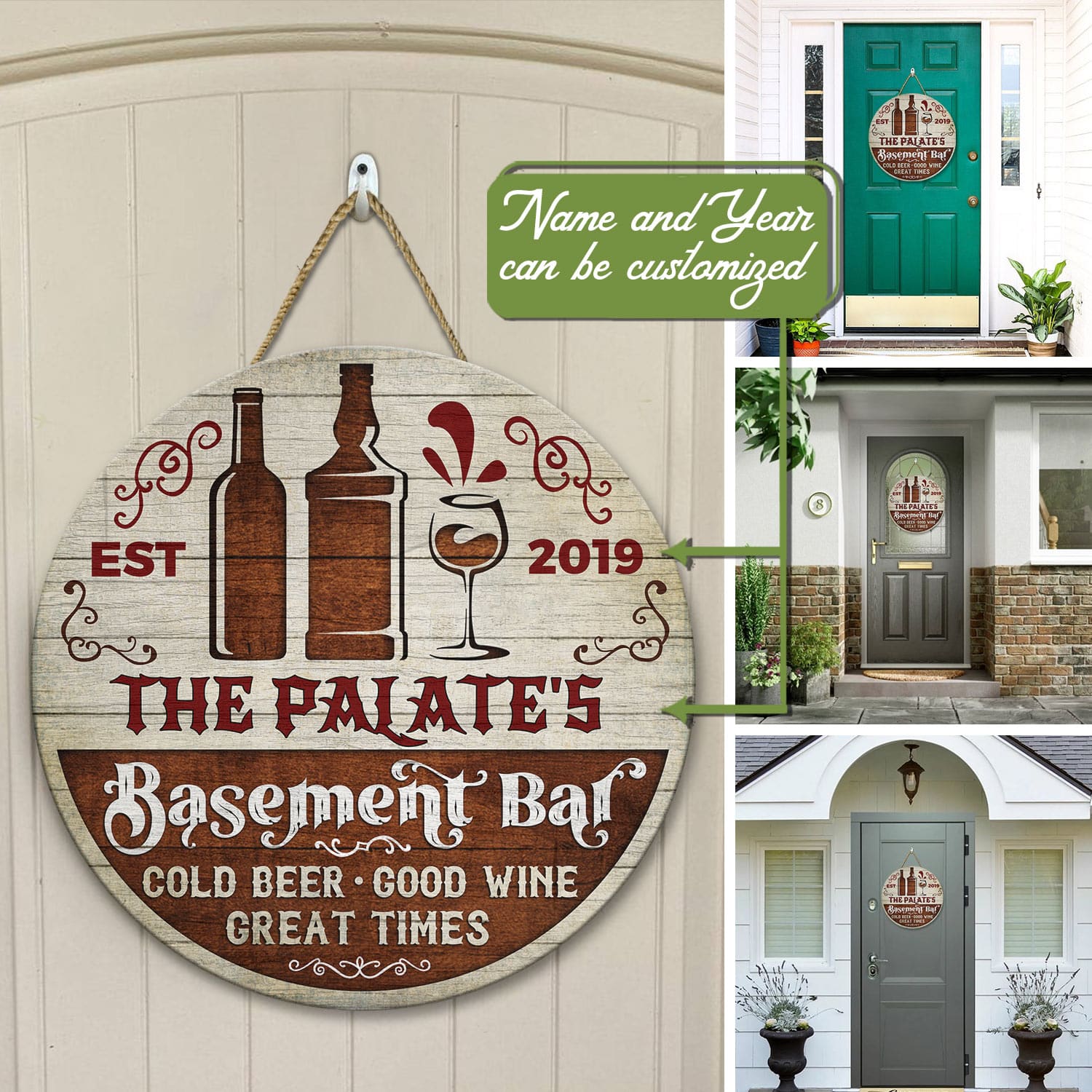 Let’s Shop Family Bar Sign Personalized Basement Bar Cold Beer Good Wine Great Times Circle Wooden Door Sign – Front Porch Sign!