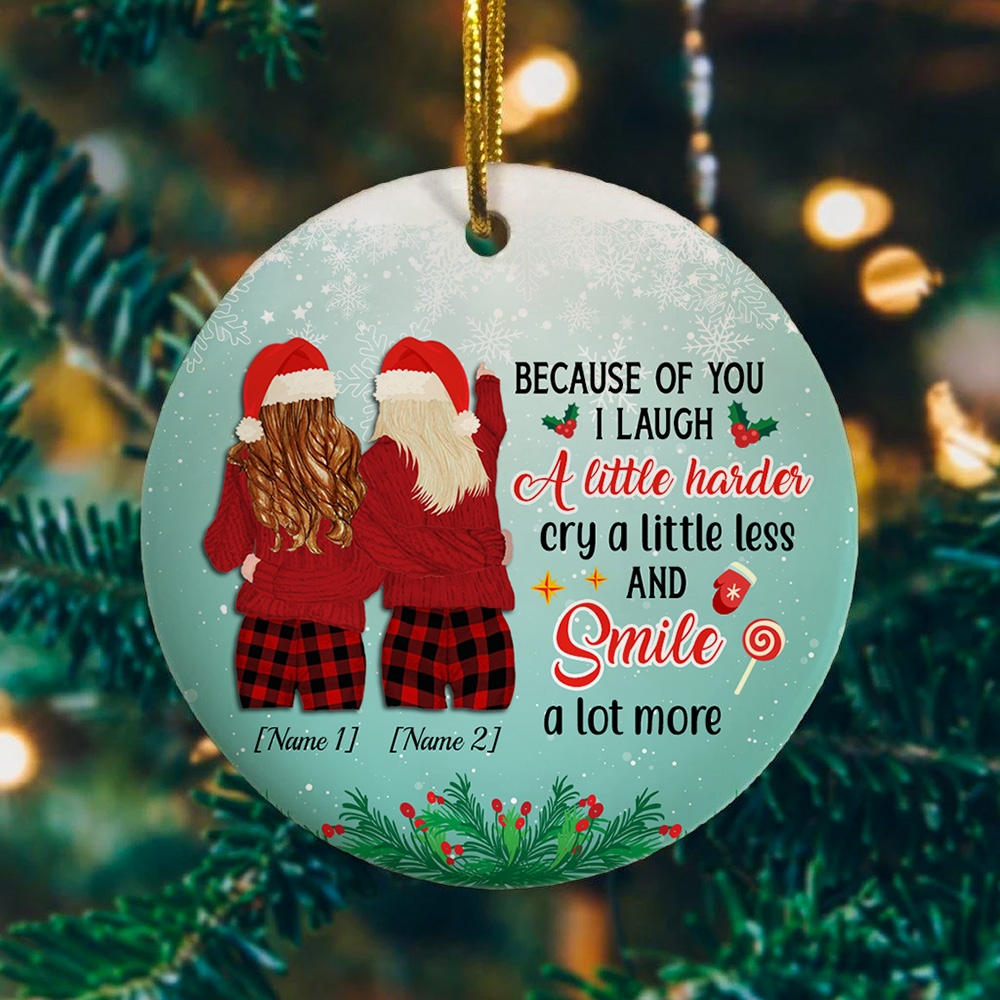 Let’s Shop Personalized Best Friends Christmas Because Of You I Laugh So A Little Harder Bestie Decorative Circle Ornament!
