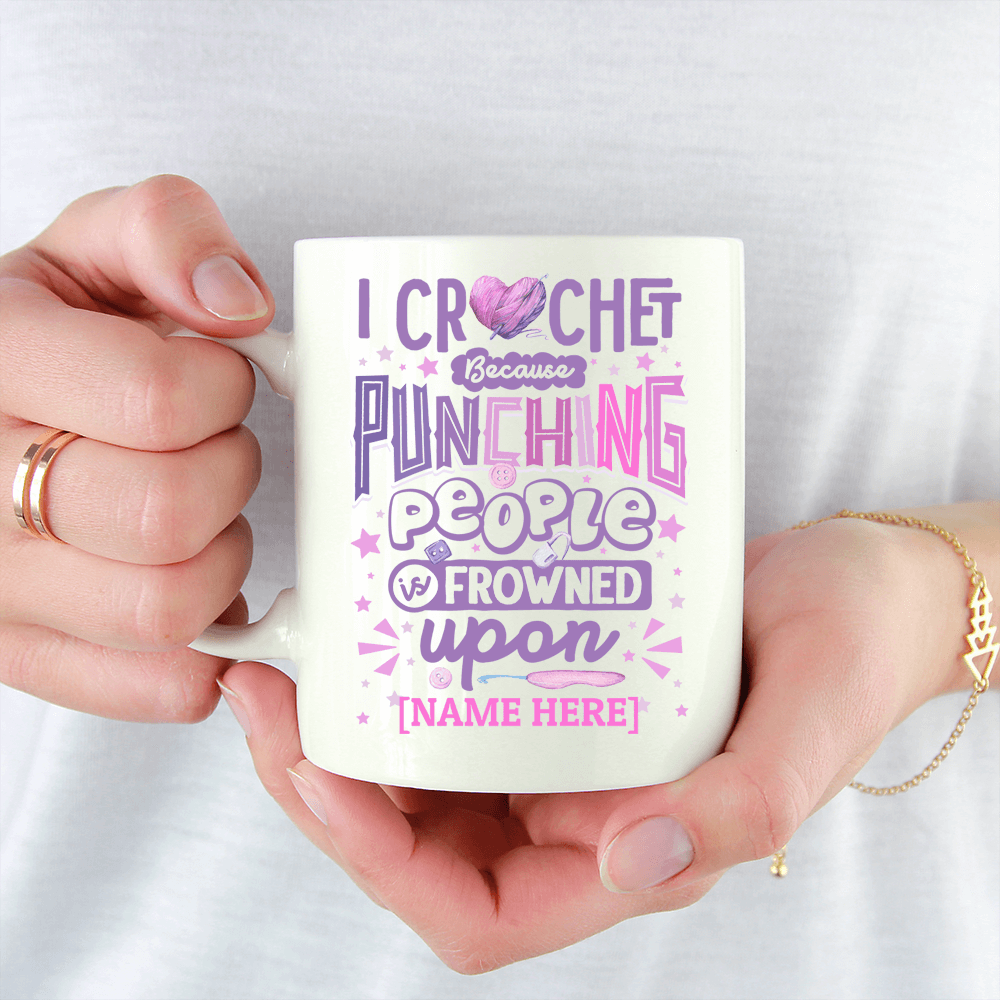 Shop Personalized I Crochet Because Punching People Is Frowned Upon Ceramic Coffee Mug – Beer Stein – Water Bottle.