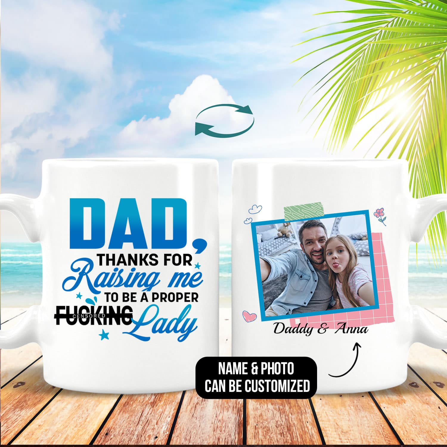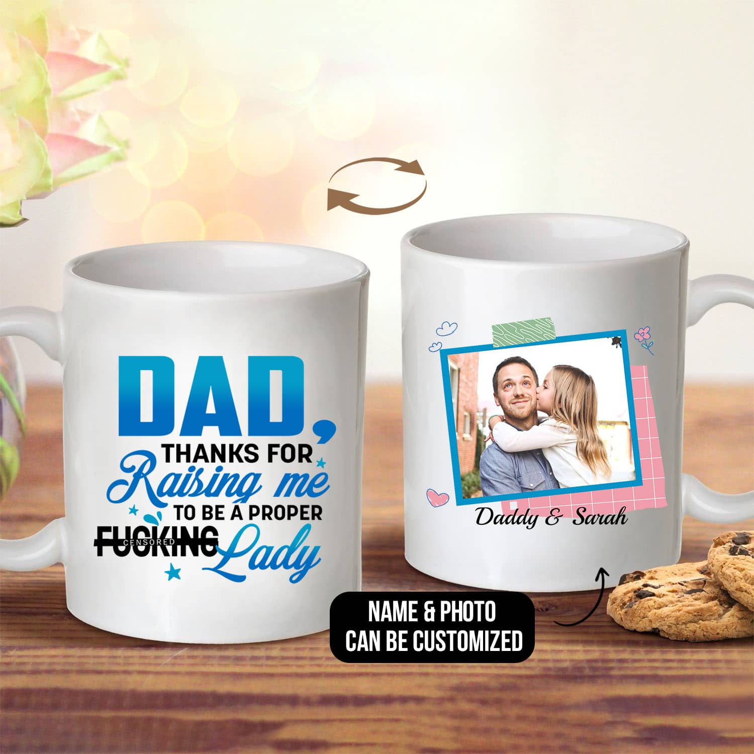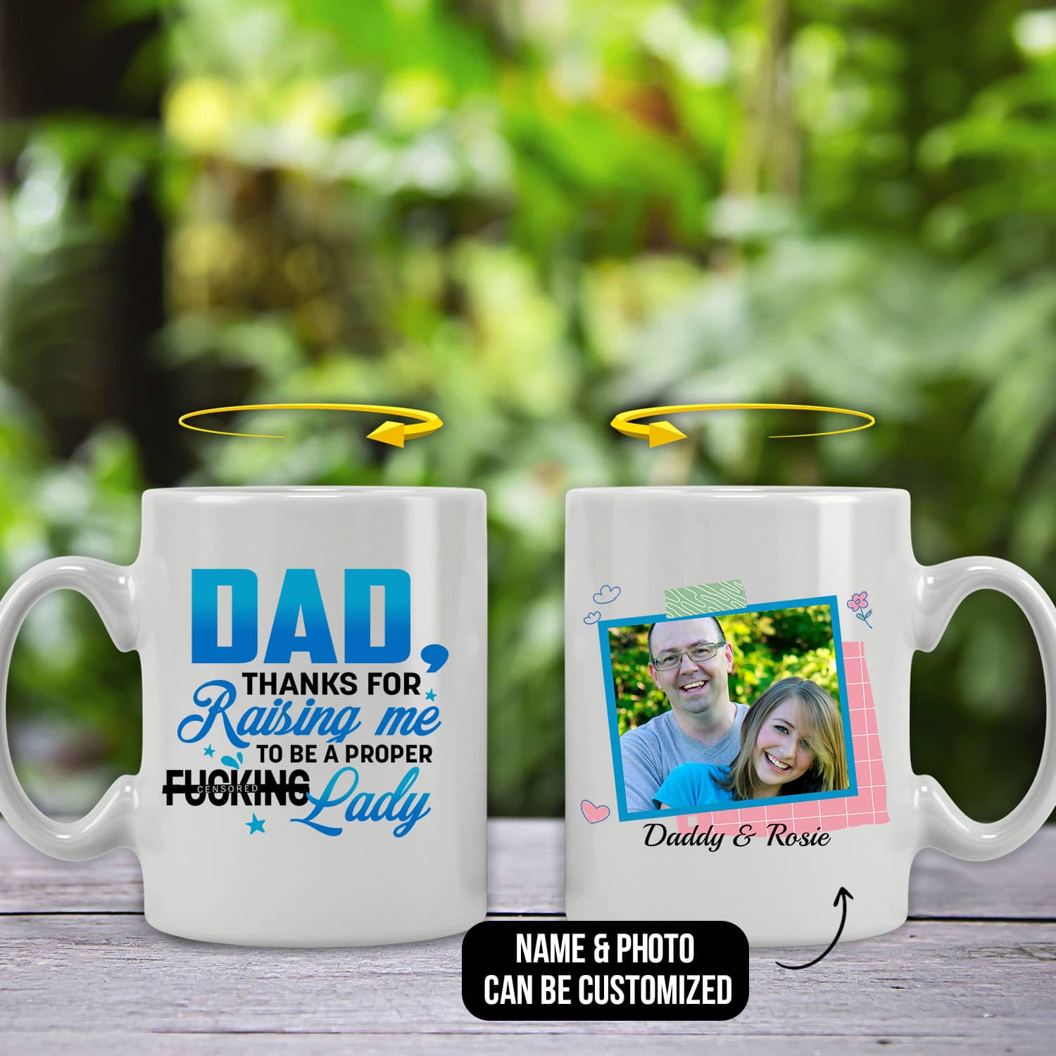 Let’s Shop Personalized Photo Dad Thanks for Raising Me to Be a Proper Fucking Lady Two Sided Ceramic Coffee Mug!