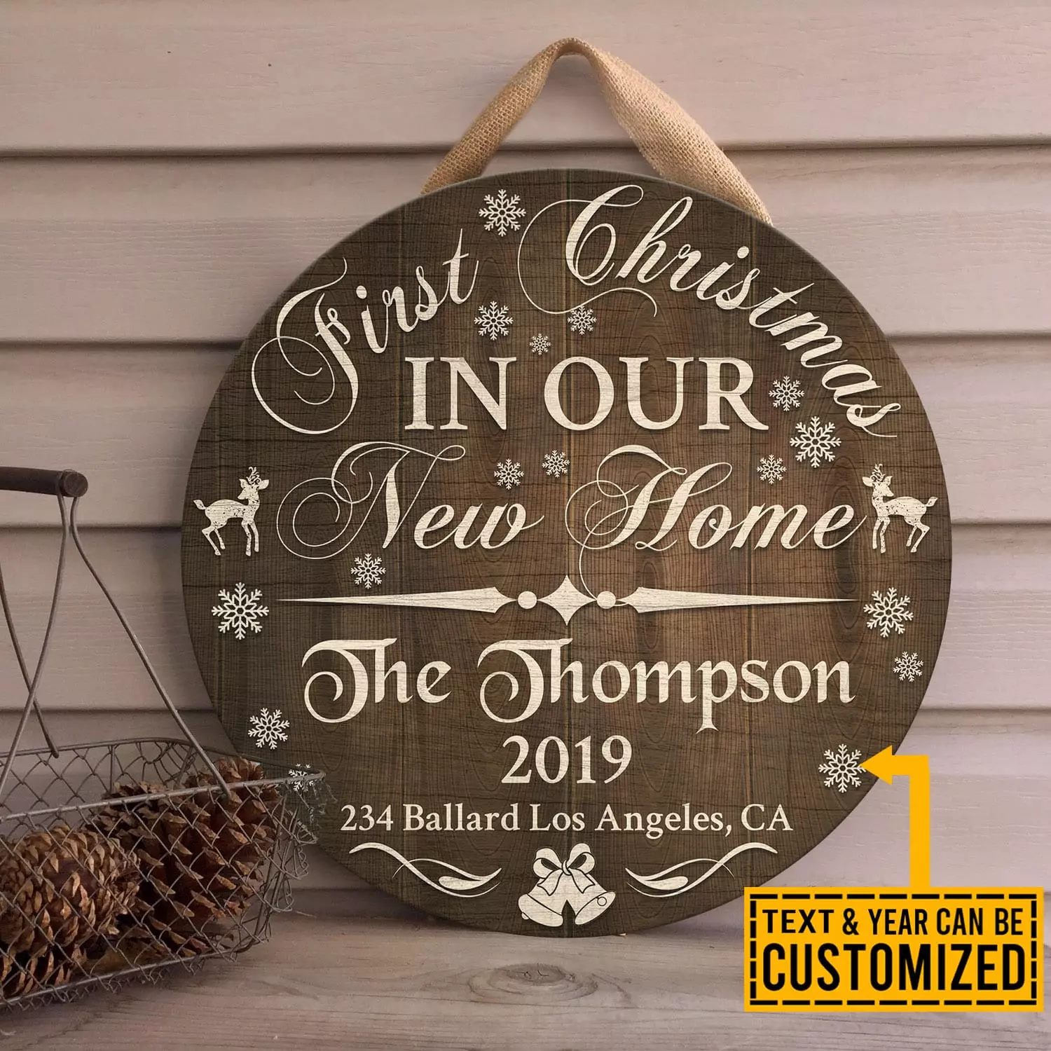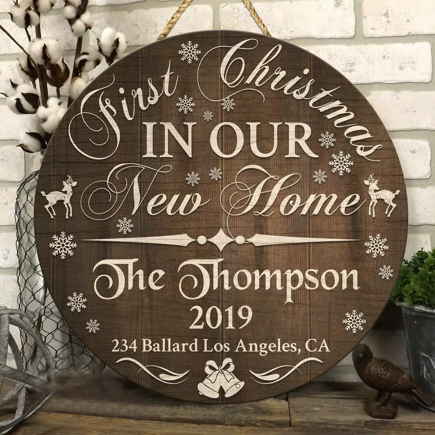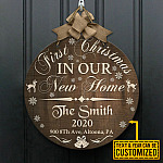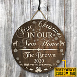 Let’s Shop Personalized Family Name First Christmas in Our New Home Decorative Circle Wooden Door Sign – New House Christmas Decor Sign!