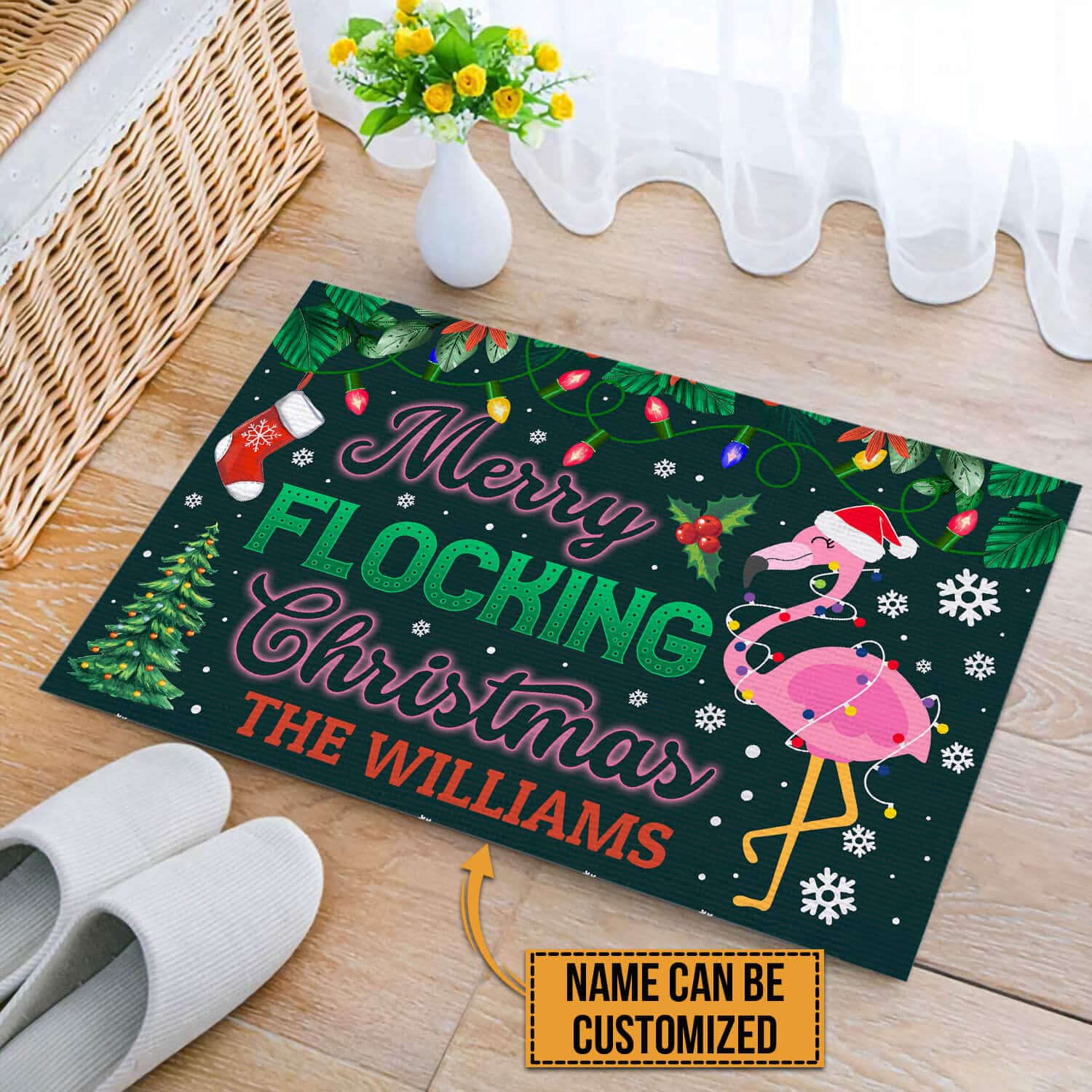 Let’s Shop Personalized Family Name Merry Flocking Christmas Pink Flamingo Doormat – Funny Merry Christmas Doormat!