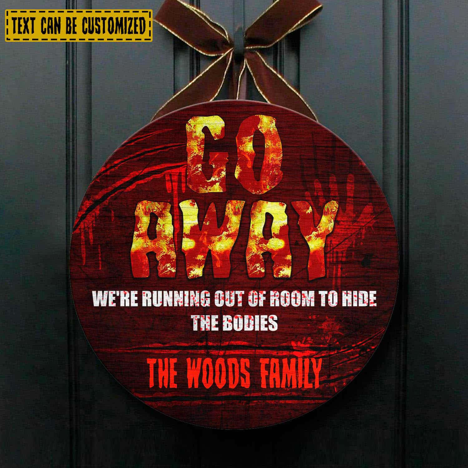 Let’s Shop Personalized Go Away We’re Running Out Of Room To Hide The Bodies Circle Wooden Door Sign – Front Porch Sign!