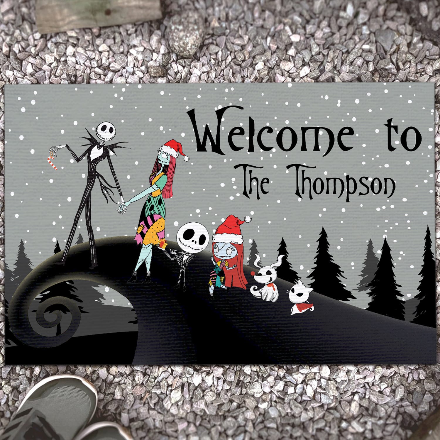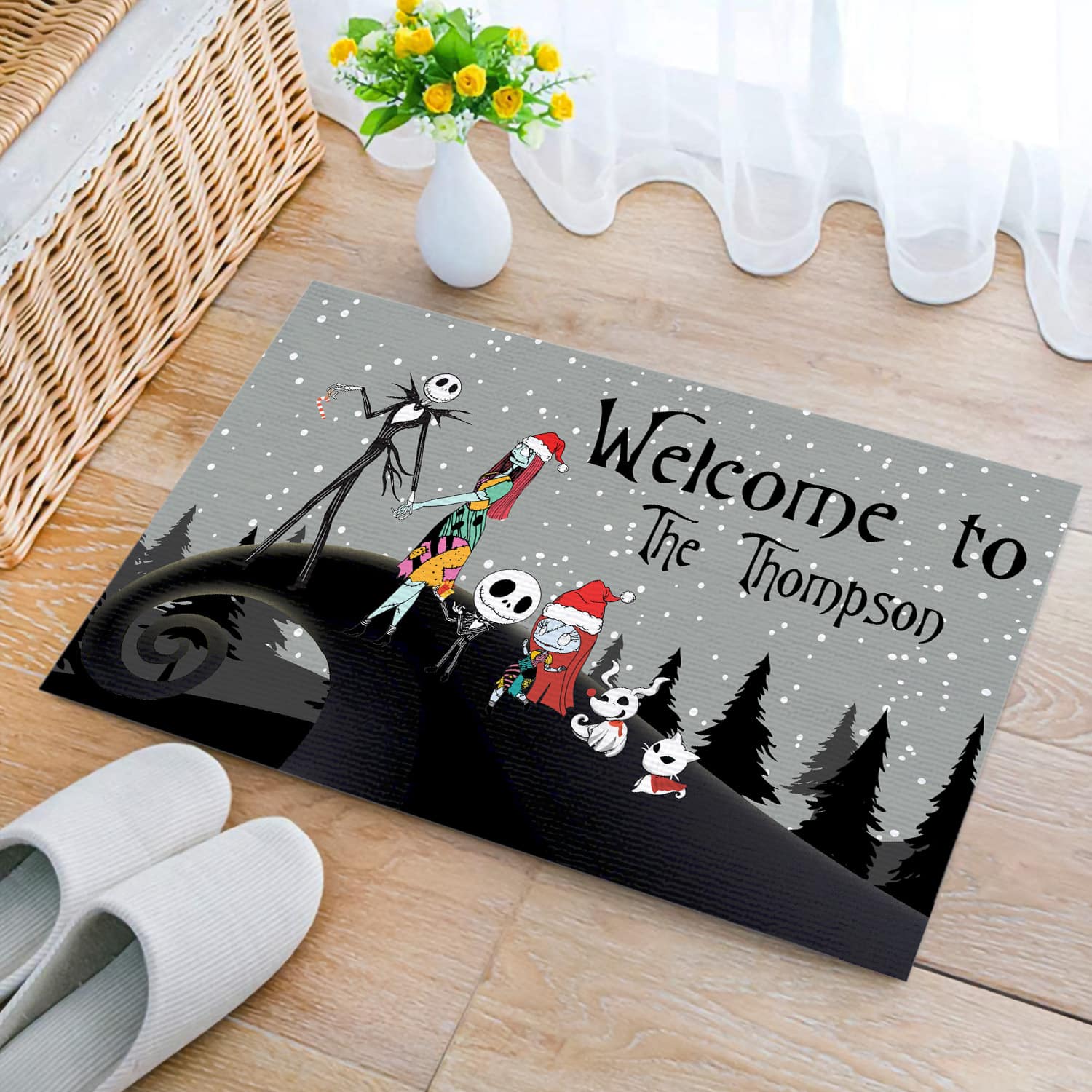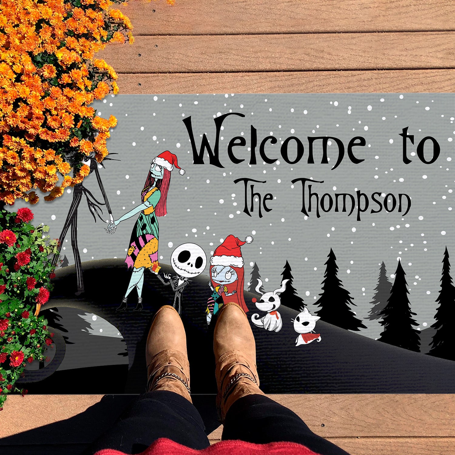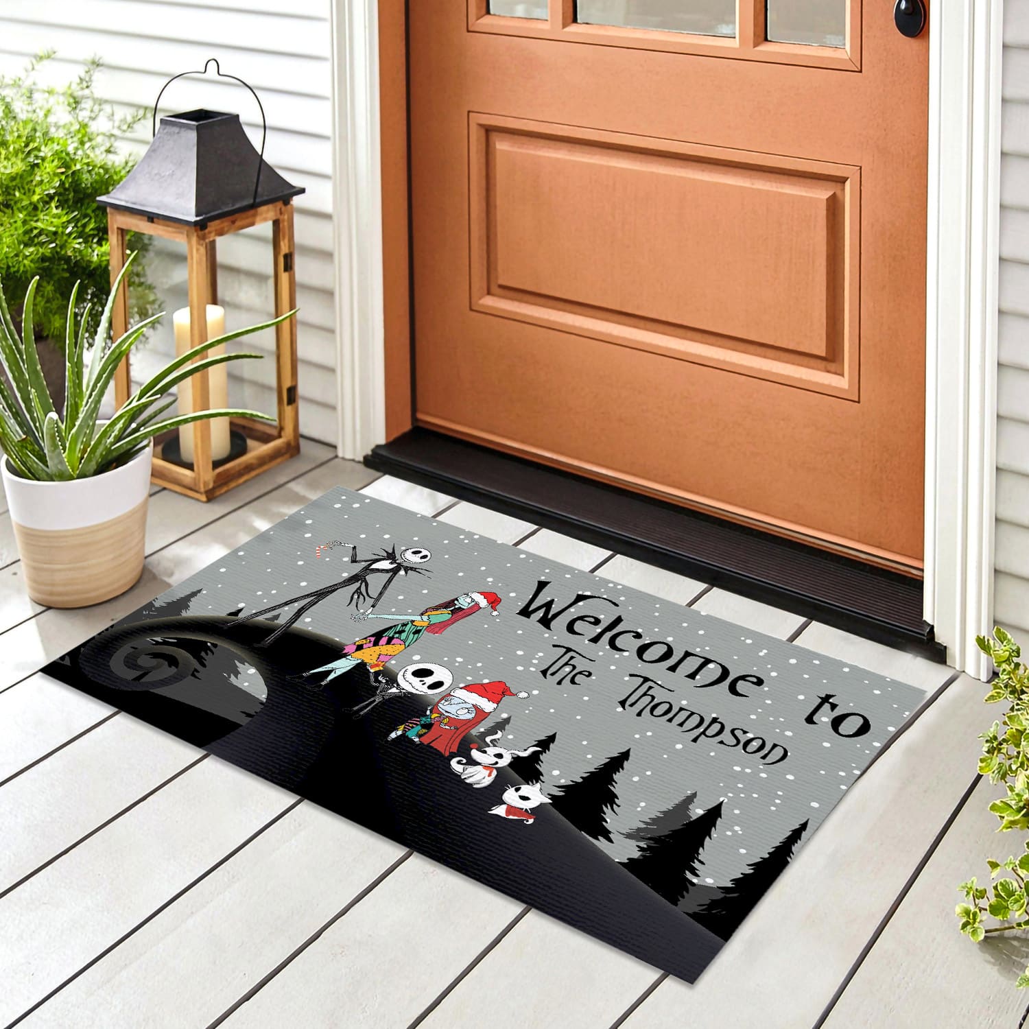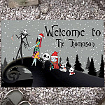 Let’s Shop Personalized Family Name Welcome to Nightmare Before Christmas Jack and Sally Indoor Outdoor Decorative Doormat!