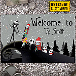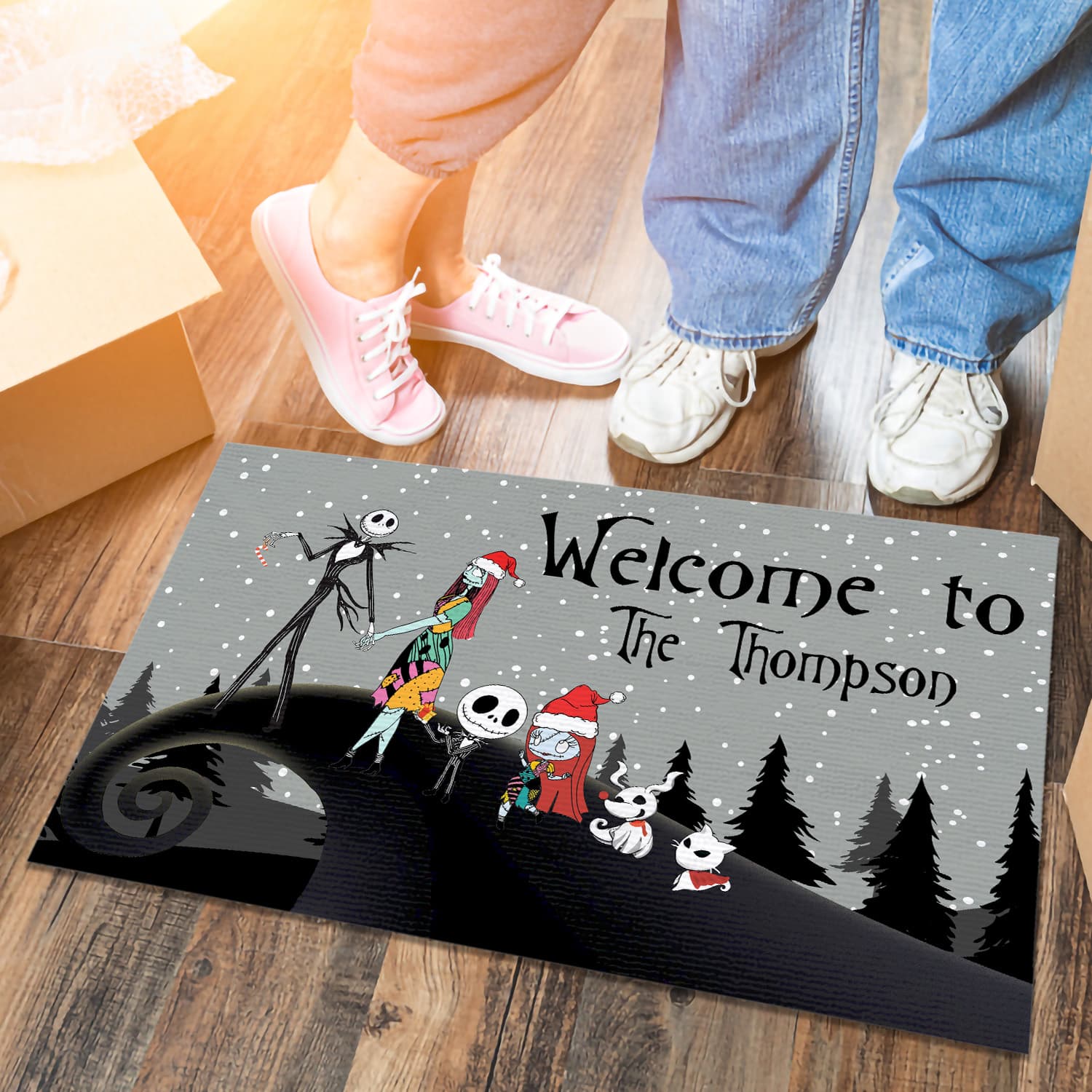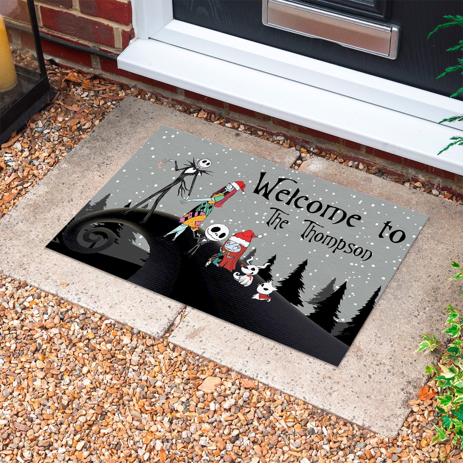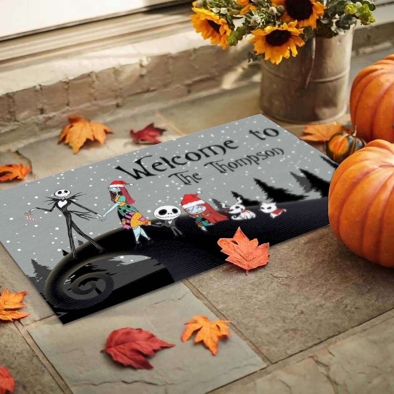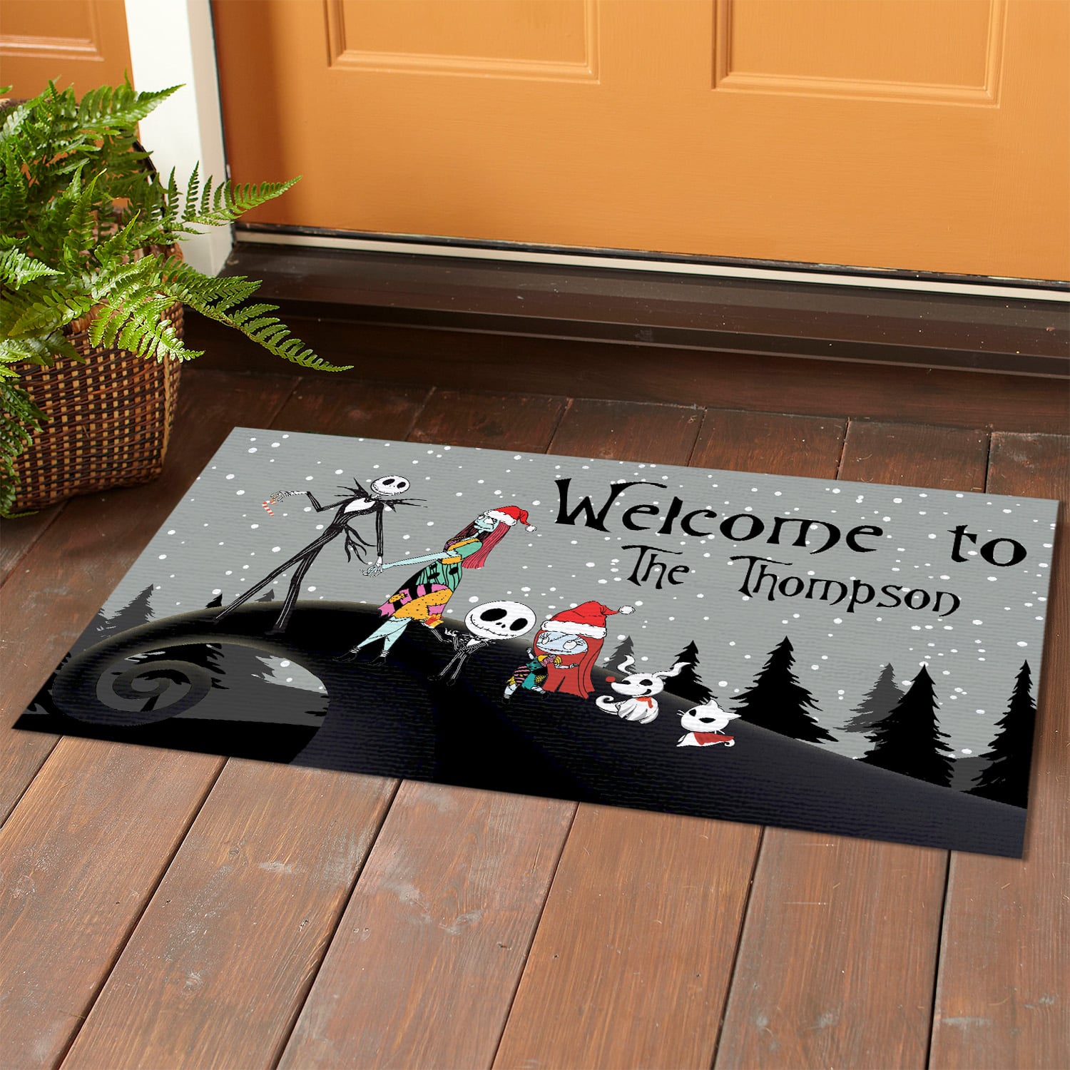 Let’s Shop Personalized Family Name Welcome to Nightmare Before Christmas Jack and Sally Indoor Outdoor Decorative Doormat!