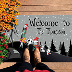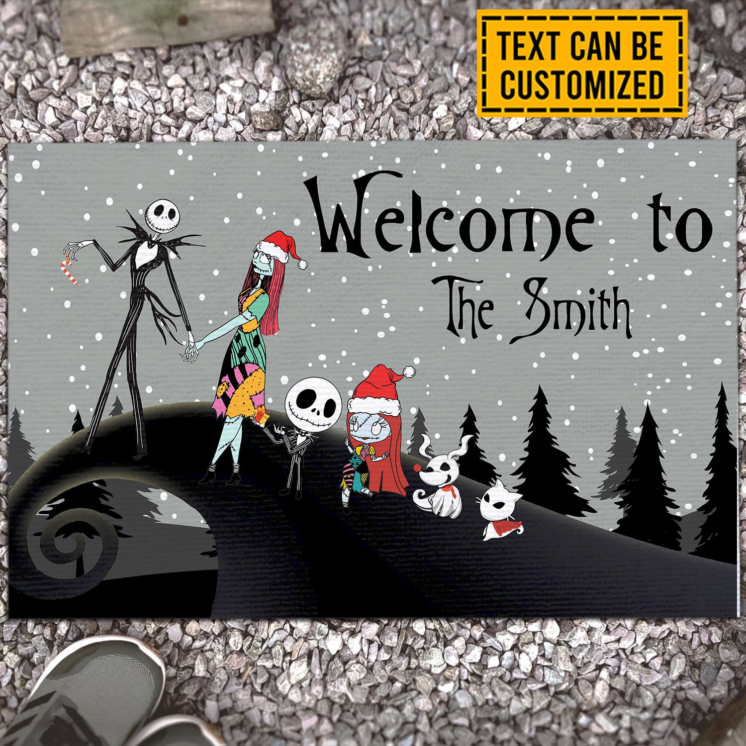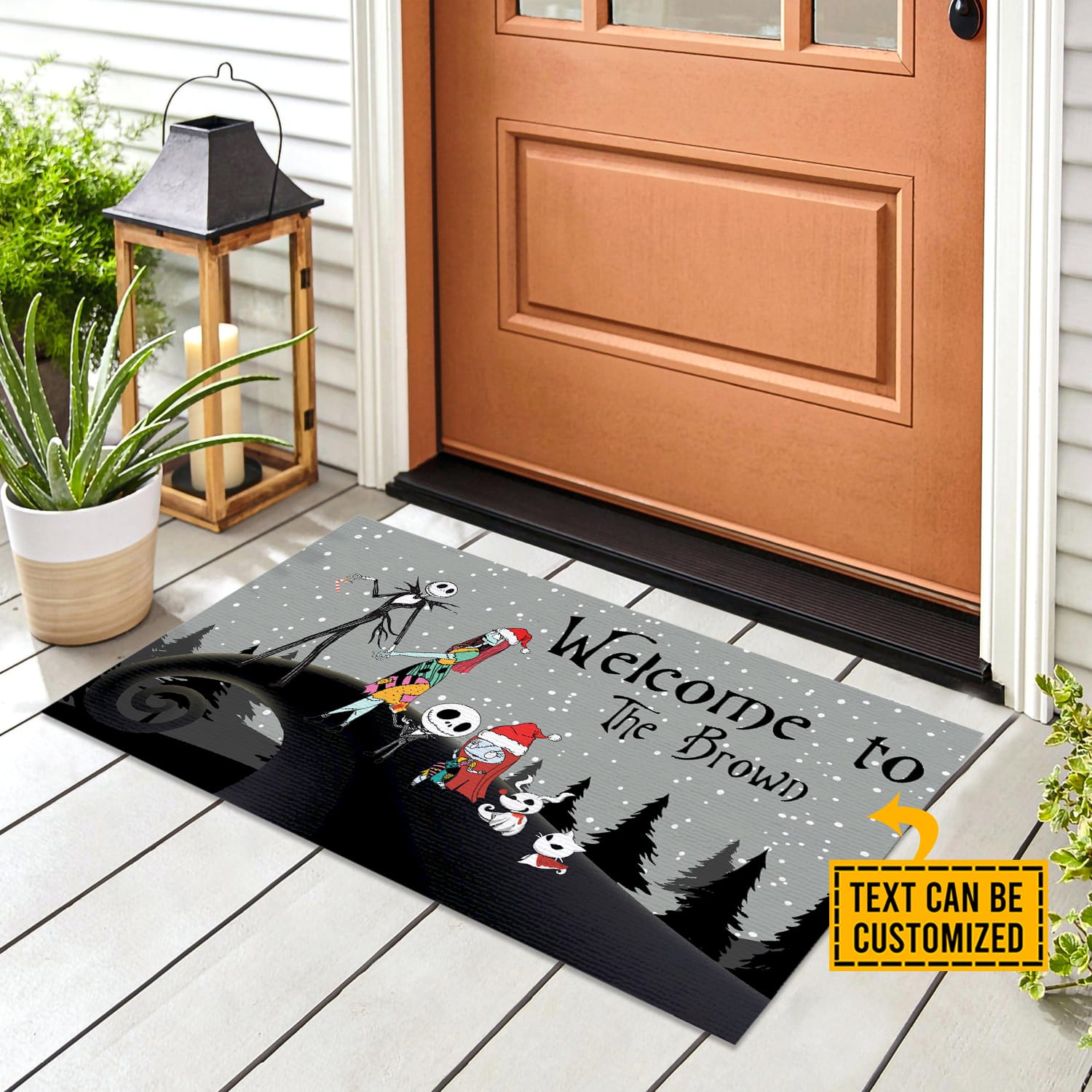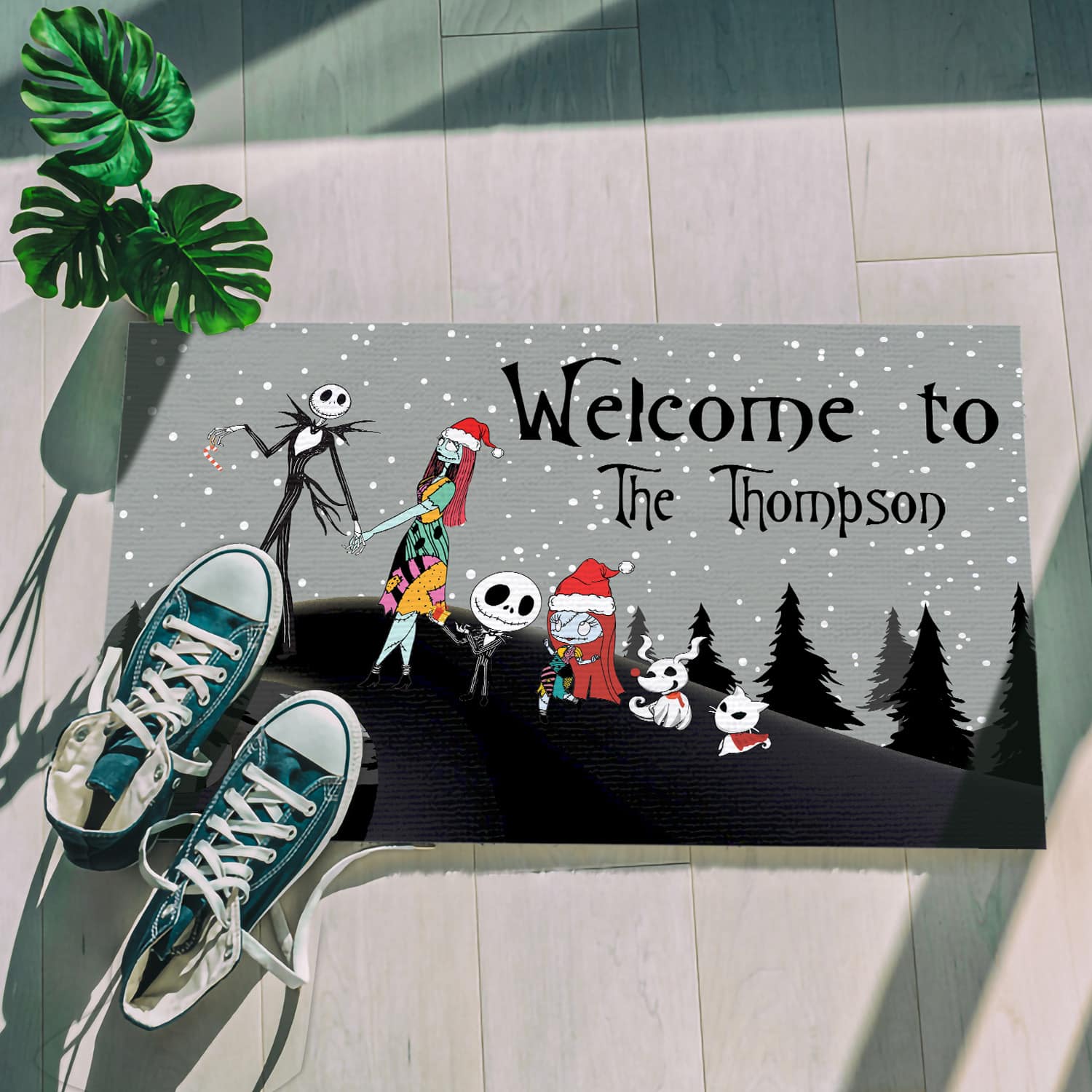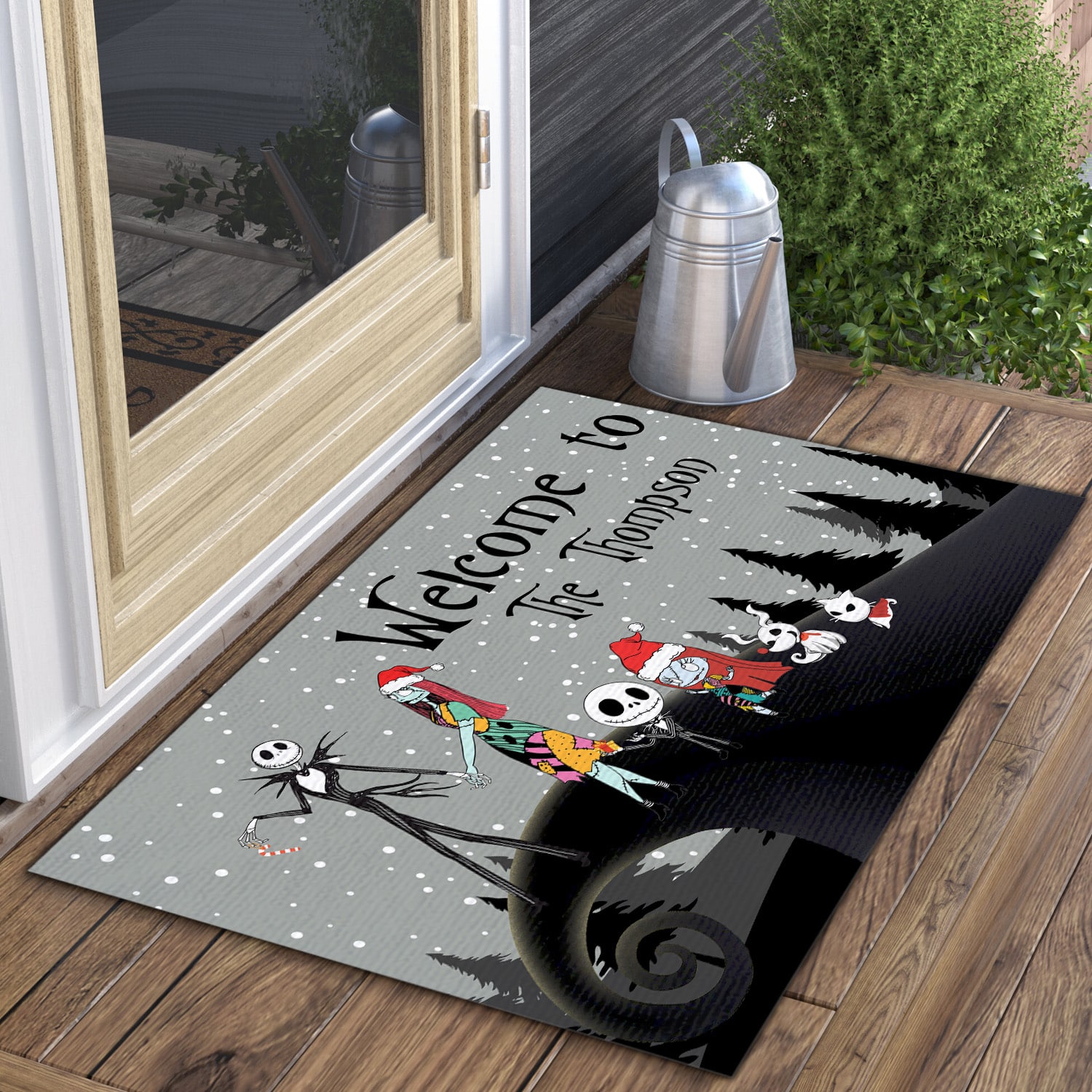 Let’s Shop Personalized Family Name Welcome to Nightmare Before Christmas Jack and Sally Indoor Outdoor Decorative Doormat!