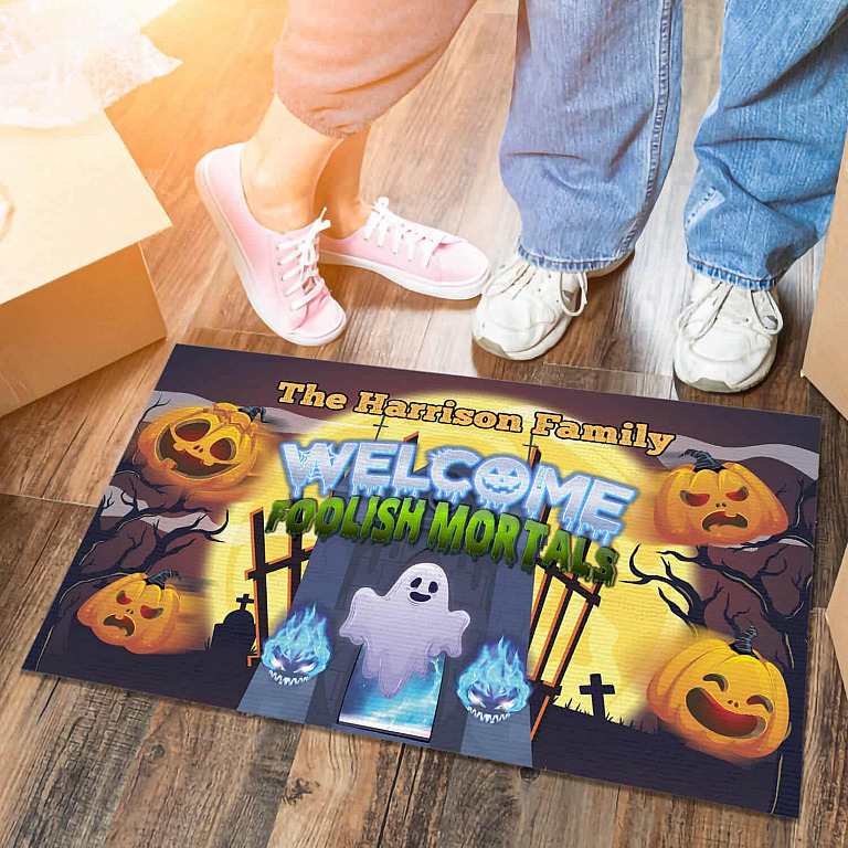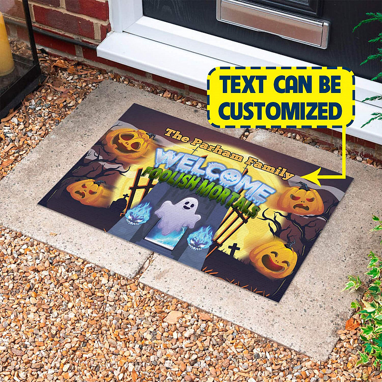 Let’s Shop Personalized Welcome Foolish Mortals Doormat – Halloween Ghost Pumpkin Welcome Mat!