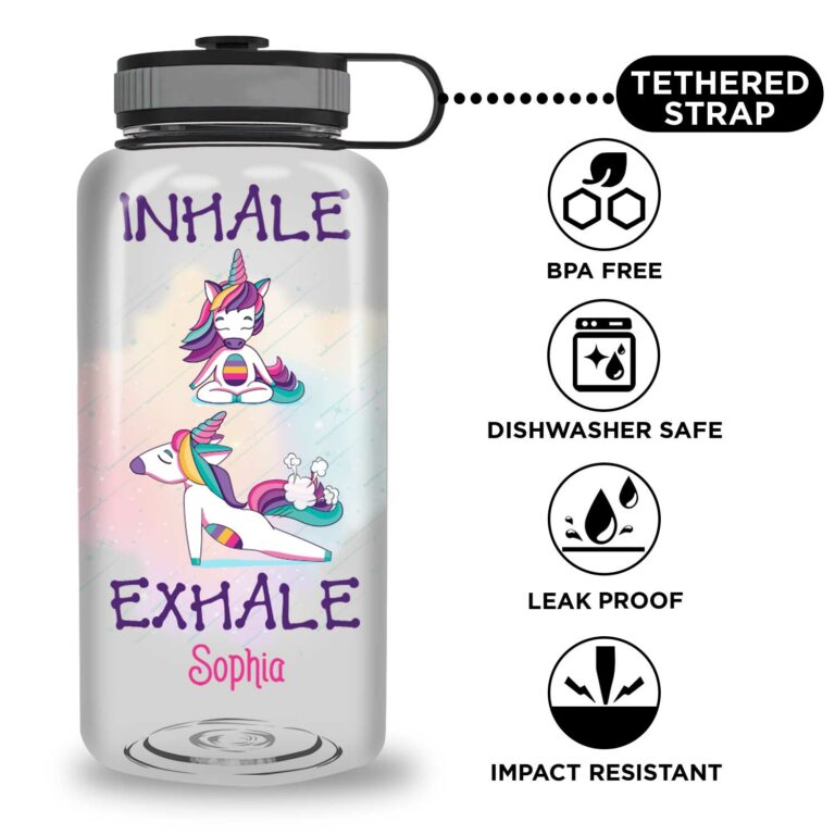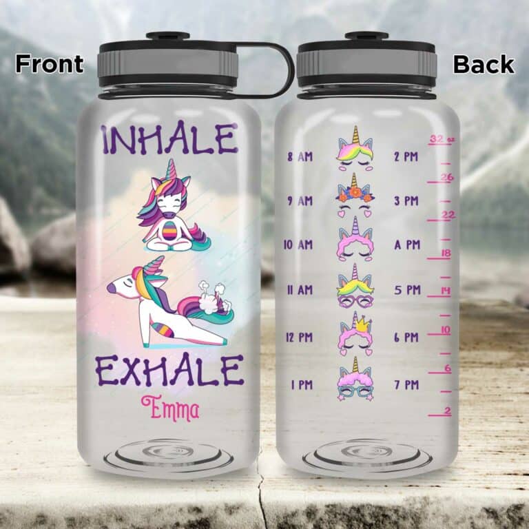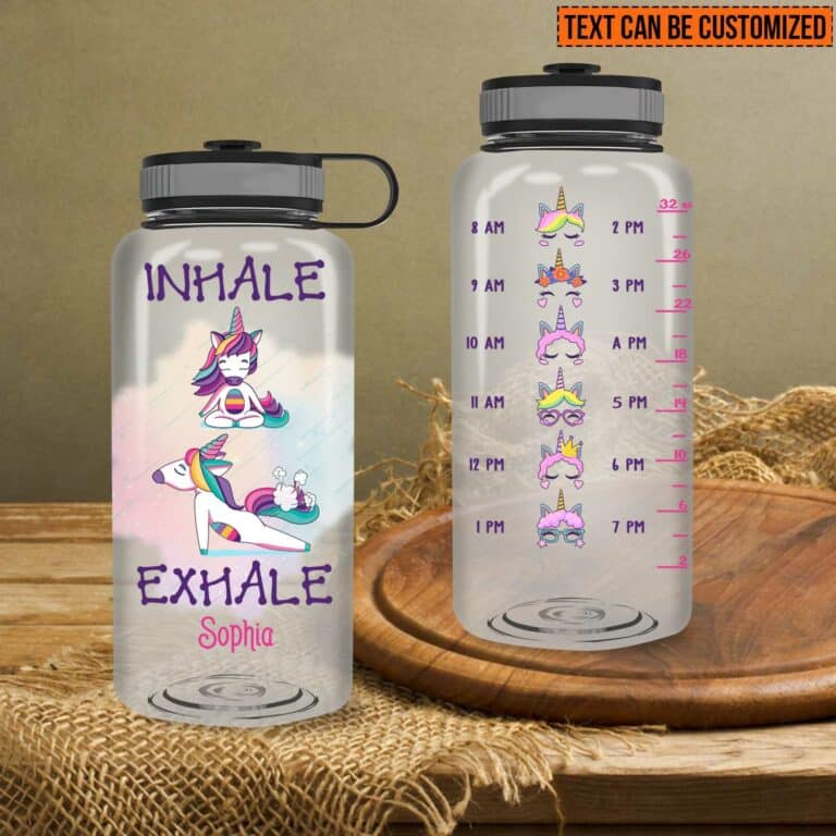 Let’s Shop Personalized Inhale Exhale Funny Unicorn Yoga Water Bottle With Time Marker, Motivational Fitness Sports Water Tracker Bottle!
