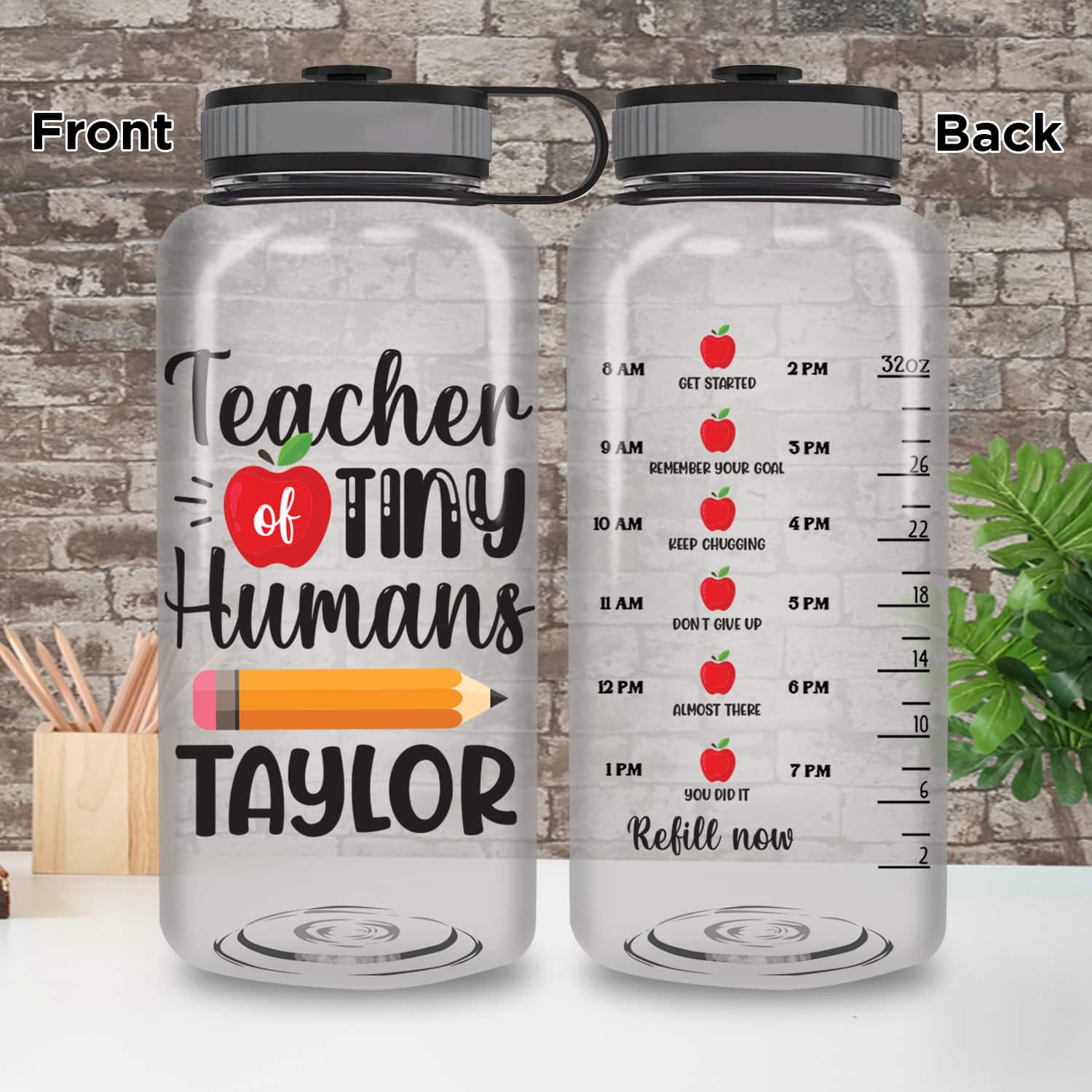 Let’s Shop Personalized Kindergarten Teacher Of Tiny Humans Motivational Fitness Sports Water Tracker Bottle with Time Marker!