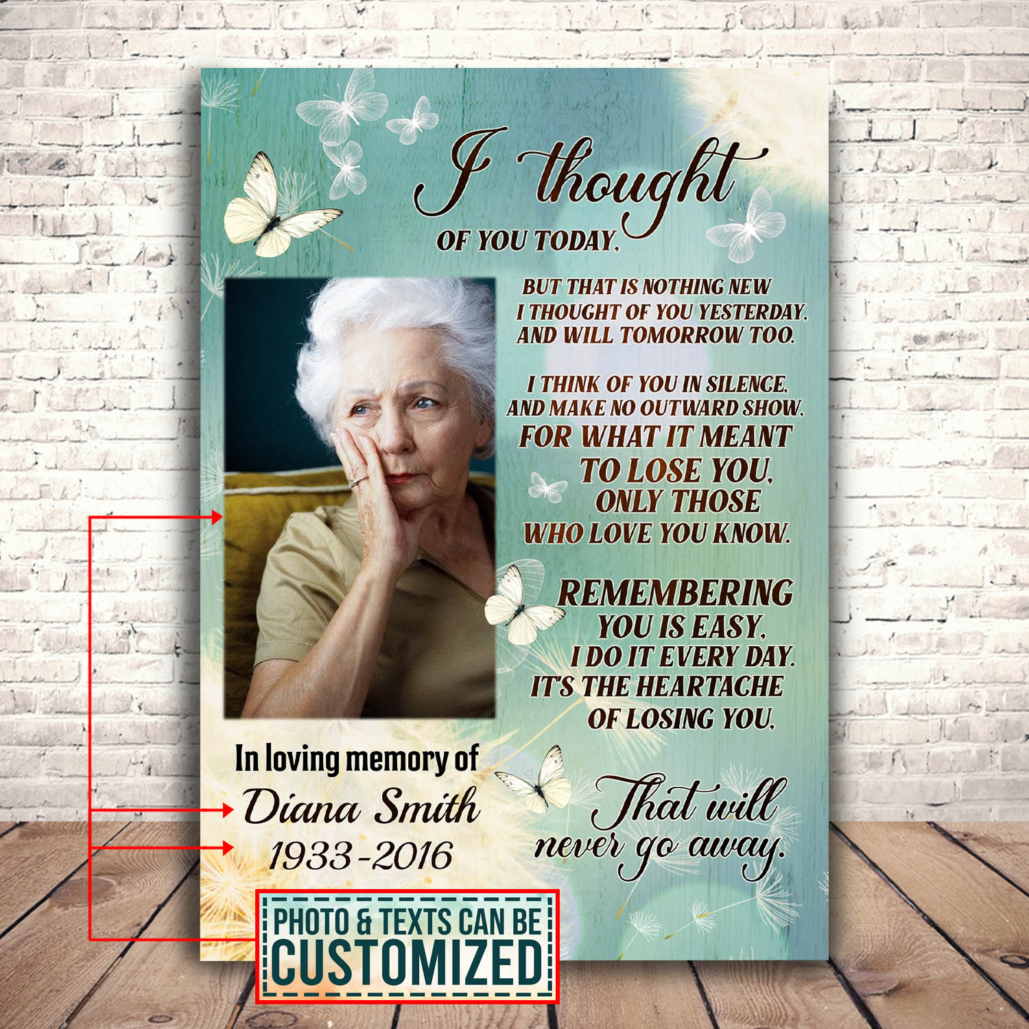 Are you spending too much time to find creative merchandise for you or suitable & special gifts for your mommy, your daddy, your son, your daughter, your children, your friends or someone you love? The struggle is over because we have various I Thought of You Today Picture Frame, I Thought of You Today but That Is Nothing New Picture Frame, Memorial Photo Canvas, Memorial Photo Poster for Funeral, Memorial Photo Poster, Memorial Canvas Personalized, Personalized Memorial Canvas Art Wall Decor, Memorial Personalized Wall Decor, Memory Wall Decor with Photo Frame, in Loving Memory Photo Canvas which will make perfect presents for your beloveds. In order to make your present stand out, we have created lots of unique and awesome customized photo gifts & personalized designs.