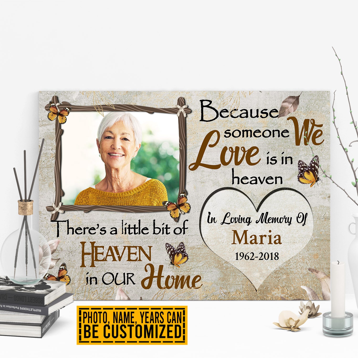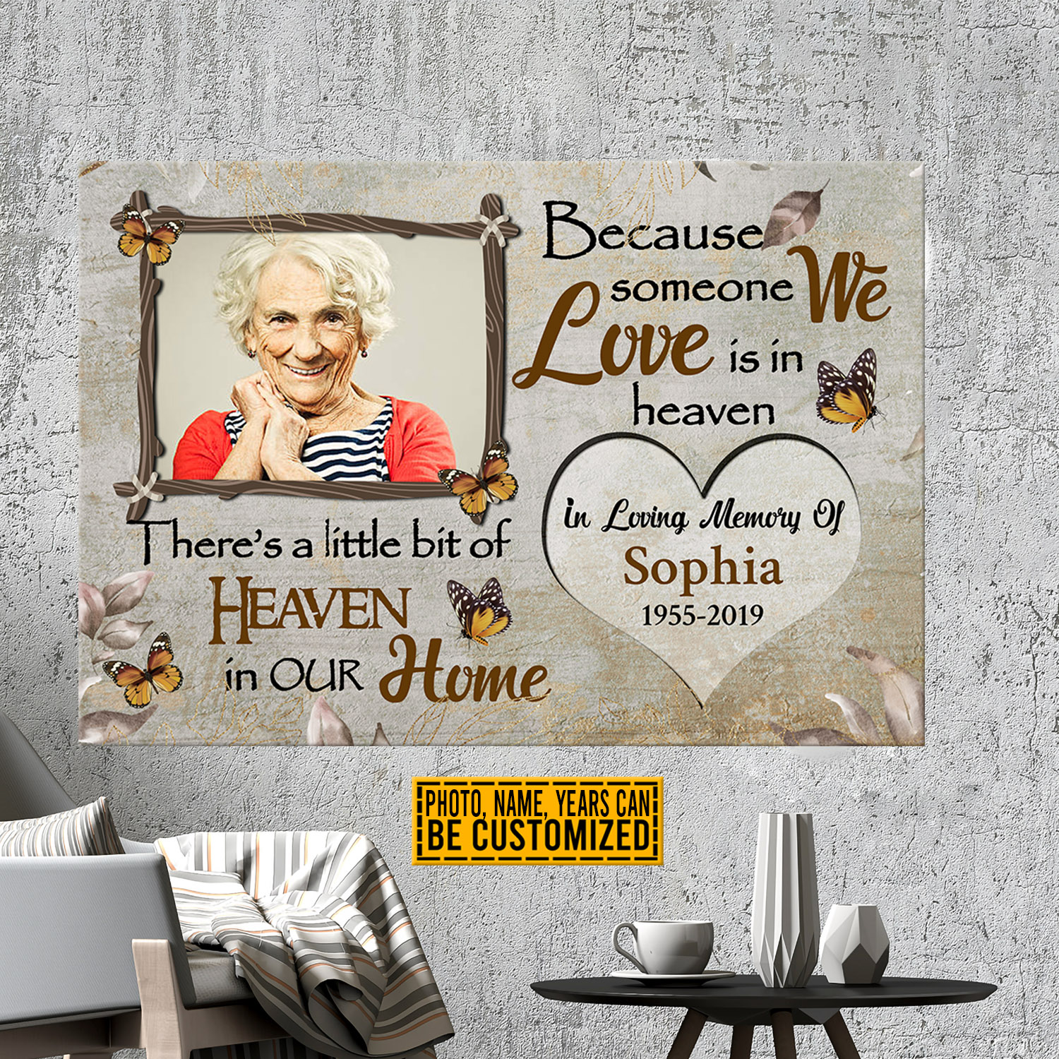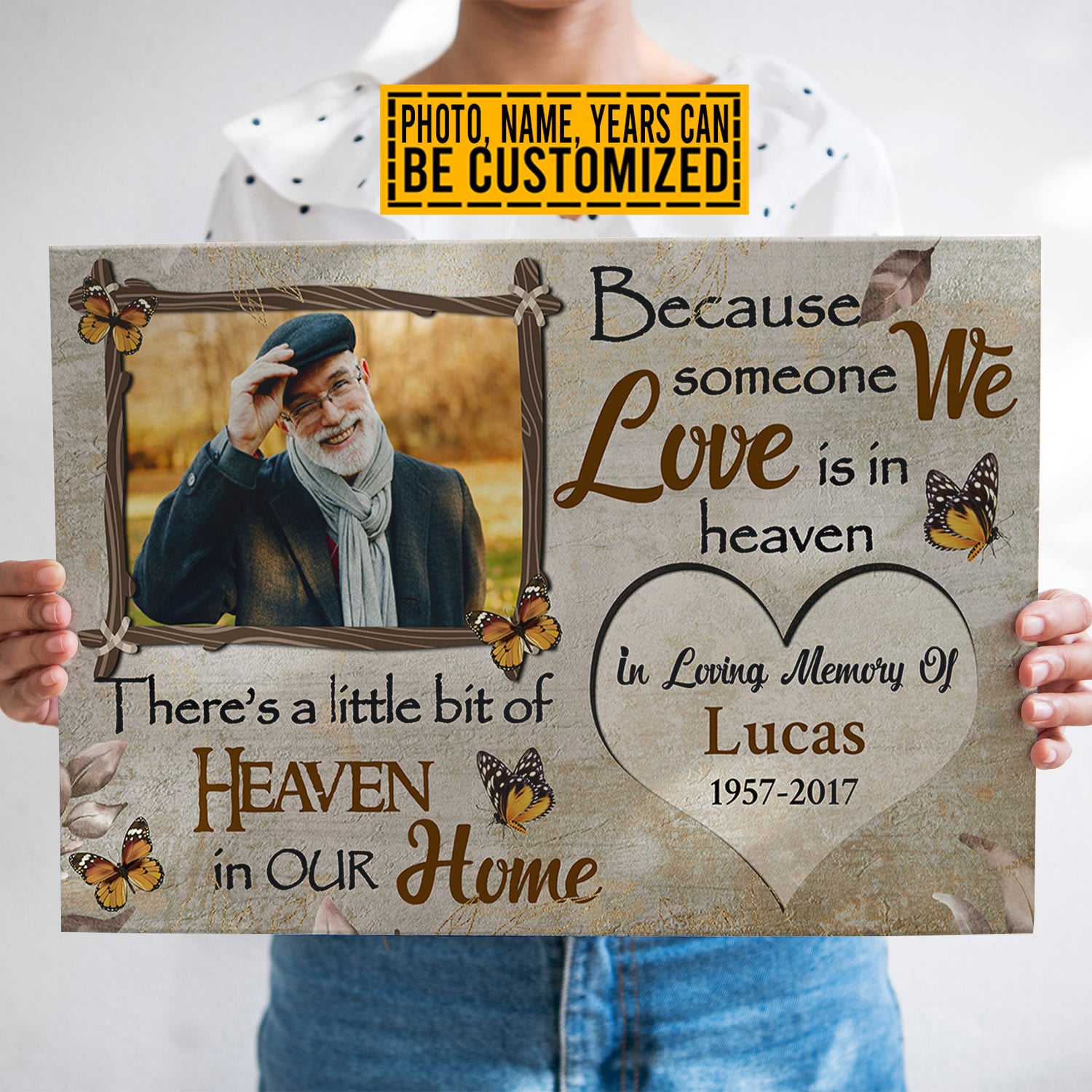 Let’s Shop Personalized Photo Because Someone We Love Is In Heaven Butterfly Memorial Framed Canvas Prints – Unframed Poster!